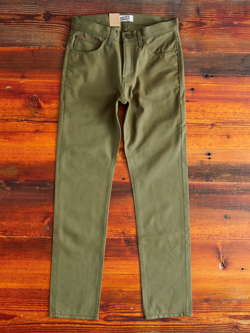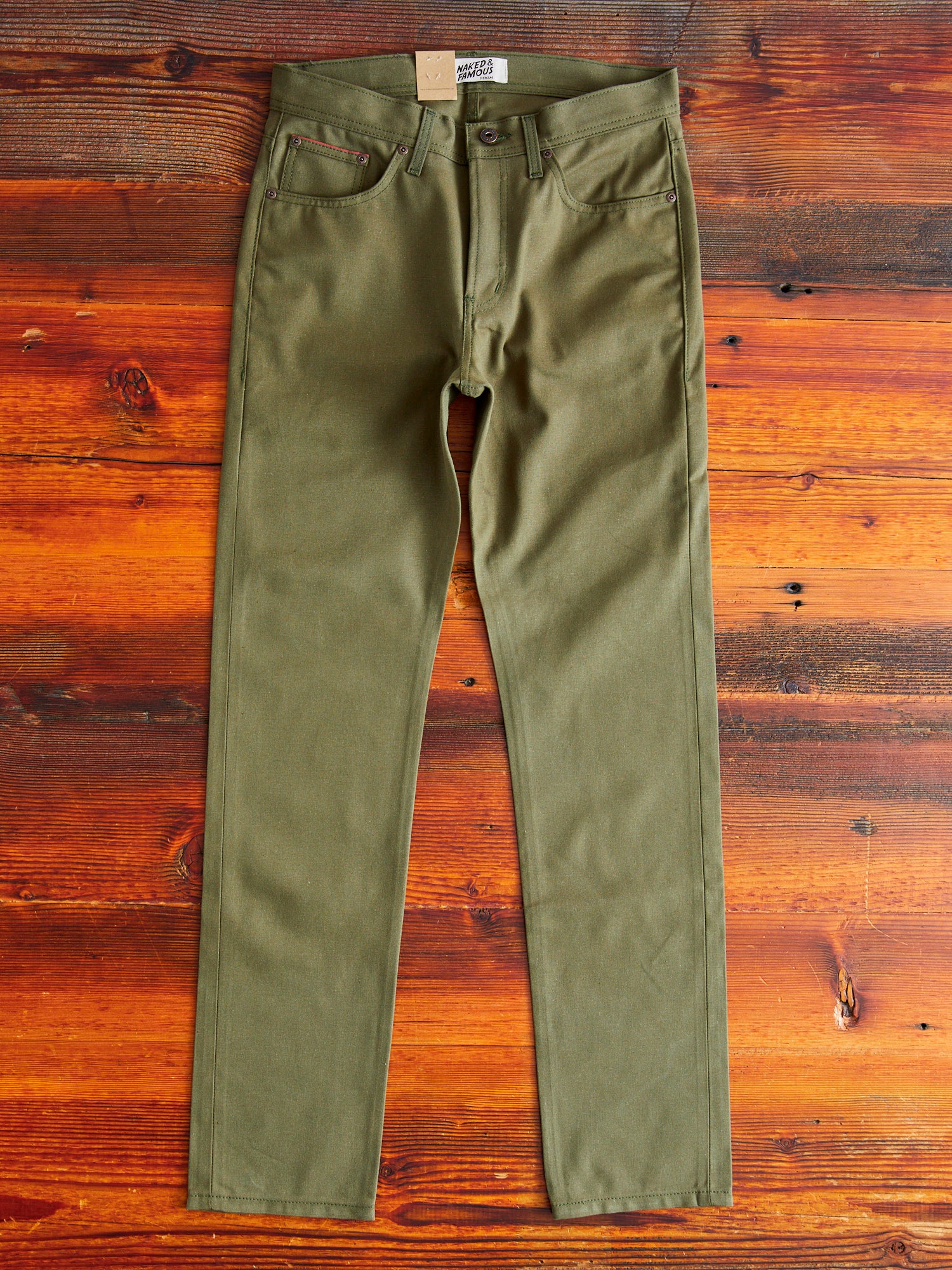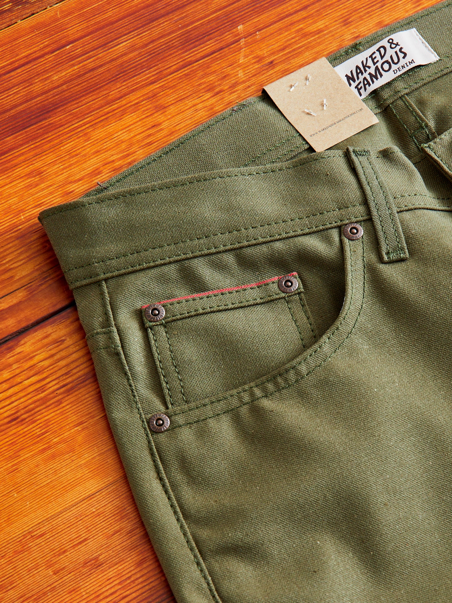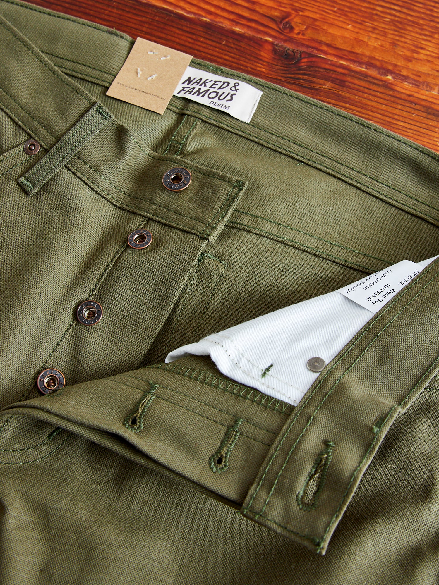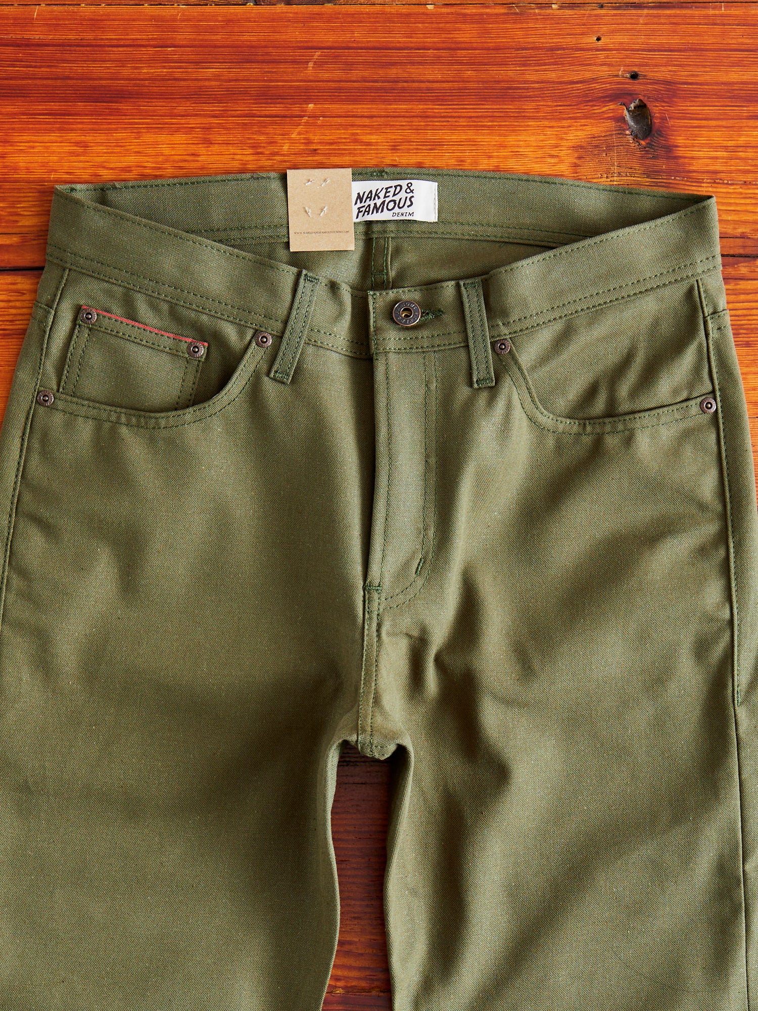 • The Selvedge Army Green Duck Canvas from Naked & Famous uses a lightweight 10oz fabric made from a vintage green color. The canvas fabric is smooth and durable, and will continue to develop a more vintage look with wear.
