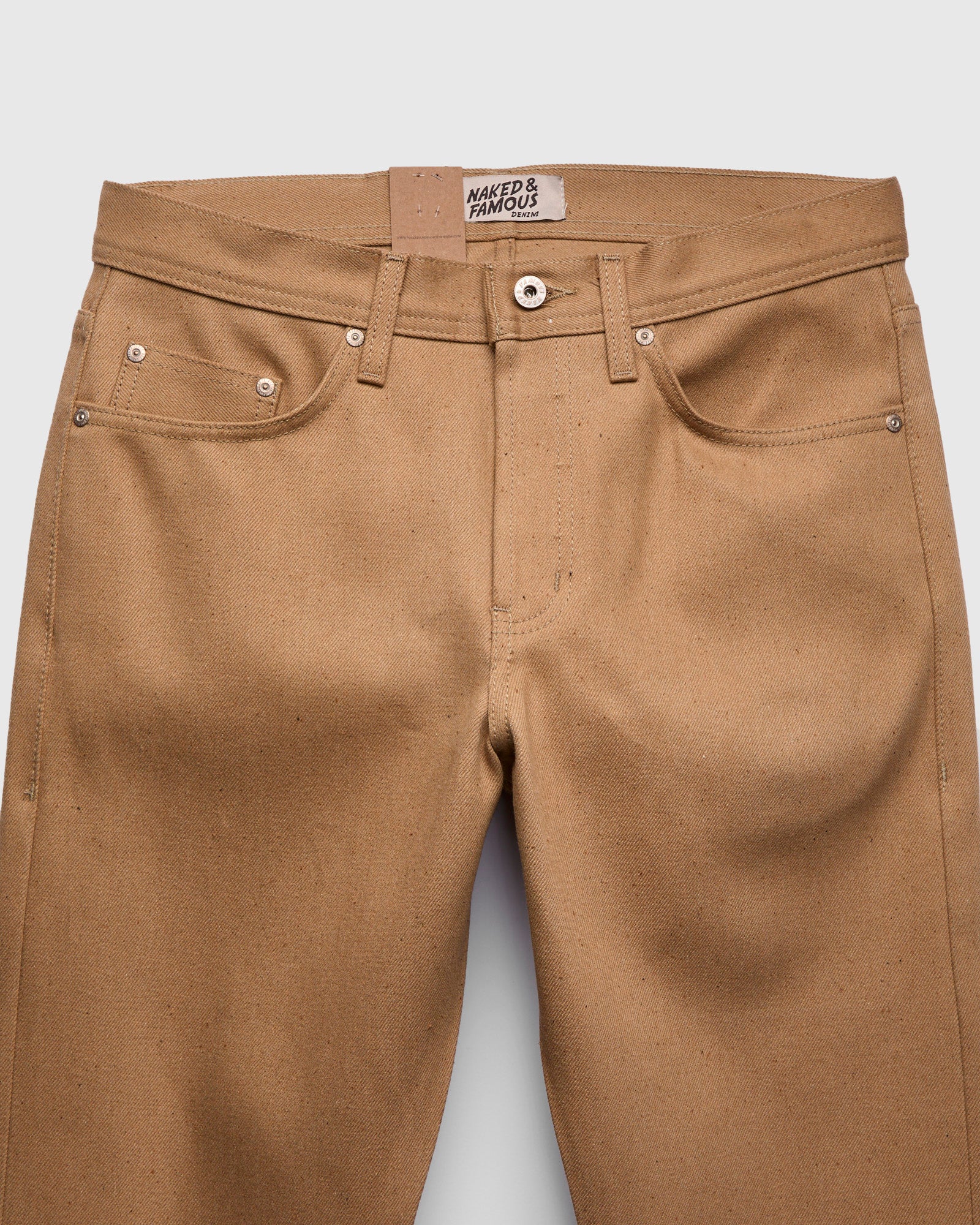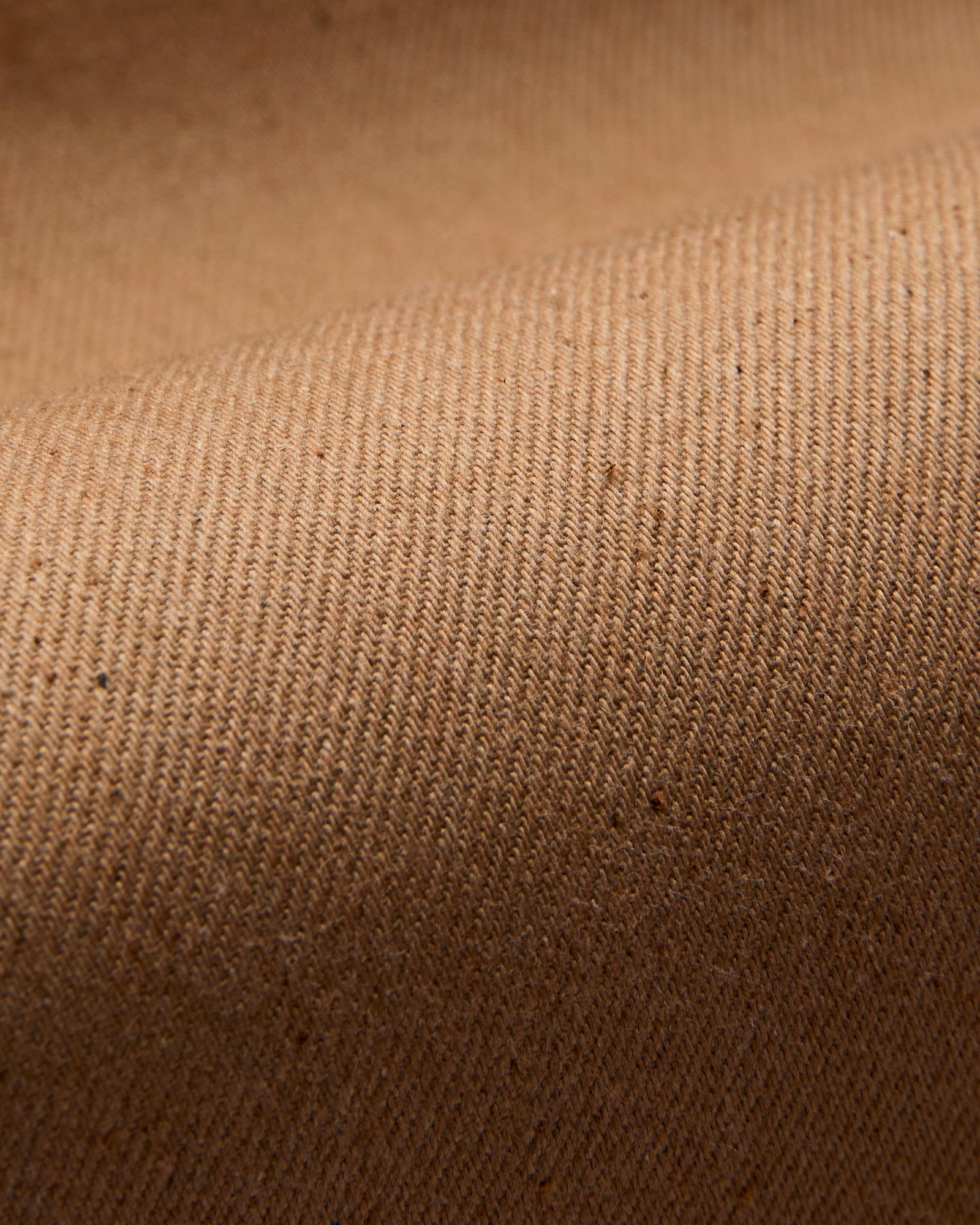 • The Brown Fox Selvedge Denim from Naked & Famous is a 13oz Japanese selvedge denim made entirely from organic FoxFibre® cotton. Free of dyes and bleach treatments, the denim showcases the natural color of the cotton, producing an earthy brown tone with subtle nep variation throughout. The cotton is grown in California, the yarns spun in Osaka, and the fabric woven in Okayama. Finished with a brown selvedge ID, leather patch, and custom Naked & Famous hardware.