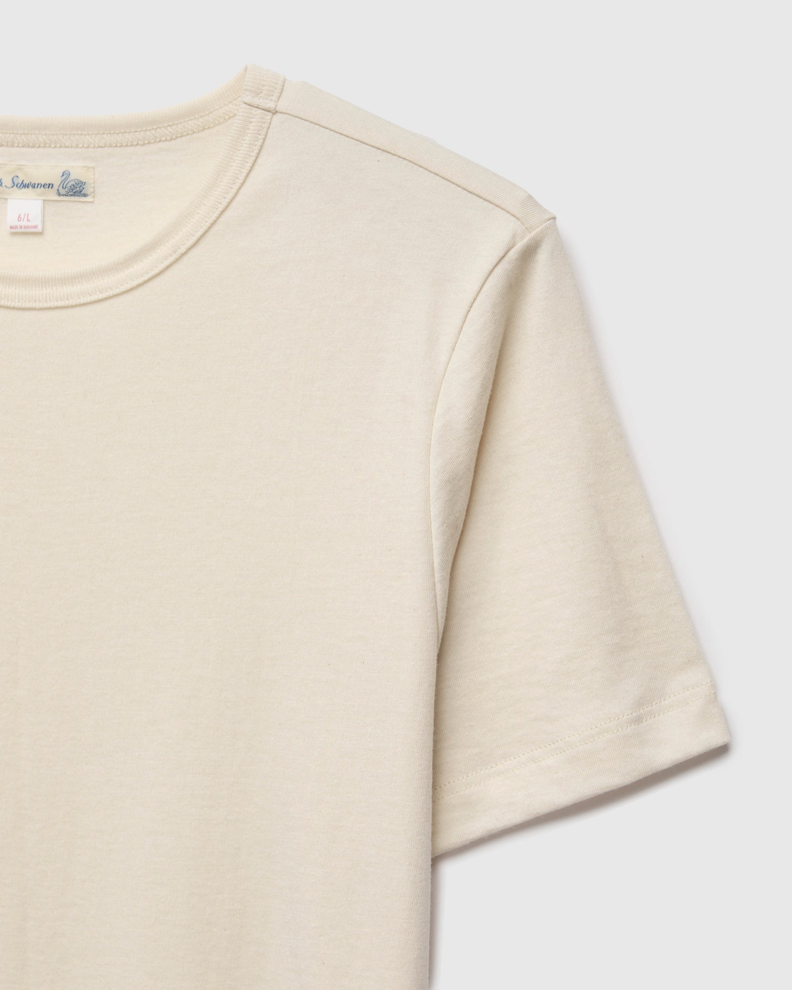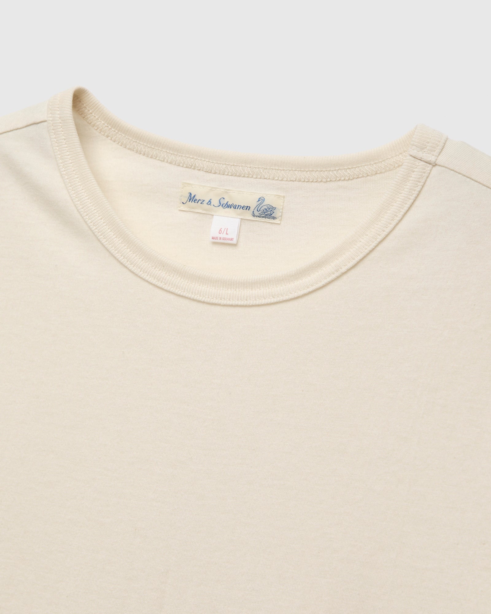 • The 1950s T-Shirt from Merz b. Schwanen is crafted on original German loopwheel machines from the turn of the century. Made with soft organic cotton, the tubular knit utilizes a time and labor-intensive knitting process yielding exceptionally soft and flexible fabrics. The lightweight tee is cut in a regular fit with classic detailing, making it an easy-to-wear, comfortable everyday staple. It is recommended to take one size up to account for shrinkage.