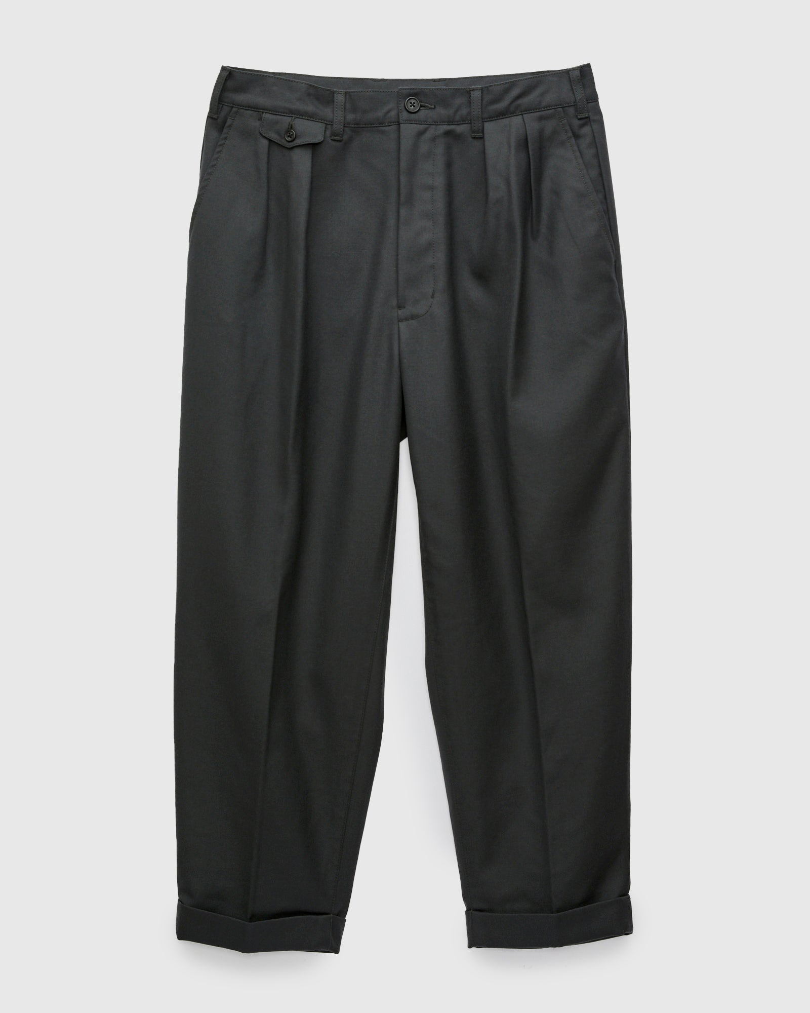 • The 2-Pleat Trousers from Beams are pleated slant-pocket trousers, cut in a relaxed tapered cut inspired by 1950s suiting. This iteration features a wool twill fabric woven, dyed, and treated in Oshu, Japan, a region known for its wool production. The fabric has been treated with a finish allowing for laundering. Cut with a slightly cropped hem, the pants are finished with slant pockets at the waist and welt pockets at the rear.