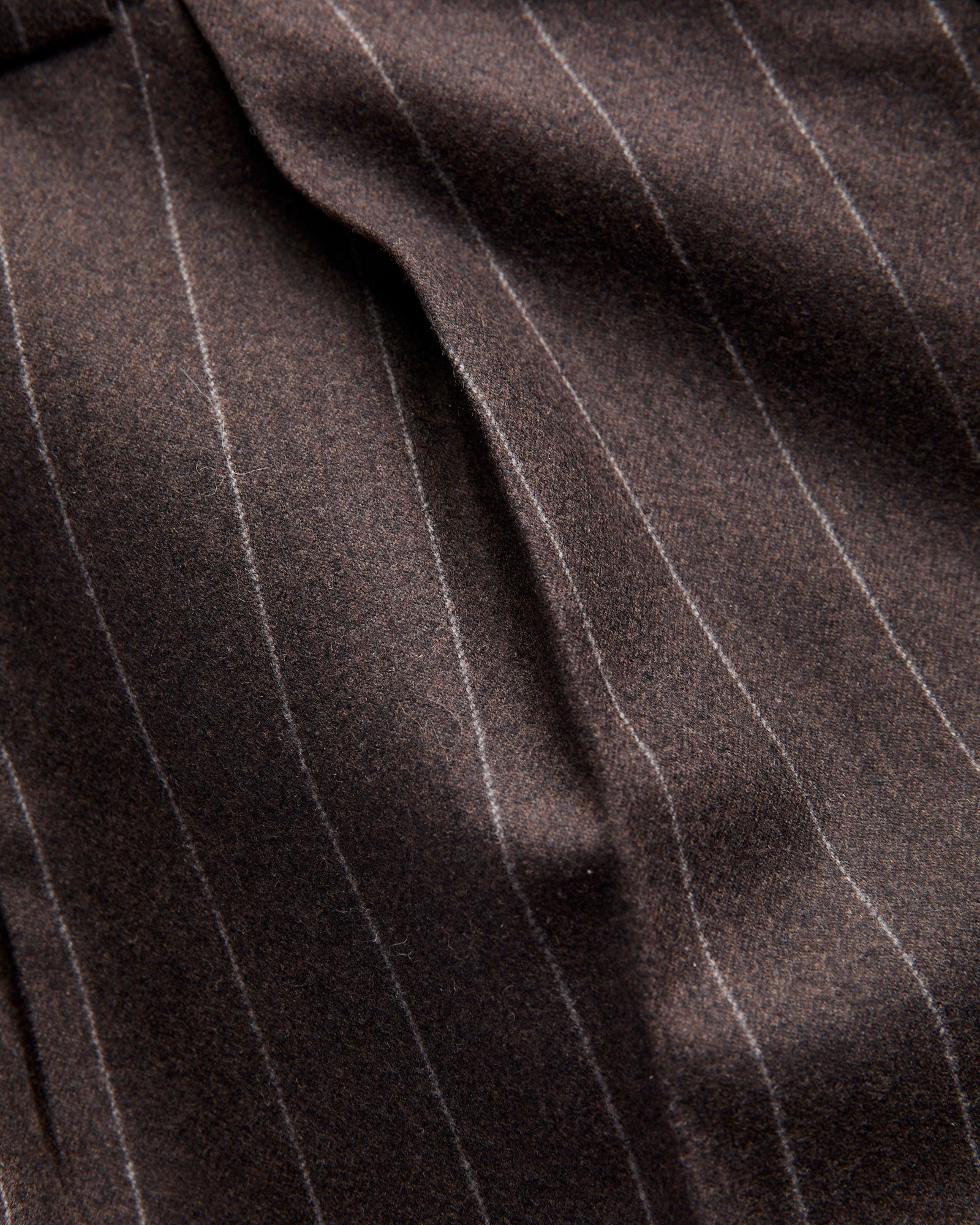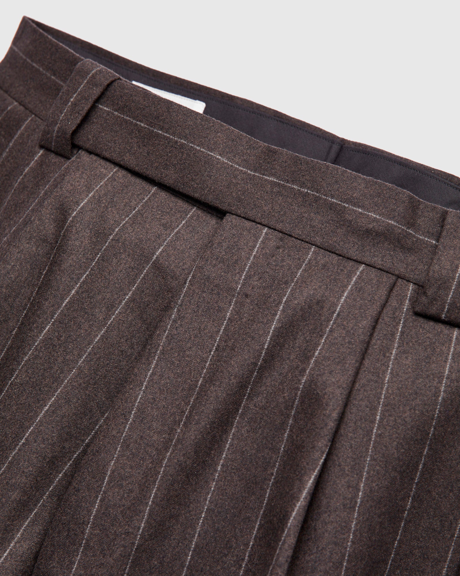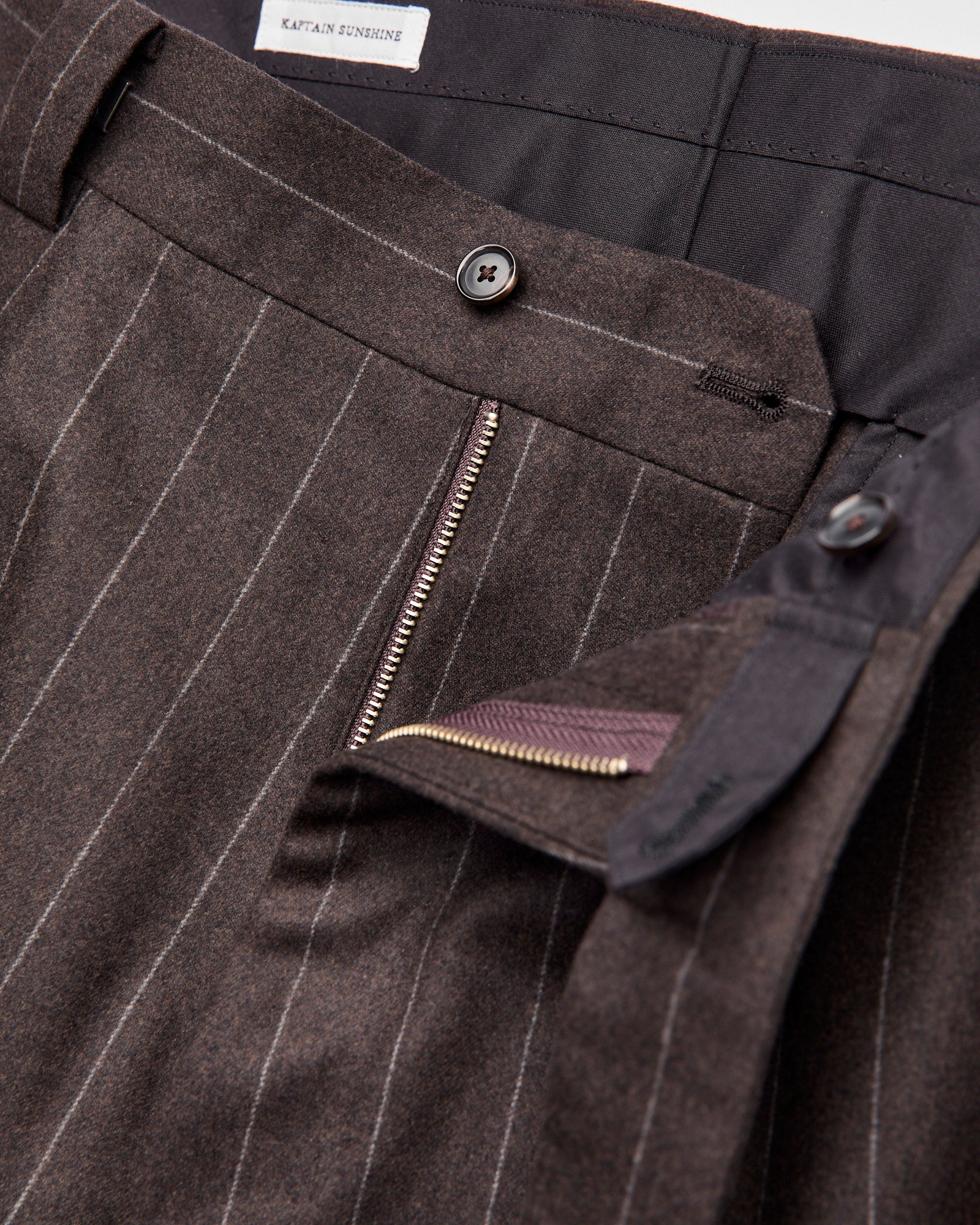 • The 2-Pleat Trouser from Kaptain Sunshine is cut with the brand’s relaxed, soft-tailored approach. Made from a lightweight merino wool flannel woven with contrasting stripes, the fabric has a smooth, soft texture and an easy drape. Designed with a high rise and straight leg, the trousers feature a cupro half-lining, tucked belt loops, and two front pleats.
