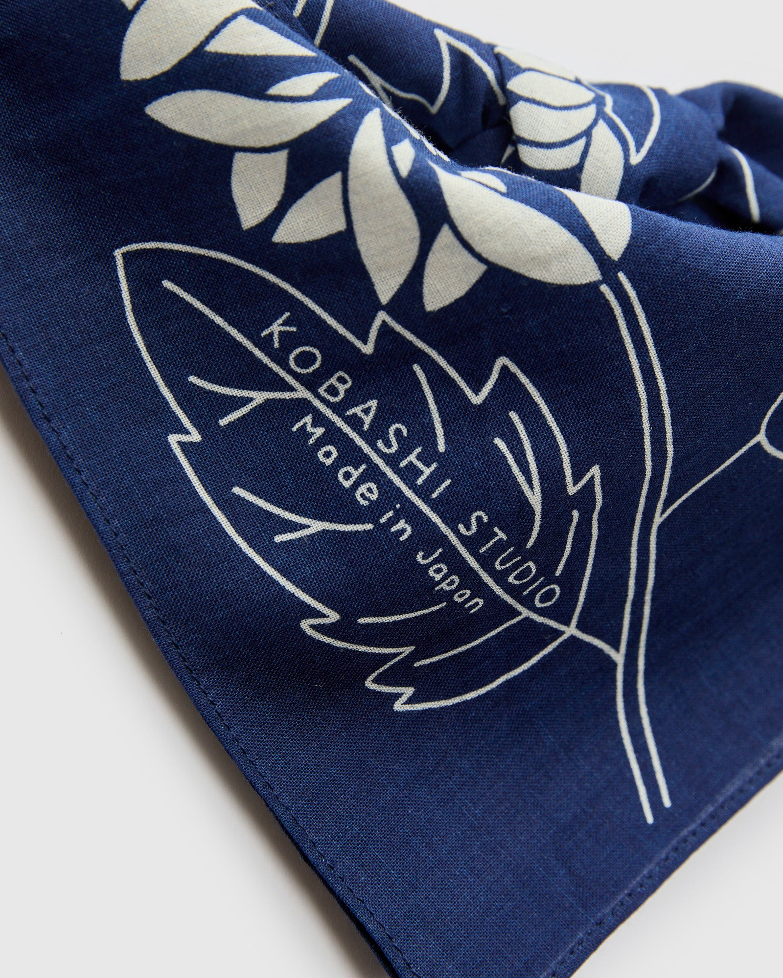 • This Bandana from Kobashi Studio is crafted in Japan from Banshu-ori, a traditional woven fabric from Hyogo, Japan with over 230 years of history. Woven from 100% cotton, it is softer and more absorbent than typical bandana cloth, offering a unique texture and comfort. The floral pattern is created using a traditional discharge dyeing method, where color is carefully removed by hand with a stencil. Both the discharge dyeing and sewing are done by a family-run textile workshop in Tochigi, established in 1886.