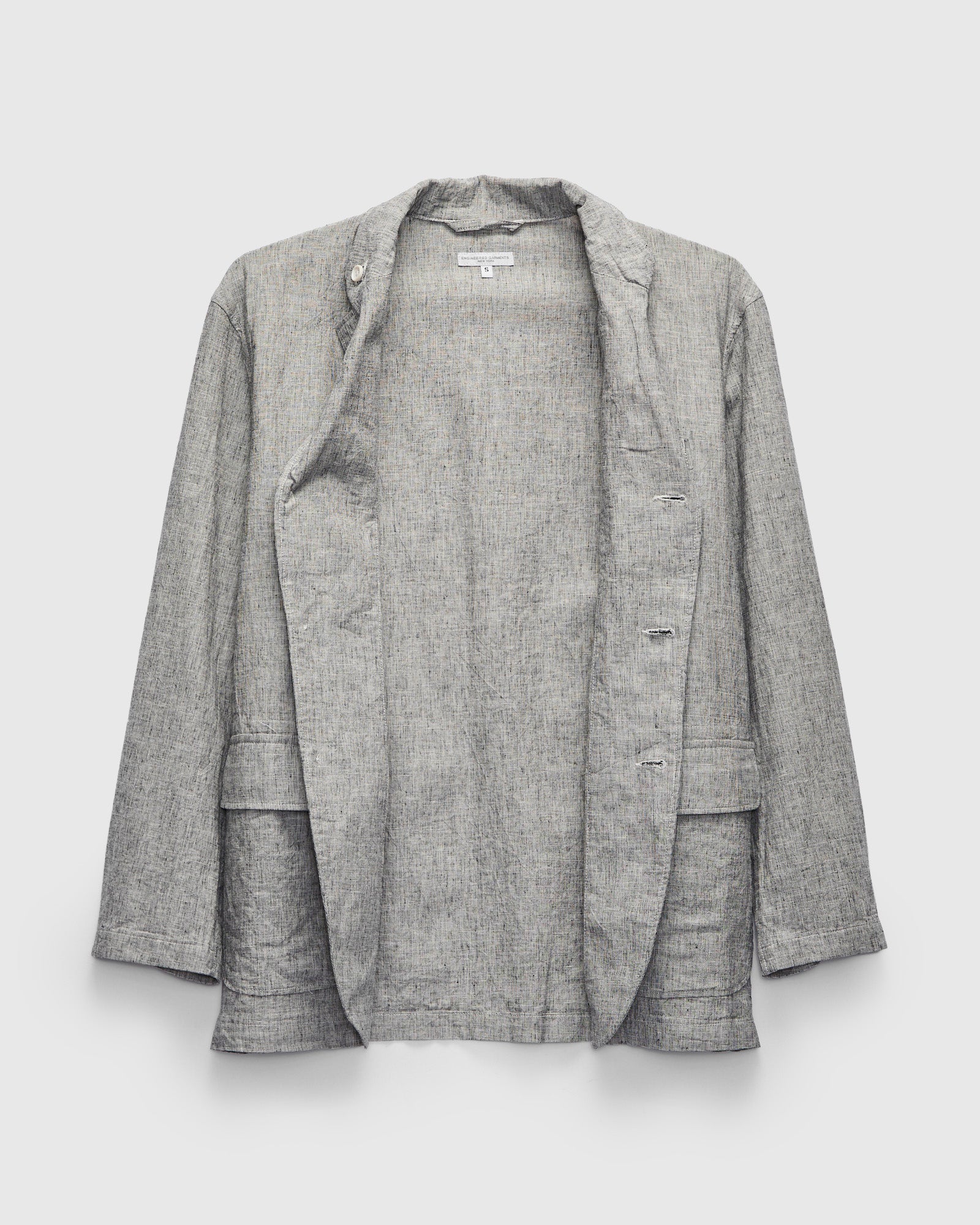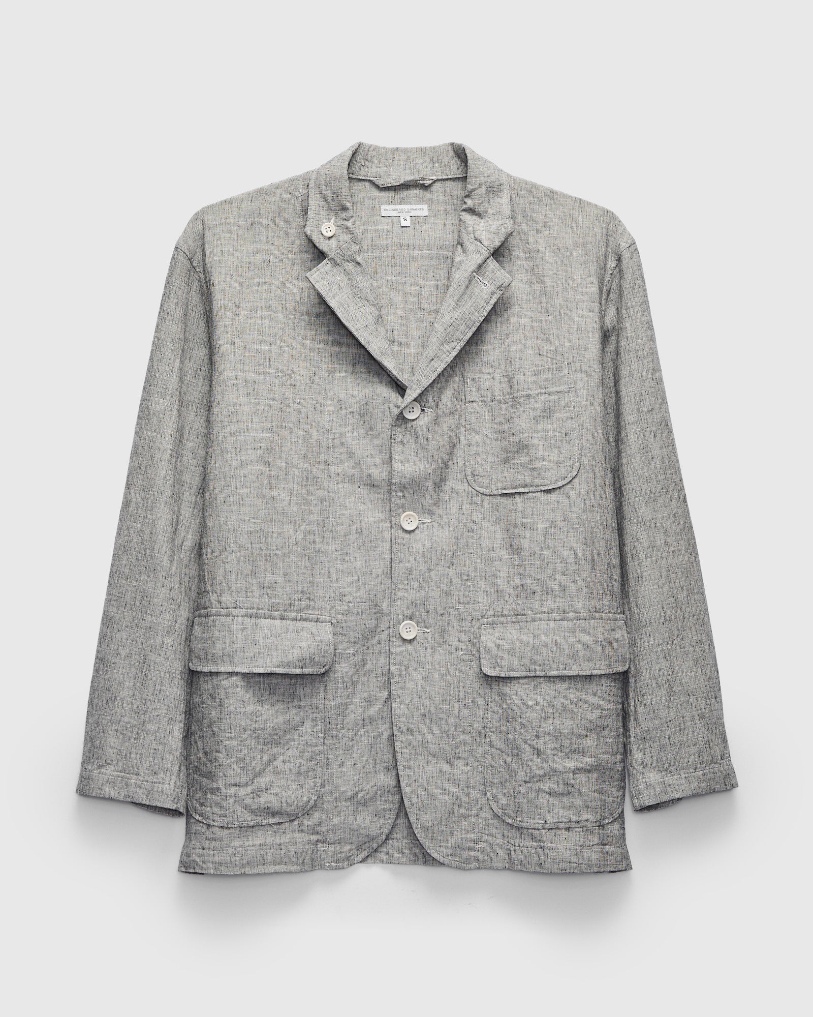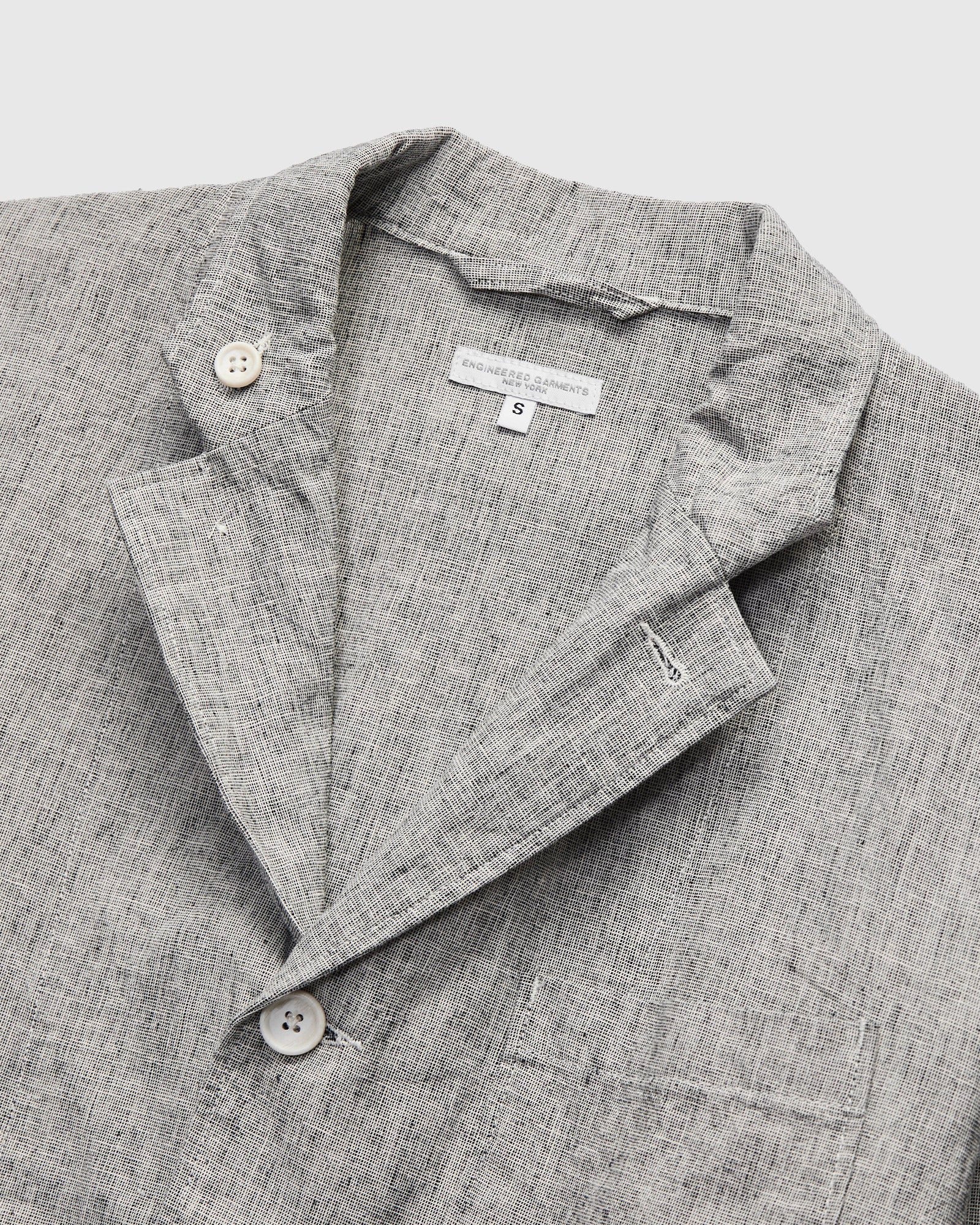 • The Loiter Jacket is Engineered Garments’ 3B Sport Jacket cut in a relaxed, contemporary fit. This version is sewn using a lightweight cotton-linen fabric woven with textured-melange yarn. The Loiter Jacket is finished with a spread collar, single chest pocket, and two flap pockets at the waist.