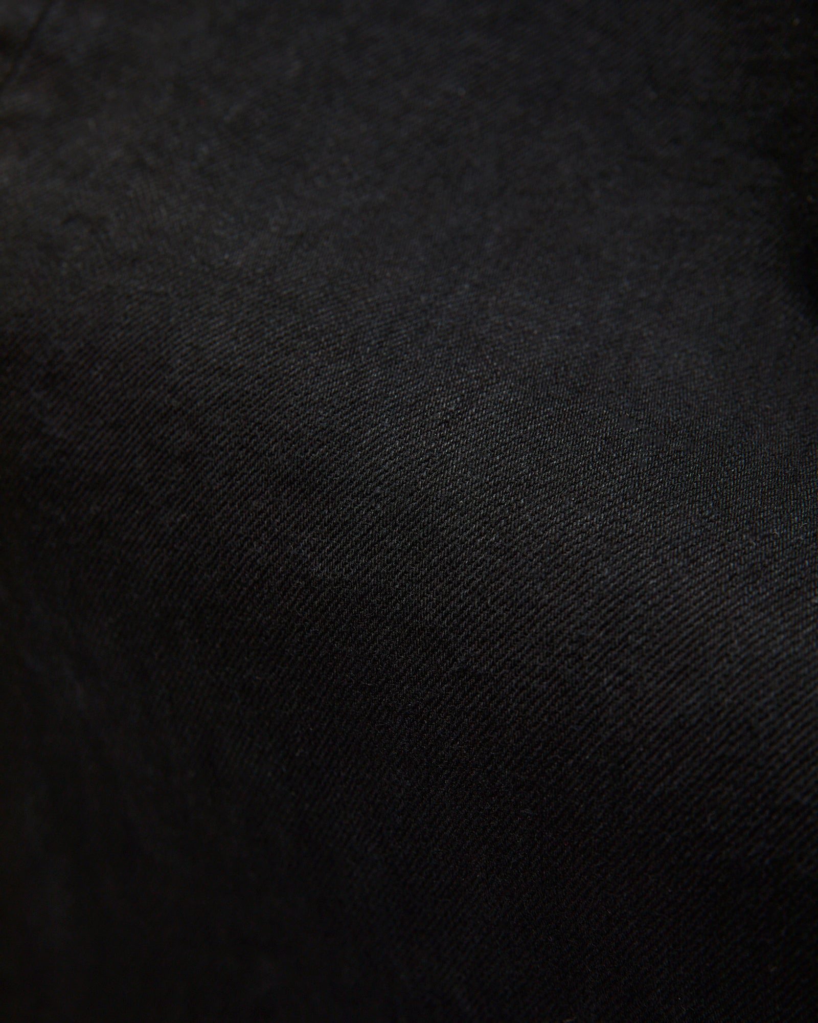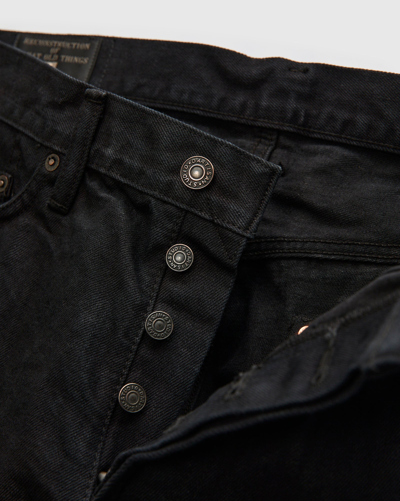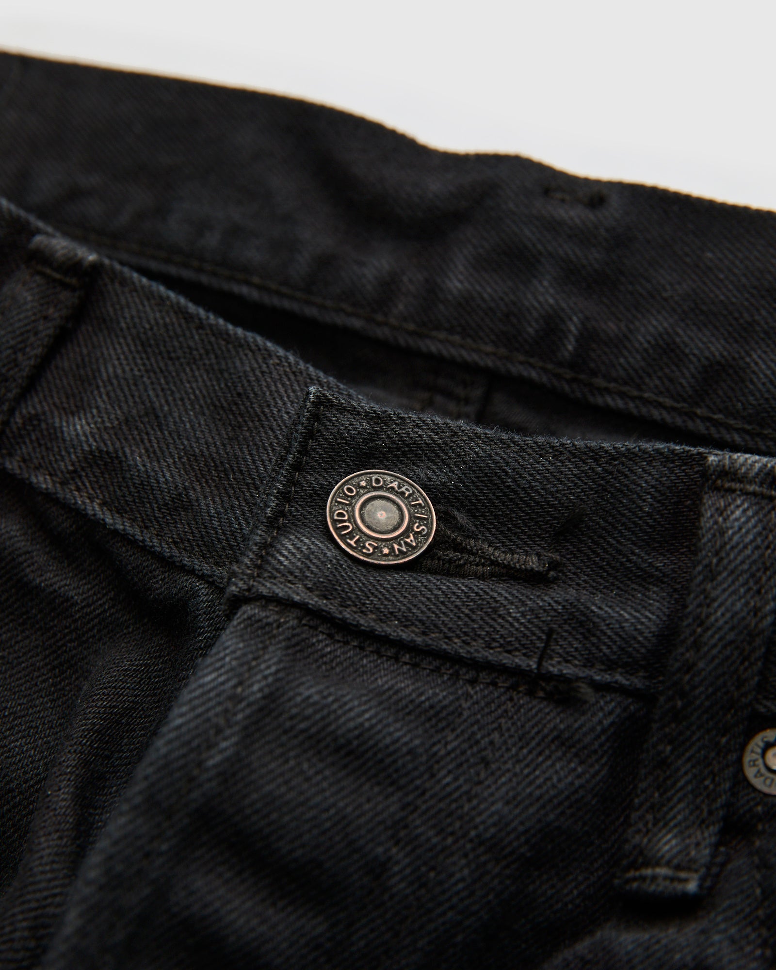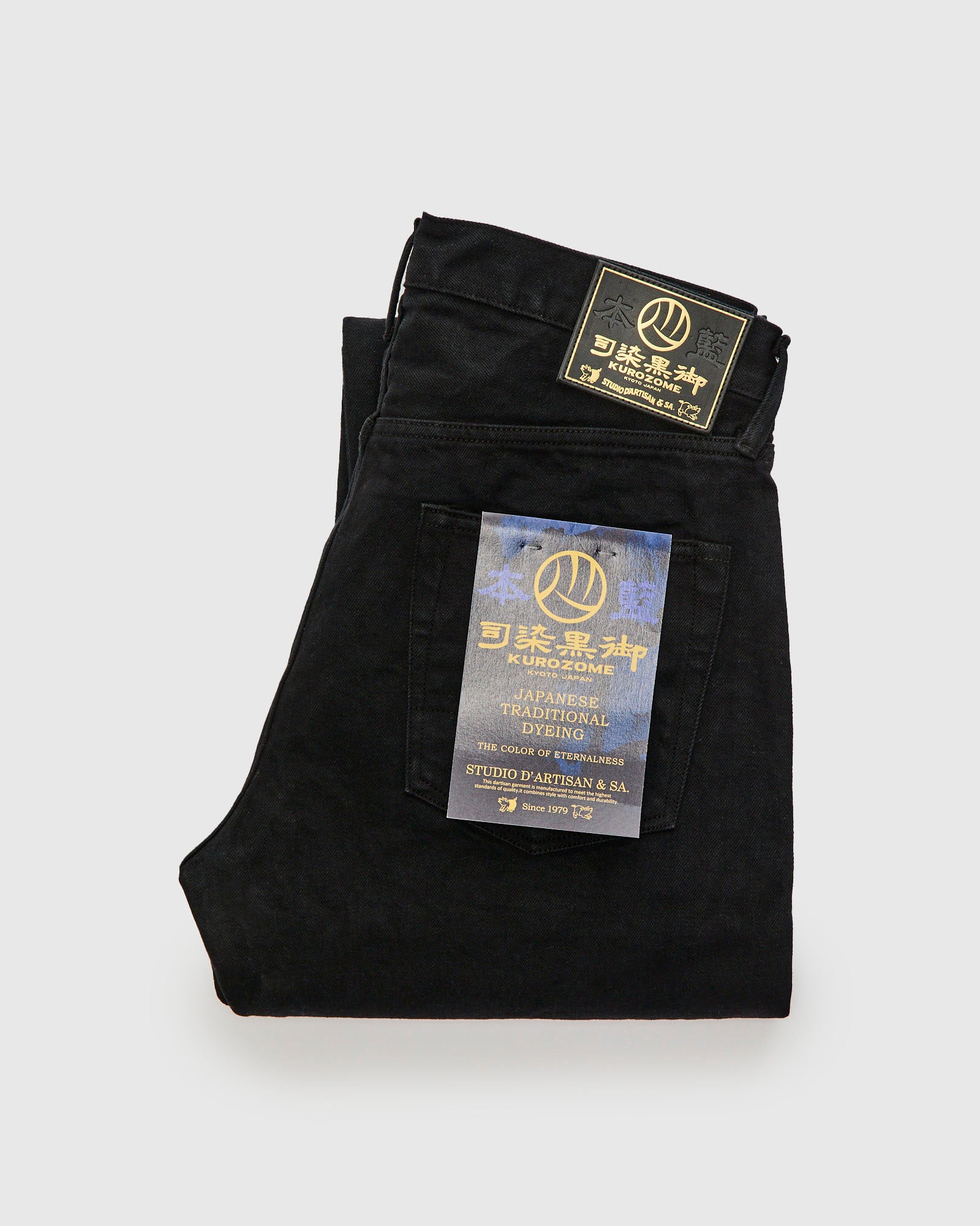• This special offering from the denim pioneers at Studio D'artisan combines the brand's 13.5oz natural indigo denim with a layered over-dye process courtesy of the legendary Kyoto Montsuki dye house. Founded in 1915, the Kyoto Montsuki company has spent generations pursuing the deepest, most consistent black possible with natural dyes. The jeans are initially rope-dyed an indigo color, and are then repeatedly hand-dipped in Kyoto Montsuki's "Kyo Kuro" dye to create a powerful black only achievable with this method. The final product undergoes an additional rinse to further minimize shrinkage and is equipped custom Studio D'artisan detailing.