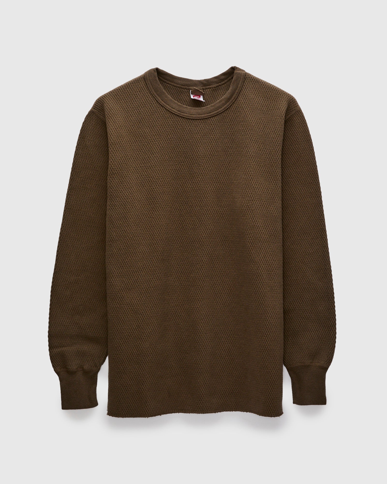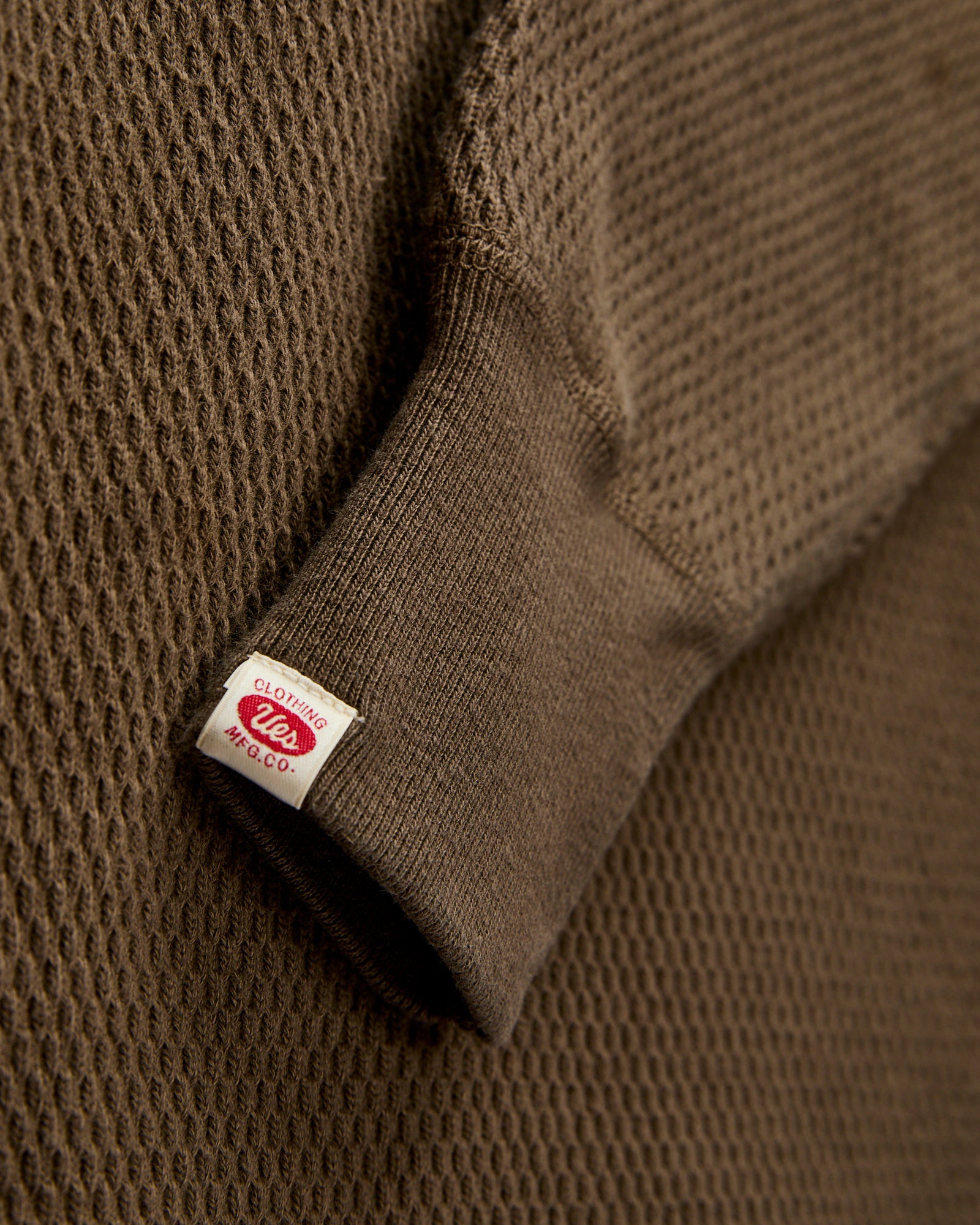 • Designed as the ultimate base layer, UES' Double Honeycomb Thermal is constructed at a substantial 16.5oz weight using old-world knitting machines. Built for maximum insulation and comfort, the fabric is exceptionally thick with a plush interior, making it suitable as either a standalone piece or a foundational layer during colder months. Cut in a slim profile, the shirt is finished with ribbed cuffs, a reinforced collar, and traditional four-needle flat-seam construction.