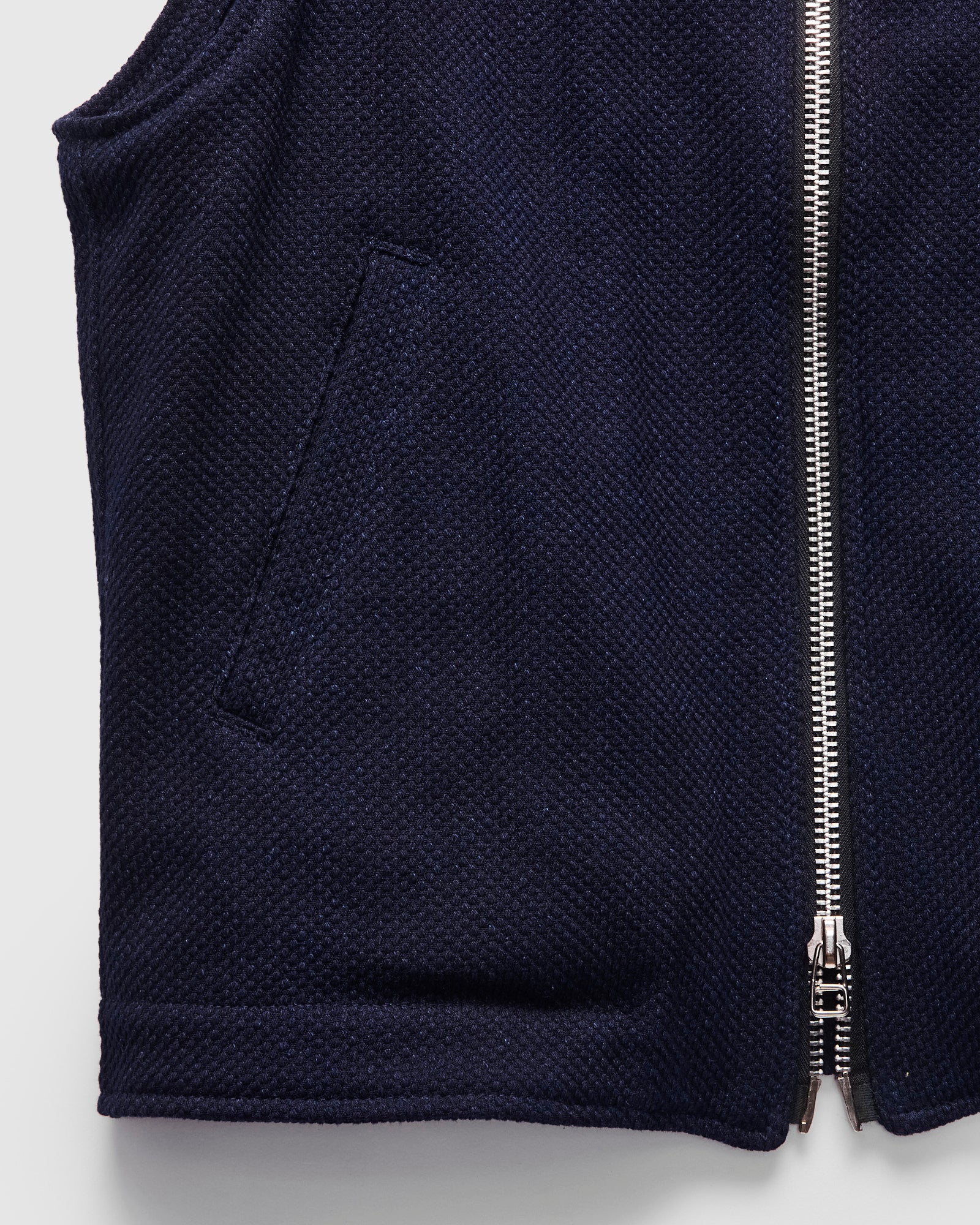 • The Flight Vest is constructed from a 12oz indigo-dyed sashi-ori cloth. Over-dyed indigo, the vest will fade and transform with continued wear. Receiving design influences from militaria, the vest features an interior welt pocket, two-way aluminum zipper, and a smooth satin liner.