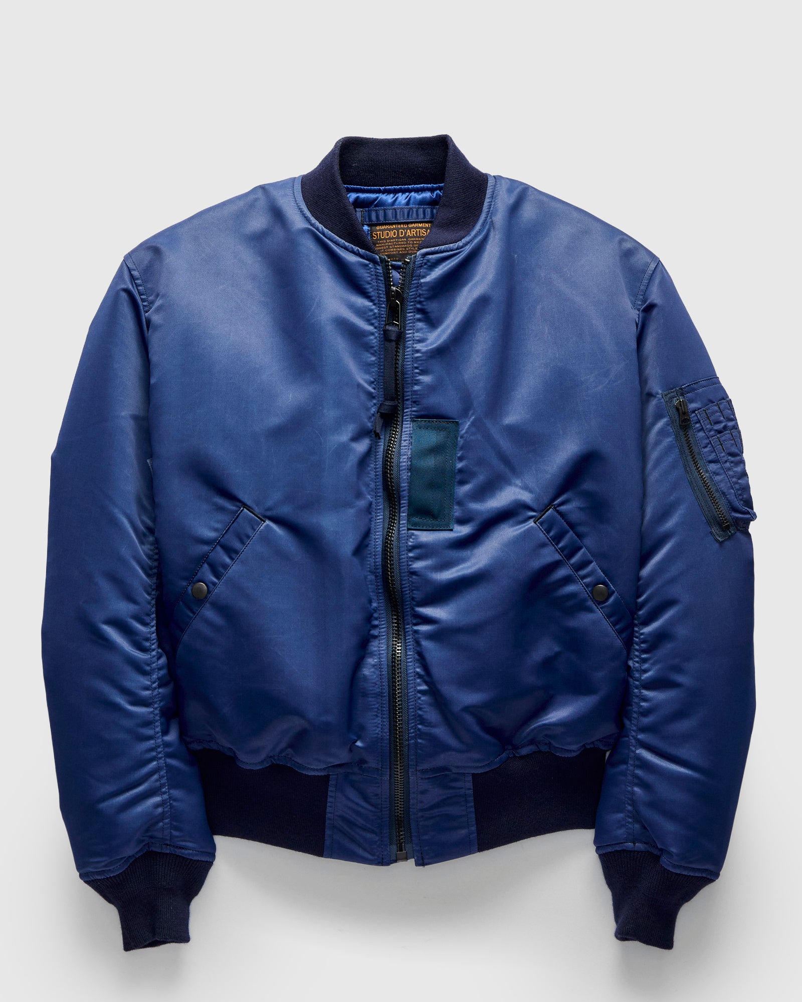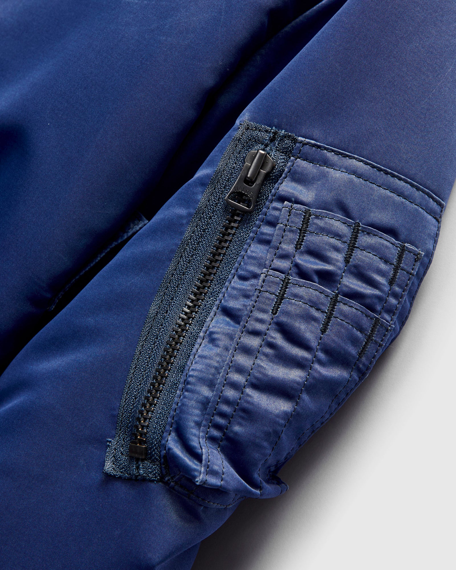 • This flight jacket from SDA features a high-density nylon, pigment dyed a deep indigo blue. The indigo treatment gives the fabric subtle color variations, making each piece unique. A timeless silhouette, SDA's MA-1 Jacket is fitted with welt pockets at the waist, ribbed accenting, and gunmetal tone hardware.