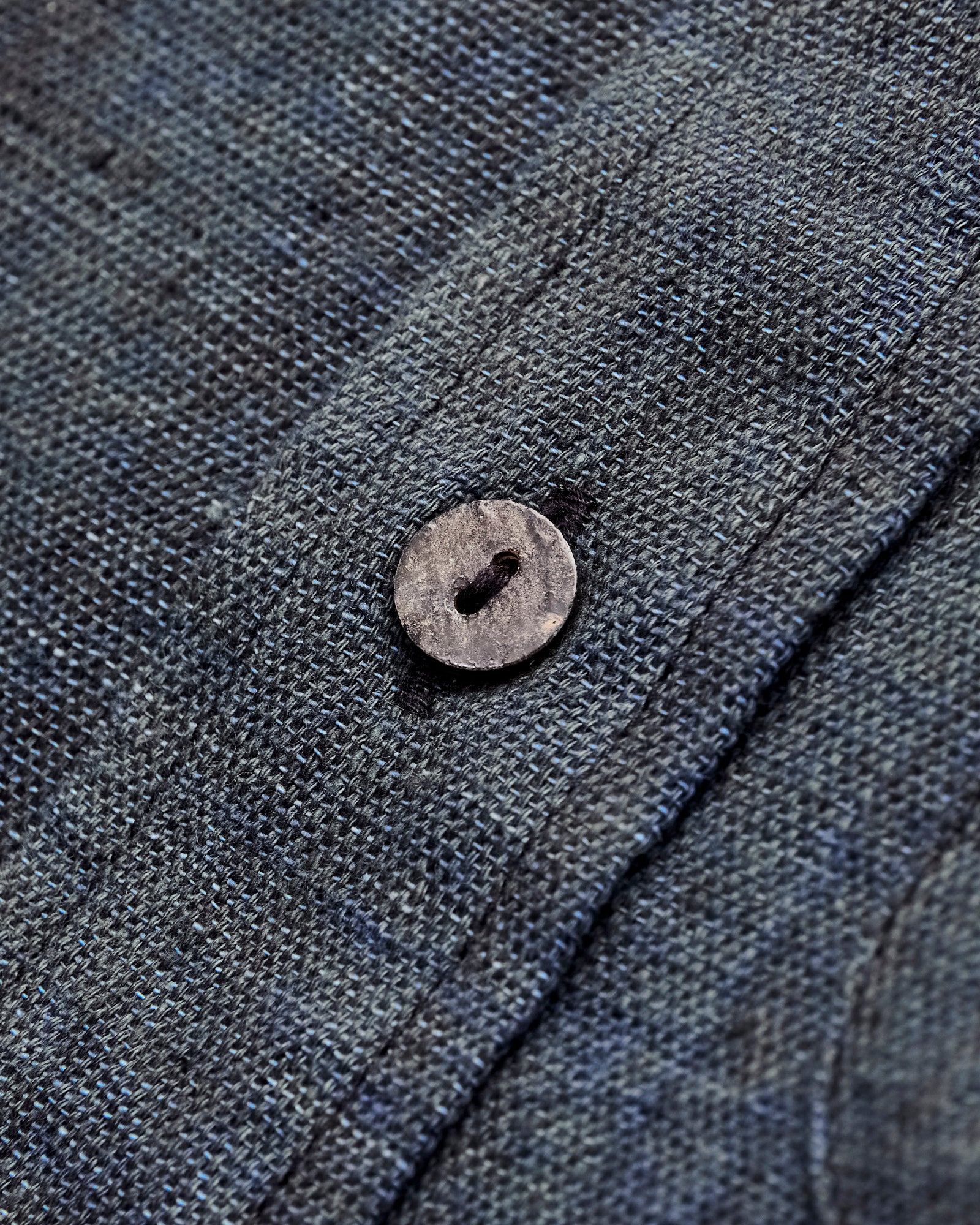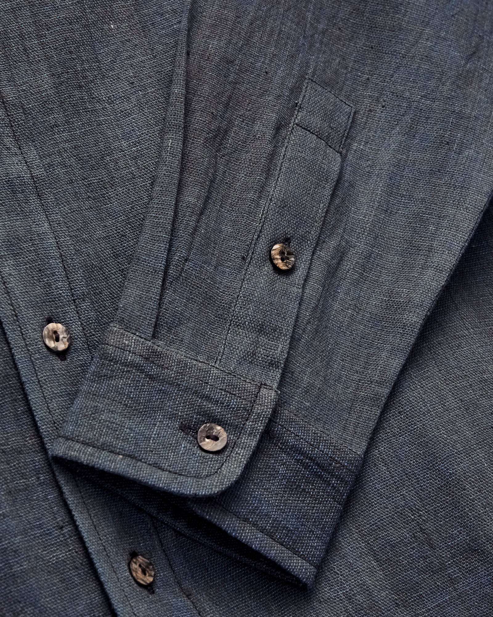 • The Matty Shirt from Indi + Ash is classic button-up shirt made from handcrafted fabrics. This iteration is cut from a handwoven kala cotton material, a rain-fed, wild growing cotton with a light slub texture. The warp is dyed with iron and the weft with natural indigo, resulting in a streaky midnight colorway that will continue to fade and transform overtime. Finished with durable French seams, akoya shell buttons, and a single chest pocket.
