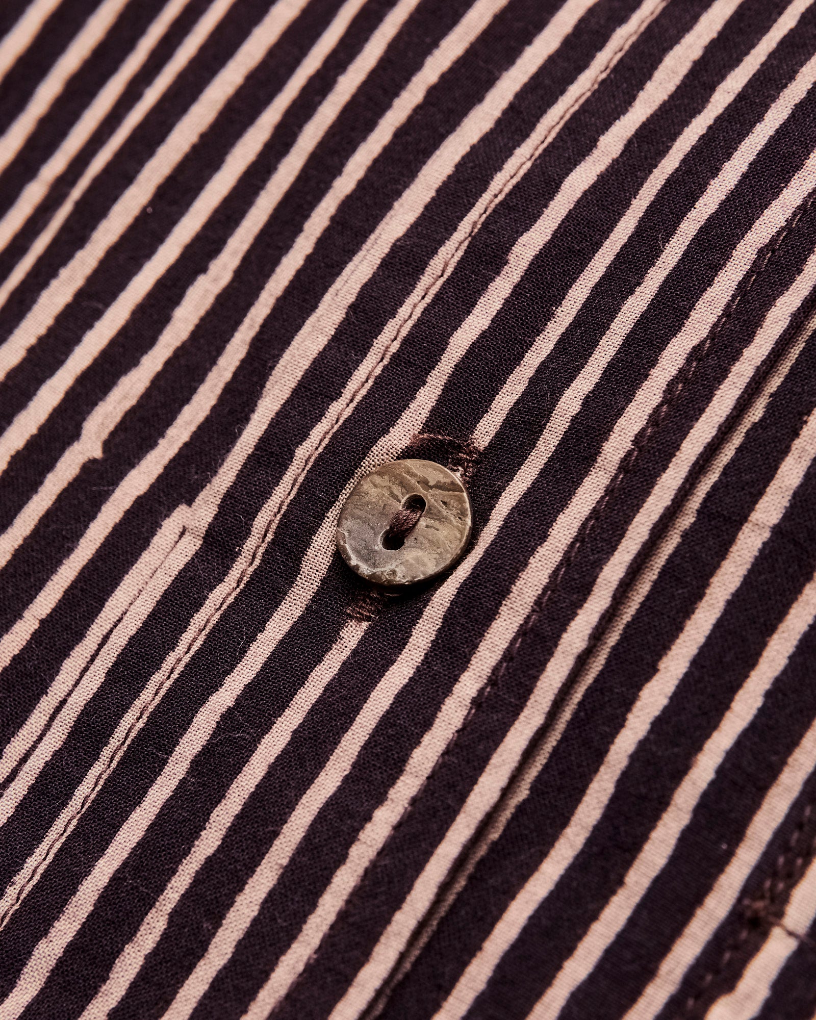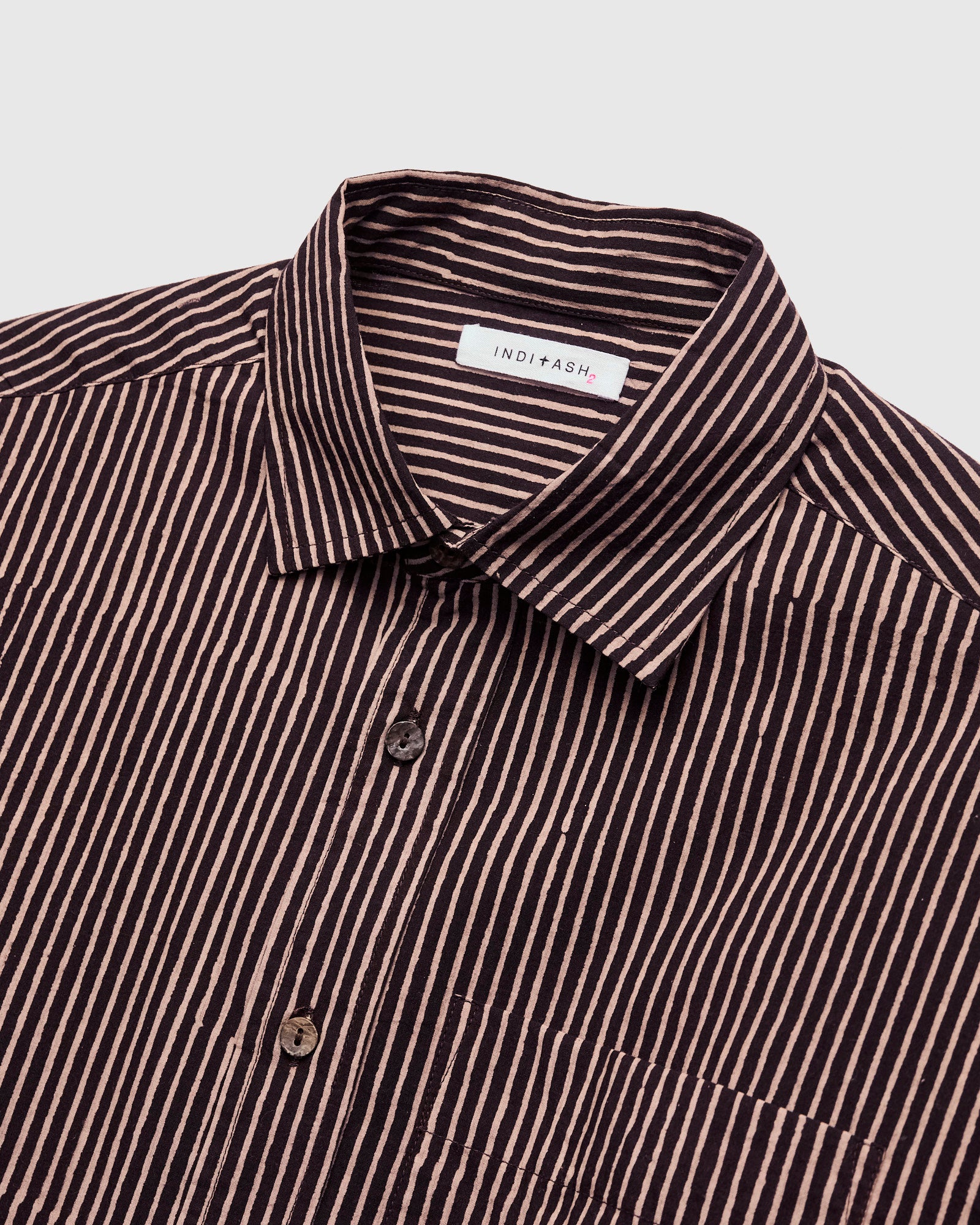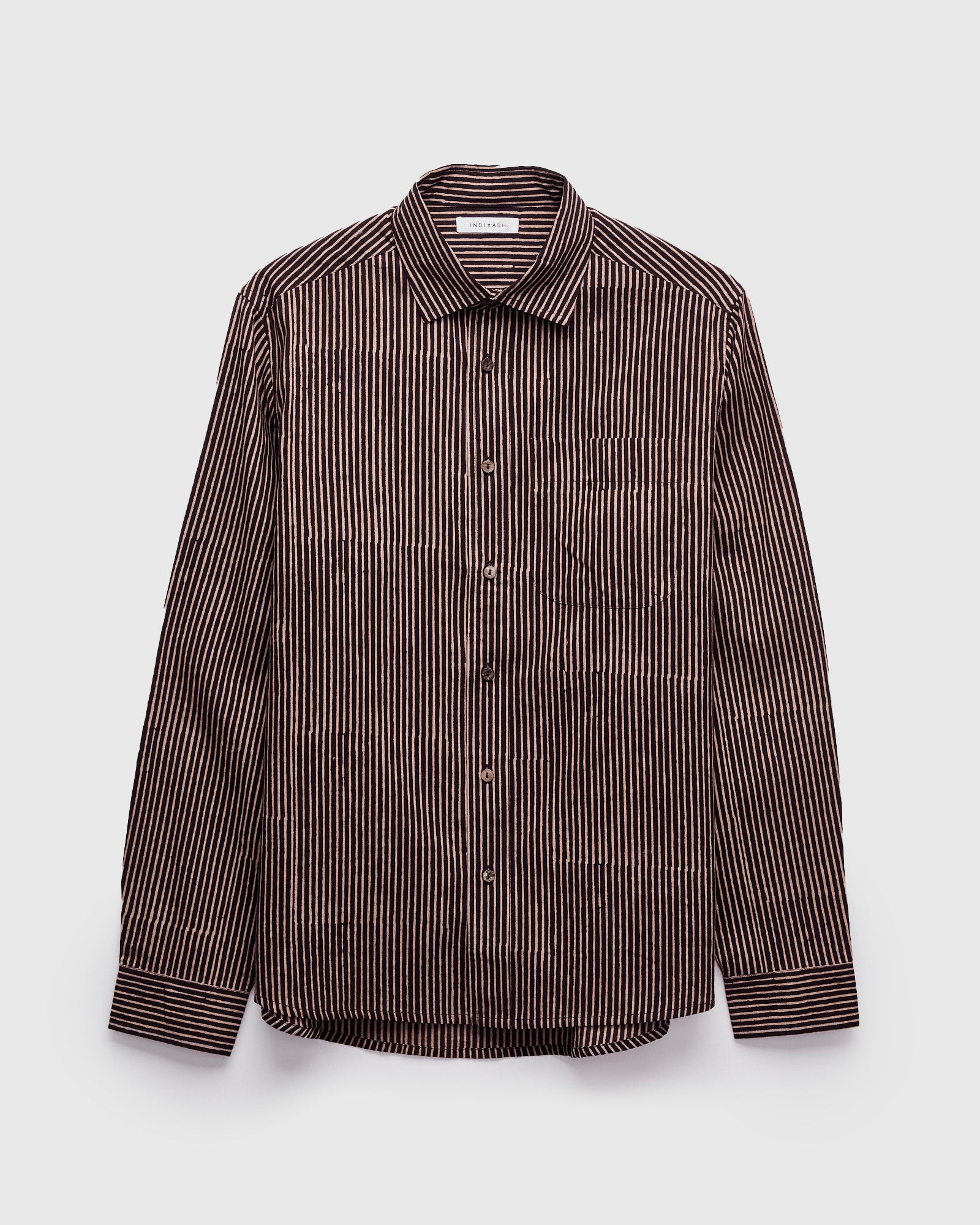 • The Matty Shirt from Indi + Ash is classic button-up shirt made from handcrafted fabrics. This iteration features a hand-printed stripe pattern atop a smooth organic cotton material. Artisans use wooden blocks to stamp the stripe pattern onto the fabric by hand, resulting in subtle variations throughout. The print's color is obtained using extracts from iron and fruit from the myrobalan tree, producing light tan and dark brown striping. Finished with durable French seams, akoya shell buttons, and a single chest pocket.