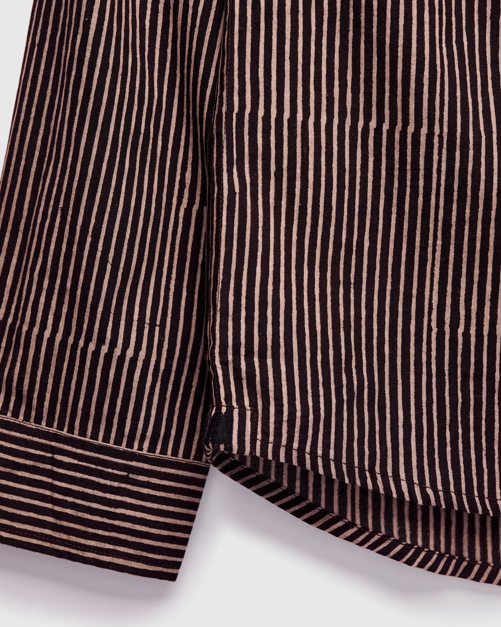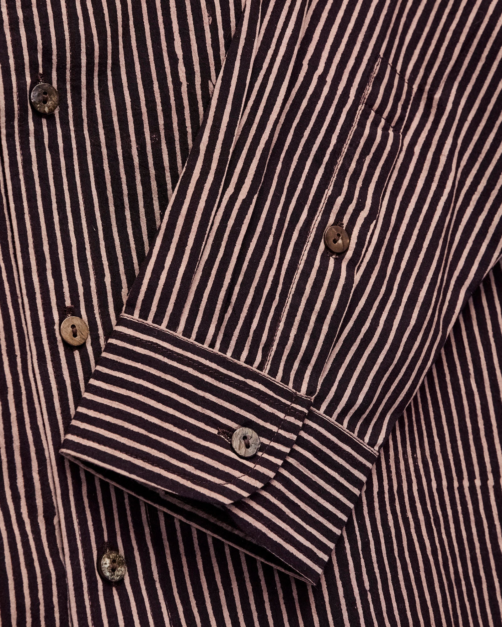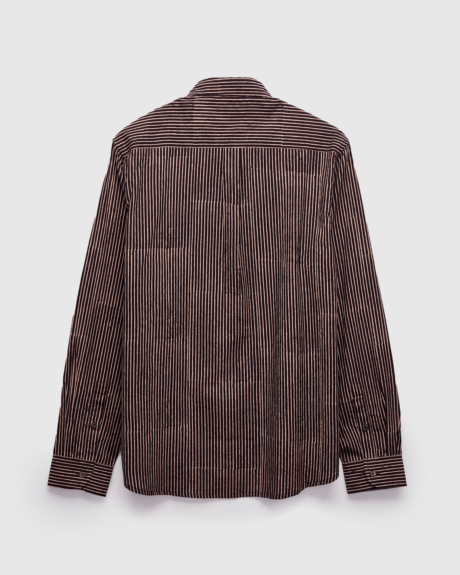 • The Matty Shirt from Indi + Ash is classic button-up shirt made from handcrafted fabrics. This iteration features a hand-printed stripe pattern atop a smooth organic cotton material. Artisans use wooden blocks to stamp the stripe pattern onto the fabric by hand, resulting in subtle variations throughout. The print's color is obtained using extracts from iron and fruit from the myrobalan tree, producing light tan and dark brown striping. Finished with durable French seams, akoya shell buttons, and a single chest pocket.