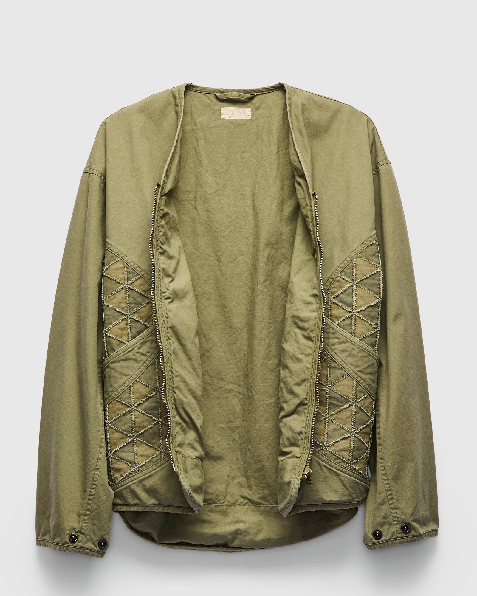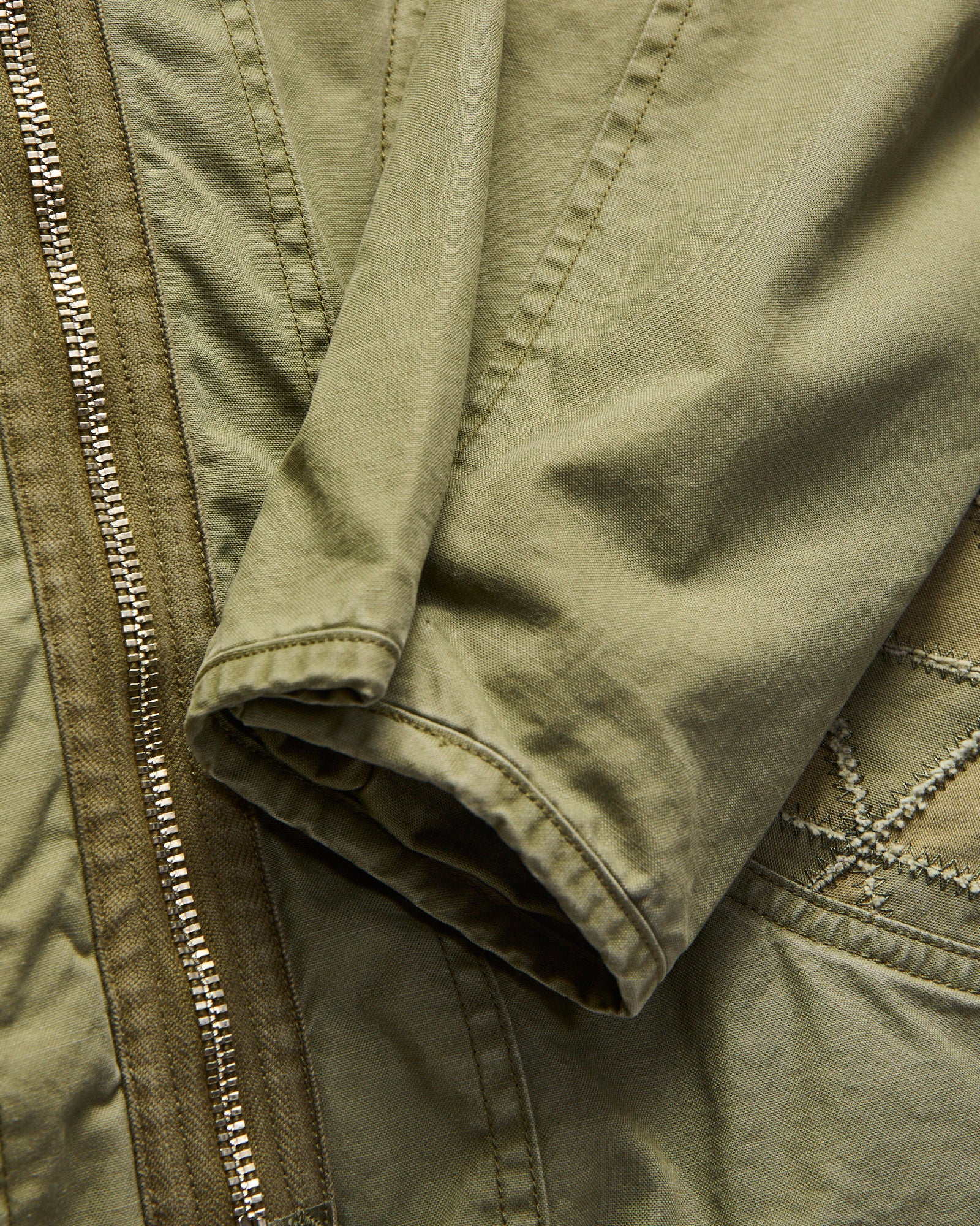 • This Haori Jacket blends military-influences with traditional Japanese design elements. The jacket incorporates a handcrafted patchwork fabric atop a cotton sateen base. Each triangular patch is arranged and sewn together to form a single cohesive "Tsugihagi" fabric. Cut in a loose and relaxed sihloutte.