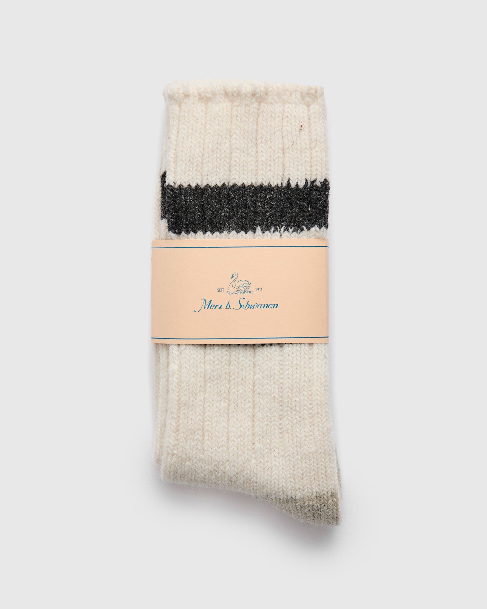 • Made from a sustainable recycled wool, these socks from Merz b. Schanen feature a classic striped design inspired by vintage styles. Made at a standard boot-crew length, these socks are knit with a wide rib pattern and contrast heel panels.