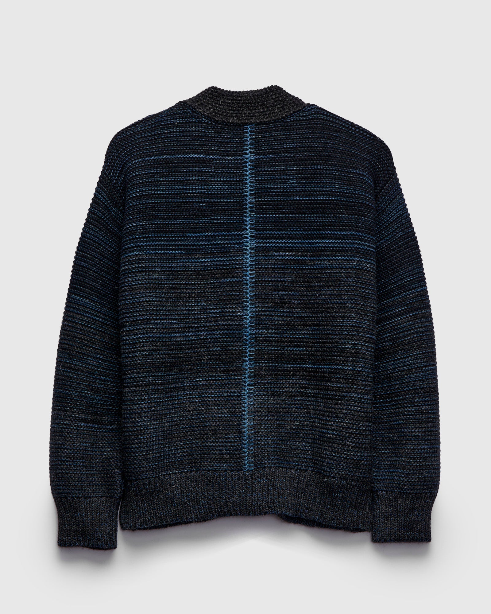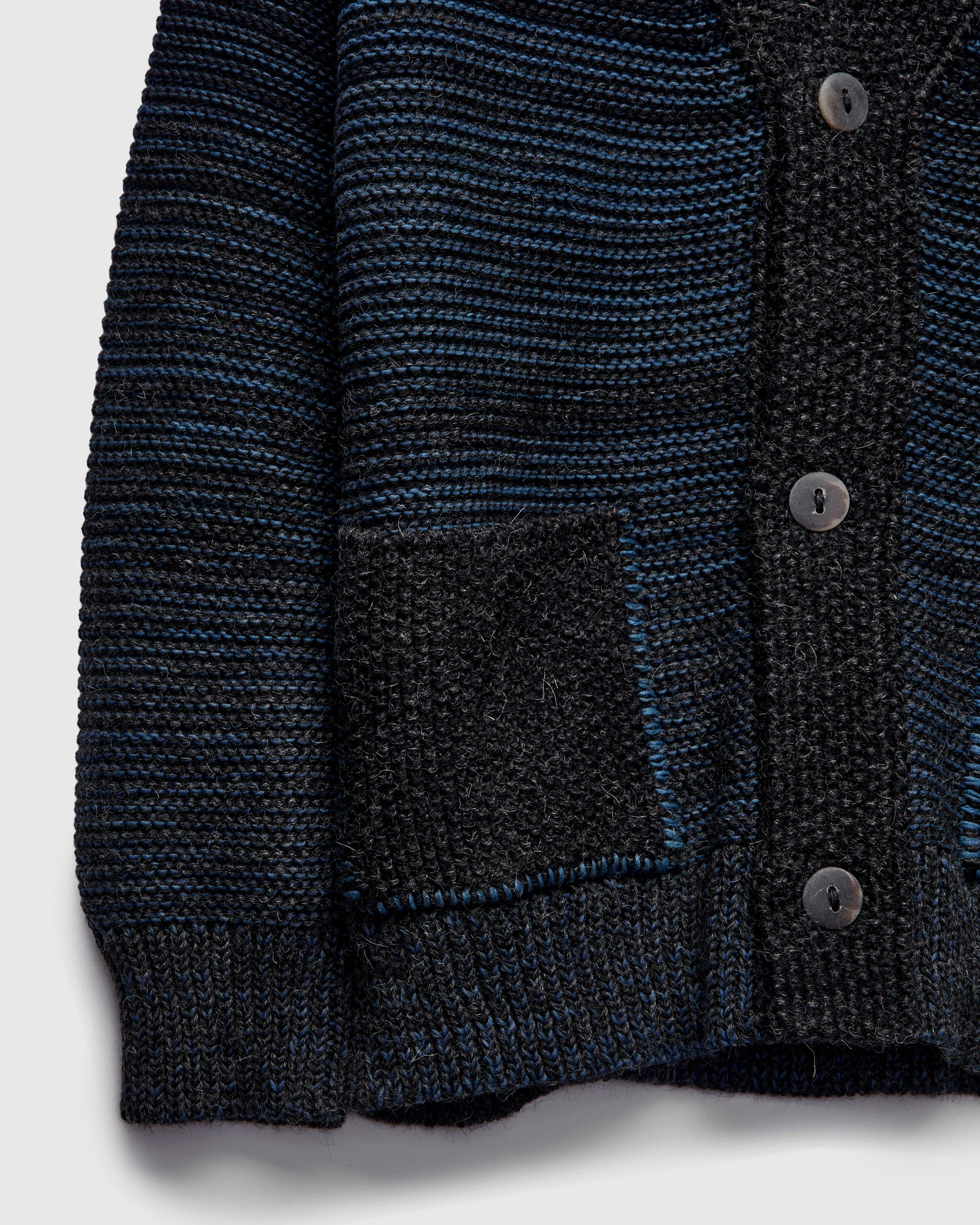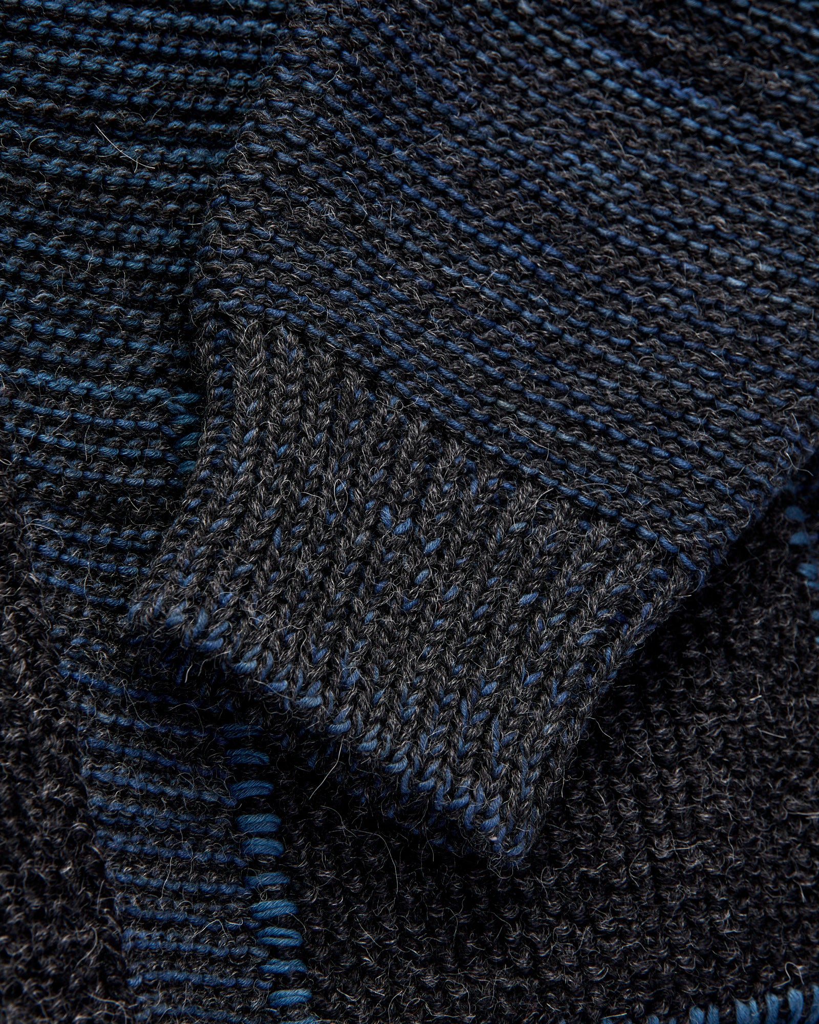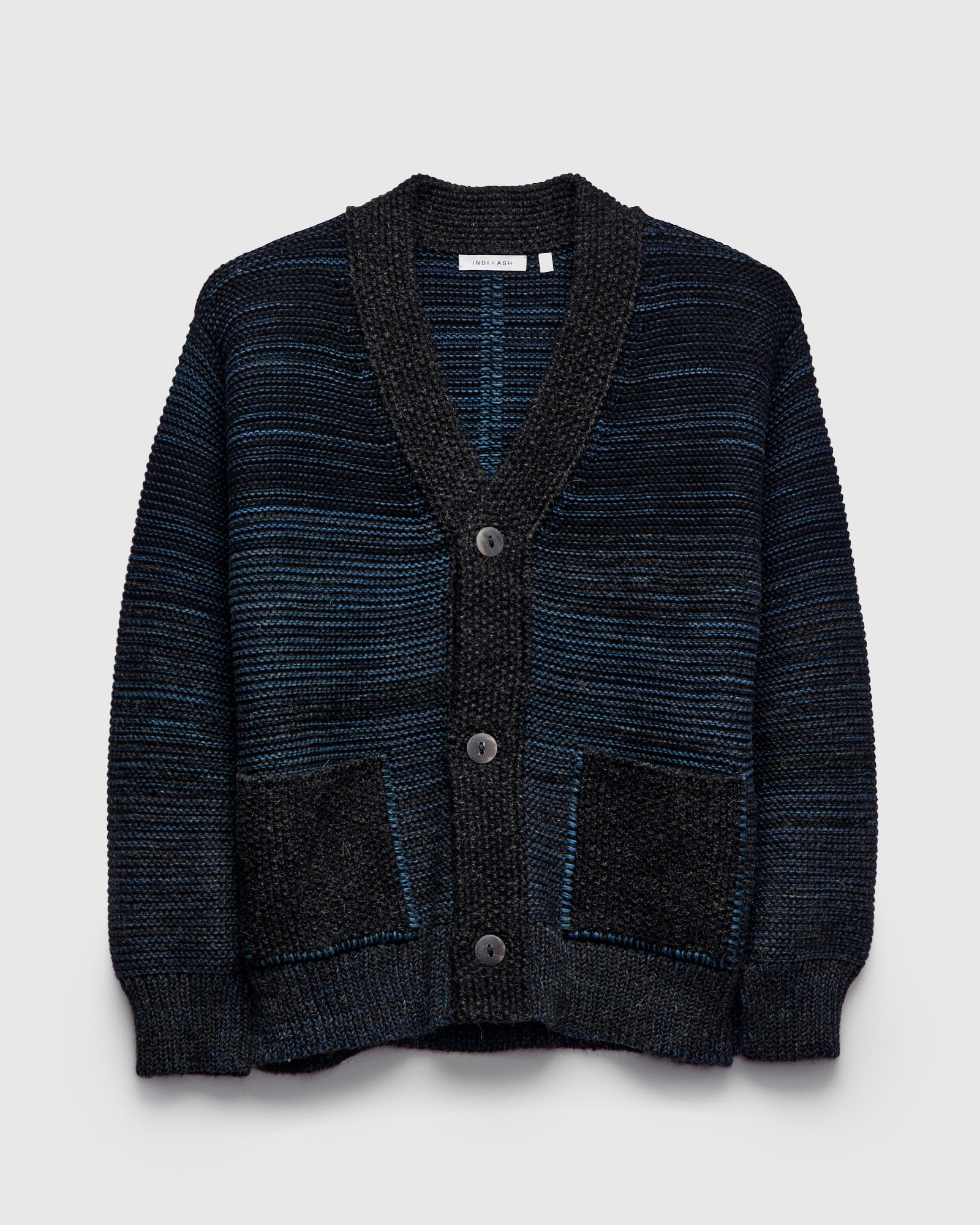• The Ren Cardigan is crafted on a manual knitting machine that operates without electricity. This heavyweight piece of outerwear combines the softness and warmth of alpaca with the durability and drape of Pima cotton by using alpaca-wrapped Pima cotton yarns. Three levels of undyed black, charcoal, and grey alpaca yarns are knit alongside hand-dyed indigo cotton yarns, producing a subtle gradient effect down the body of the sweater. Finished with hand-crocheted panels, pockets, and large horn buttons, the cardigan exemplifies slow, artisanal craftsmanship at every detail.