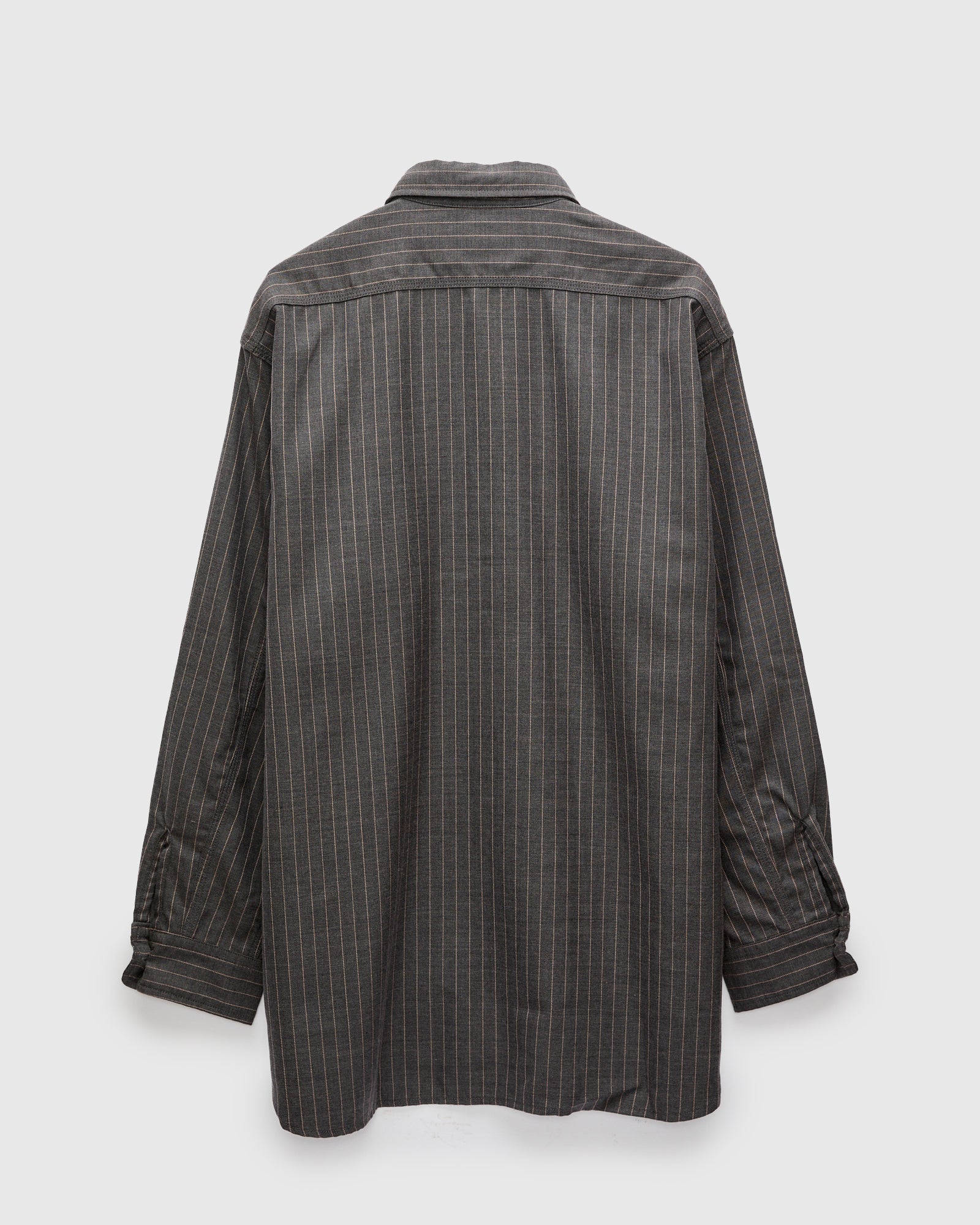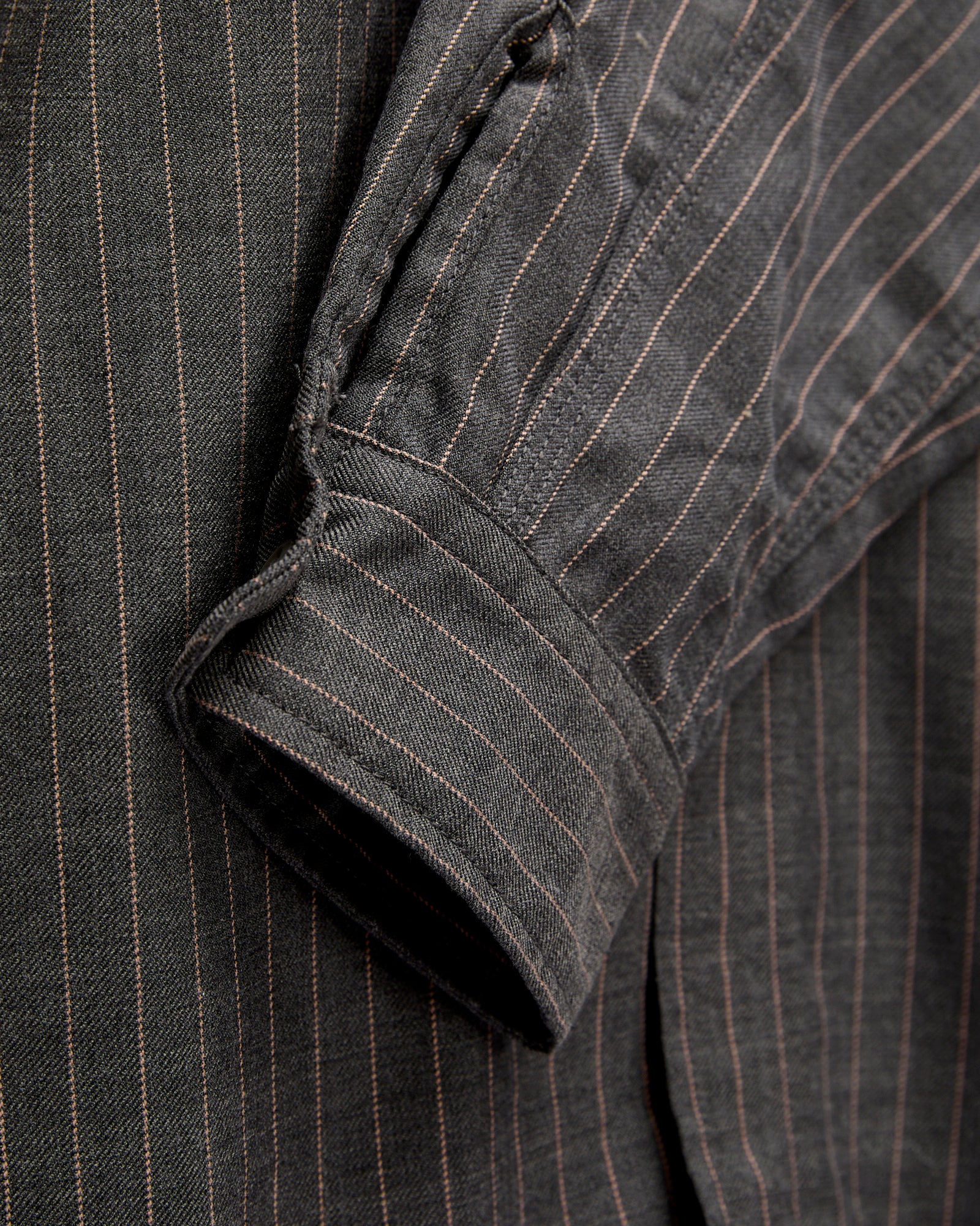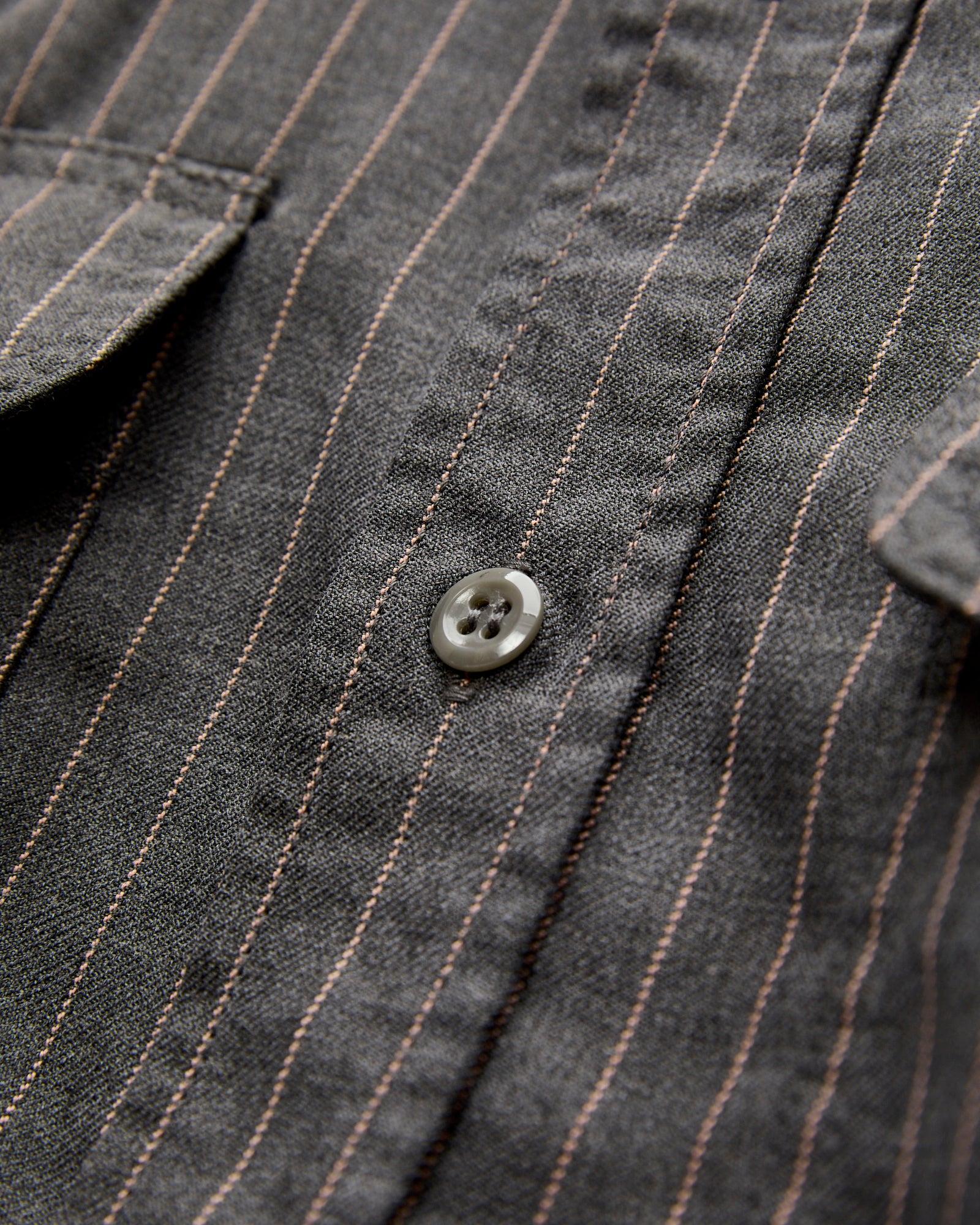 • This workshirt is made from a poly-wool serge stripe fabric dyed using a special cationic dye method to preserve the wool's natural soft touch. Modeled after vintage American uniforms from the 1940s's, the shirt features a utilitarian design complete with large flap pockets at the chest. Crafted in Japan, the workshirt is cut in a relaxed fit with triple-needle chain stitching.