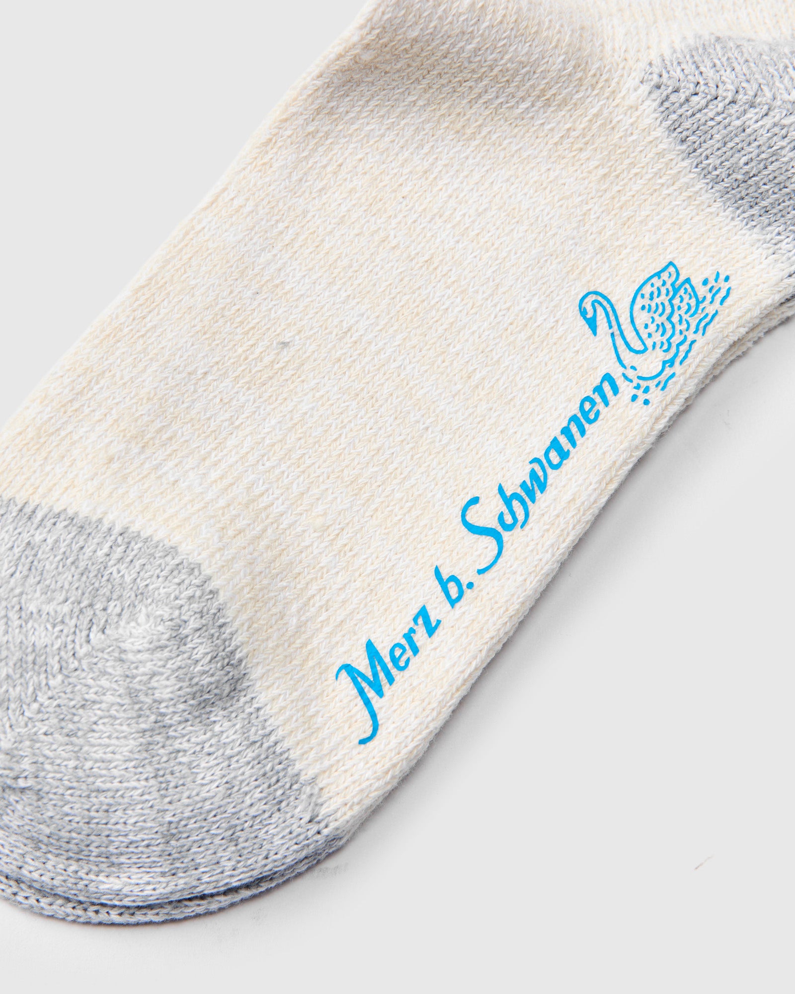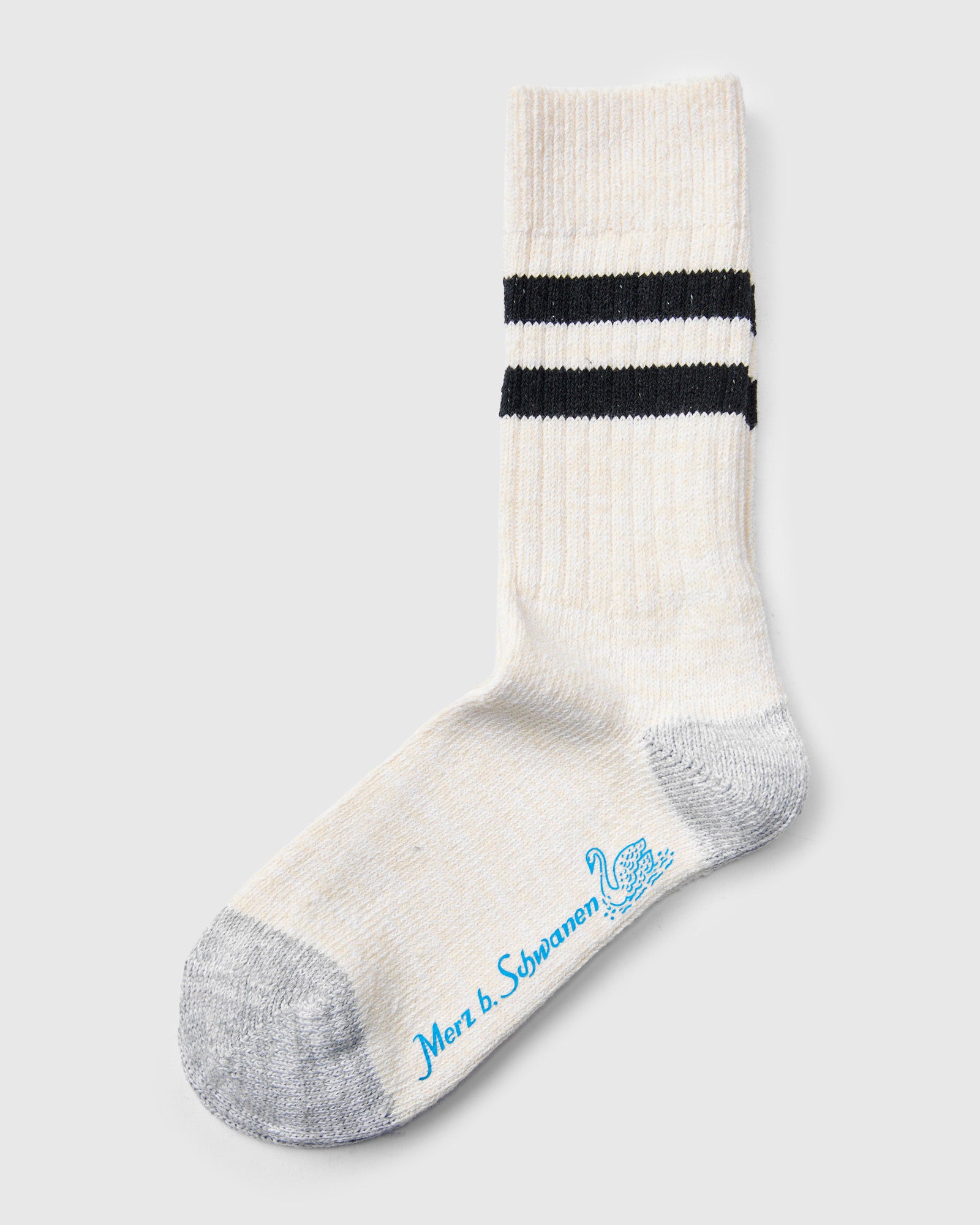 • Merz b. Schwanen's classic socks are made from sustainable organic cotton and detailed with striping at the calf. Finished at a half-calf crew length, the socks are constructed with flexible wide ribbed knitting and contrast heel panels.