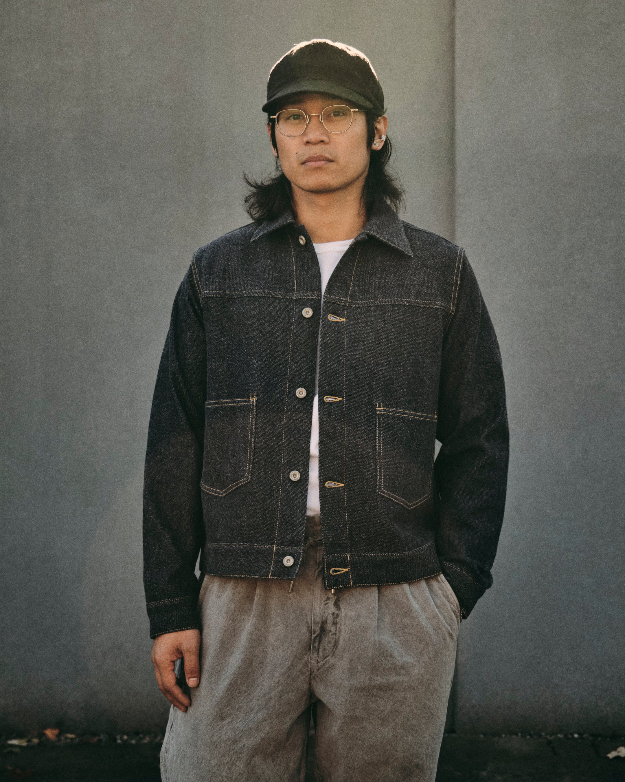 • Providing natural heat retention and an incredibly soft hand, Seuvas’ Trucker Jacket is crafted from a custom developed cotton-wool denim fabric. Woven to a lofty medium weight the jacket sports a soft, brushed texture and classic indigo color. Sewn with workwear inspired detailing, the jacket comes finished with brass laurel donut buttons, a cinch-back, contrast stitching, and large utility waist pockets.