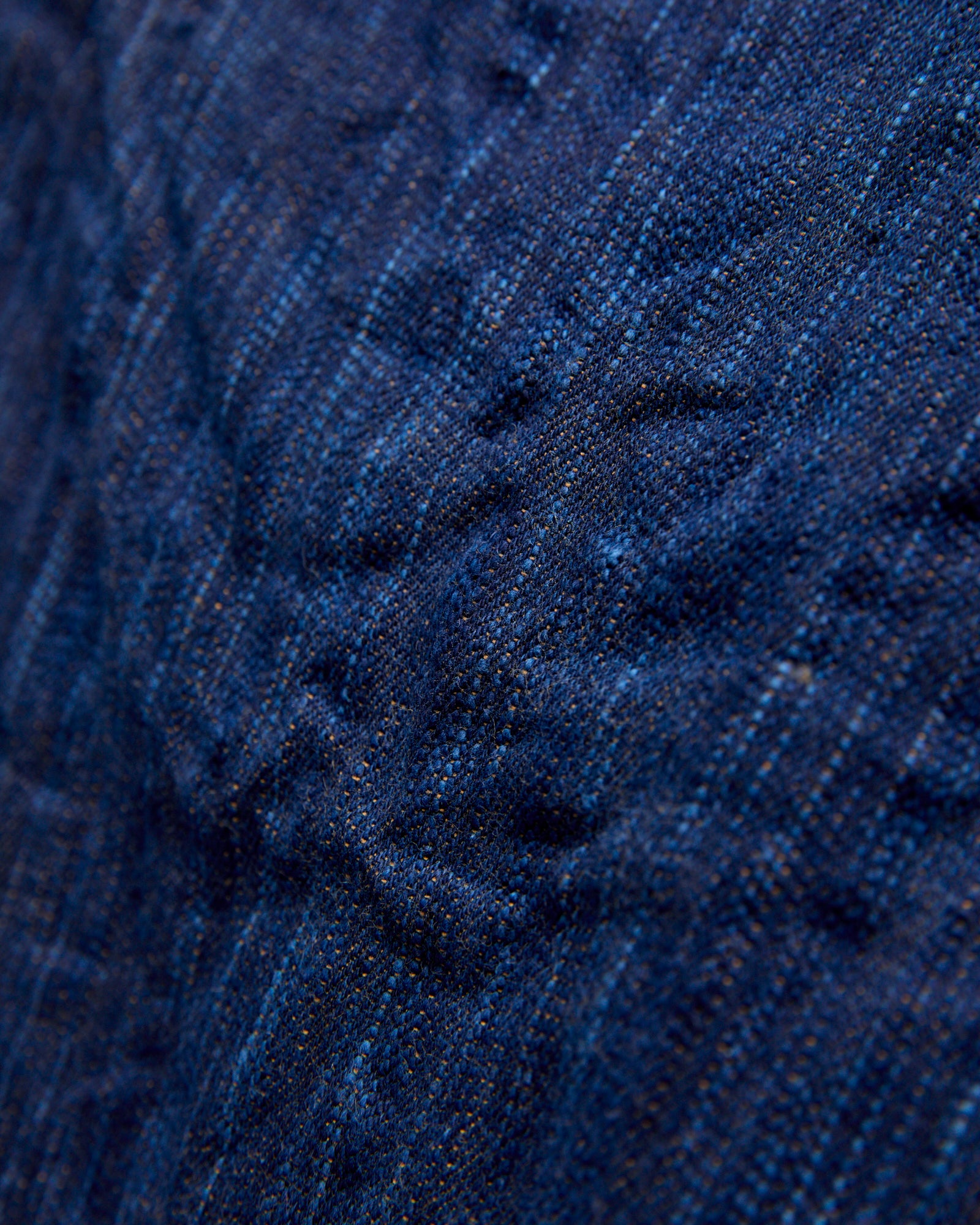 • A true masterpiece and homage to the brand’s Japanese influences, the MIJ15 "Intangible Cultural Treasure" Selvedge Denim combines two traditional dyeing techniques: world renown Tokushima natural indigo and kakishibu persimmon dye. Made using indigo plants grown in Japan, Tokushima’s centuries-old hand-dyeing process yields a deep-rich hue so rare it's recognizes as a national cultural treasure. The weft is dyed with kakishibu—a fermented Japanese persimmon dye that takes over two years to produce—yielding a warm amber-brown tone.