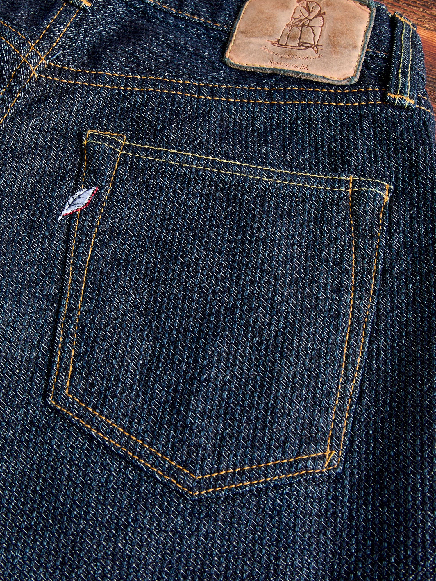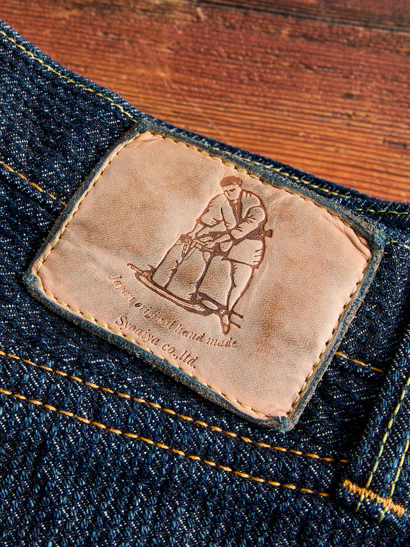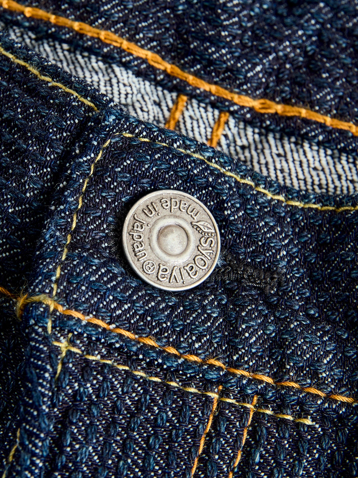 • Pure Blue Japan's sashiko stitch denim is custom woven using a jacquard weave process, offering a medium-weight fabric with a pronounced slub texture. Produced in small batches, the denim is sulfur-dyed, allowing it to fade and develop a unique patina over time. Crafted in a classic five-pocket silhouette, the jeans are finished with custom nickel buttons, a deerskin leather patch, and Pure Blue Japan's signature indigofera leaf embroidery.