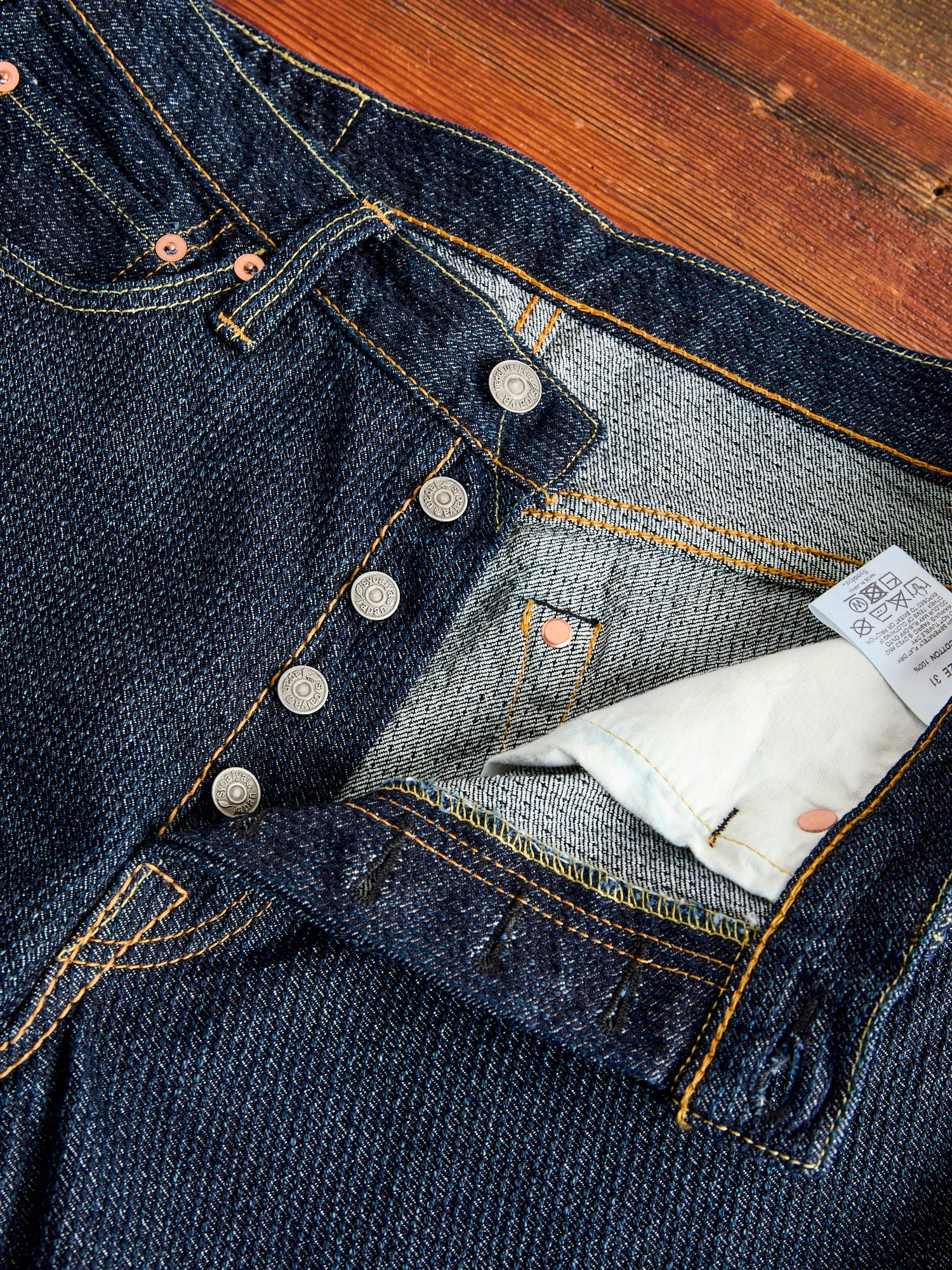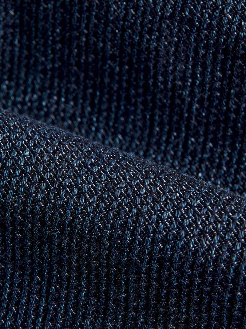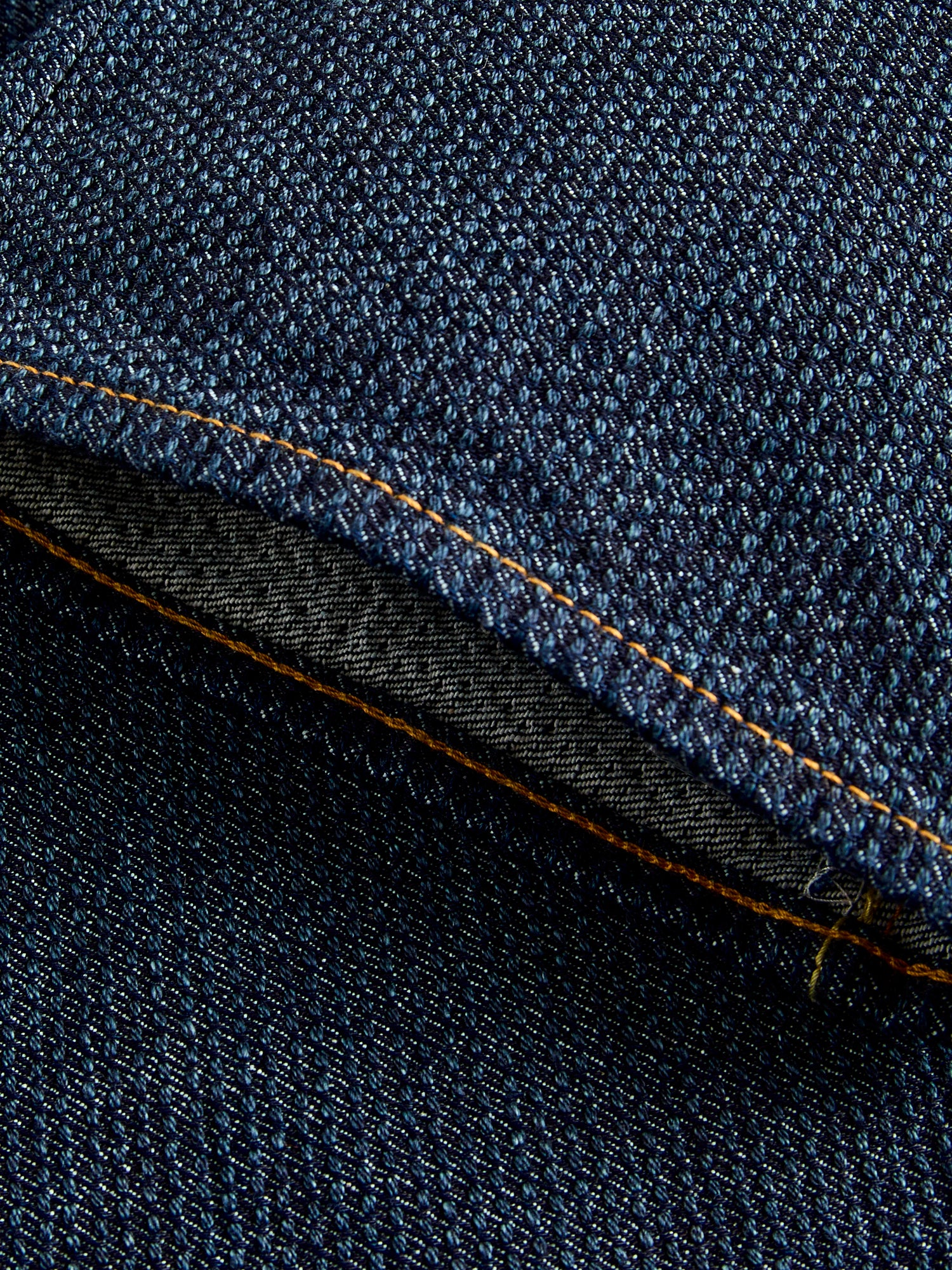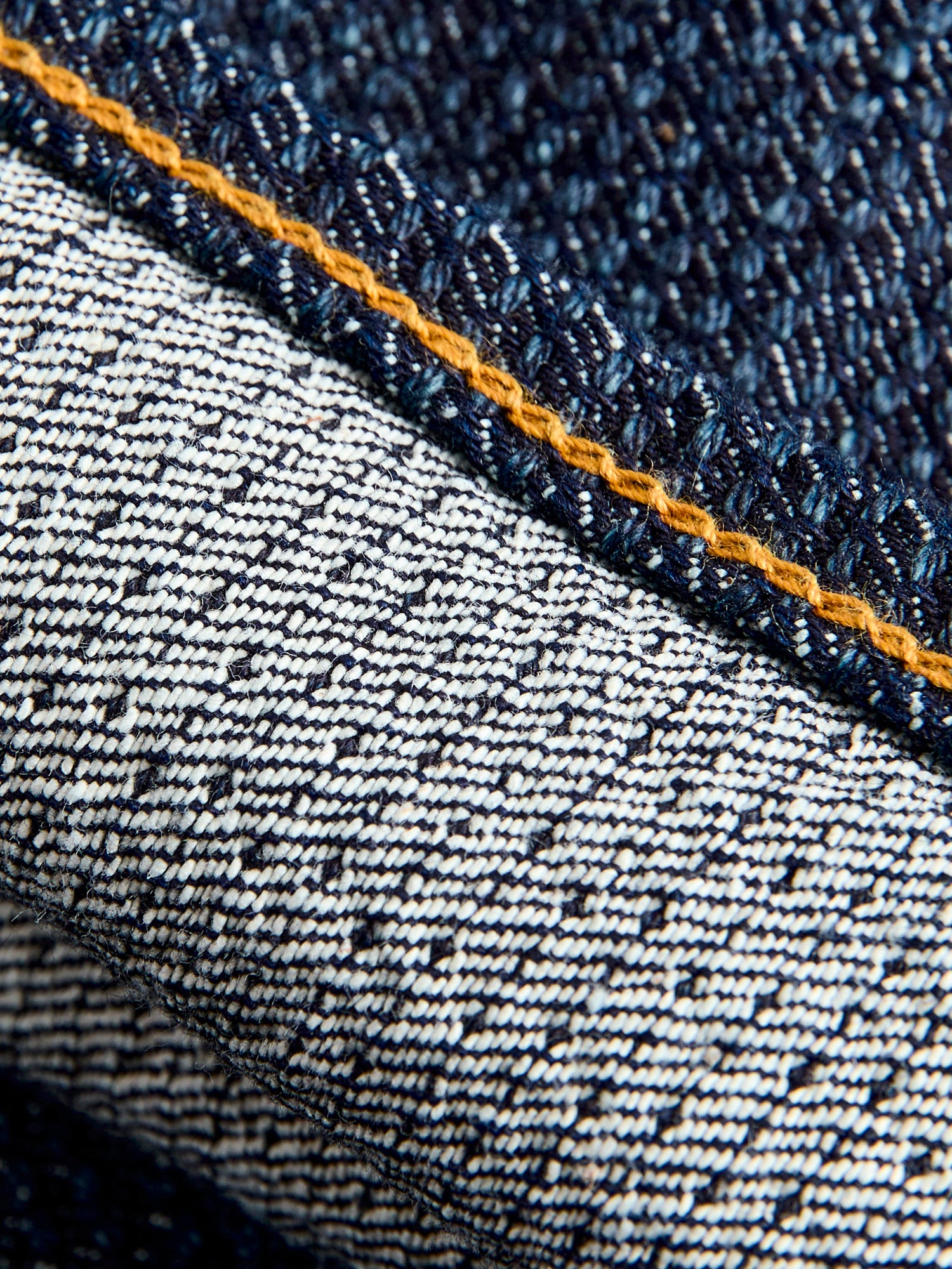 • Pure Blue Japan's sashiko stitch denim is custom woven using a jacquard weave process, offering a medium-weight fabric with a pronounced slub texture. Produced in small batches, the denim is sulfur-dyed, allowing it to fade and develop a unique patina over time. Crafted in a classic five-pocket silhouette, the jeans are finished with custom nickel buttons, a deerskin leather patch, and Pure Blue Japan's signature indigofera leaf embroidery.