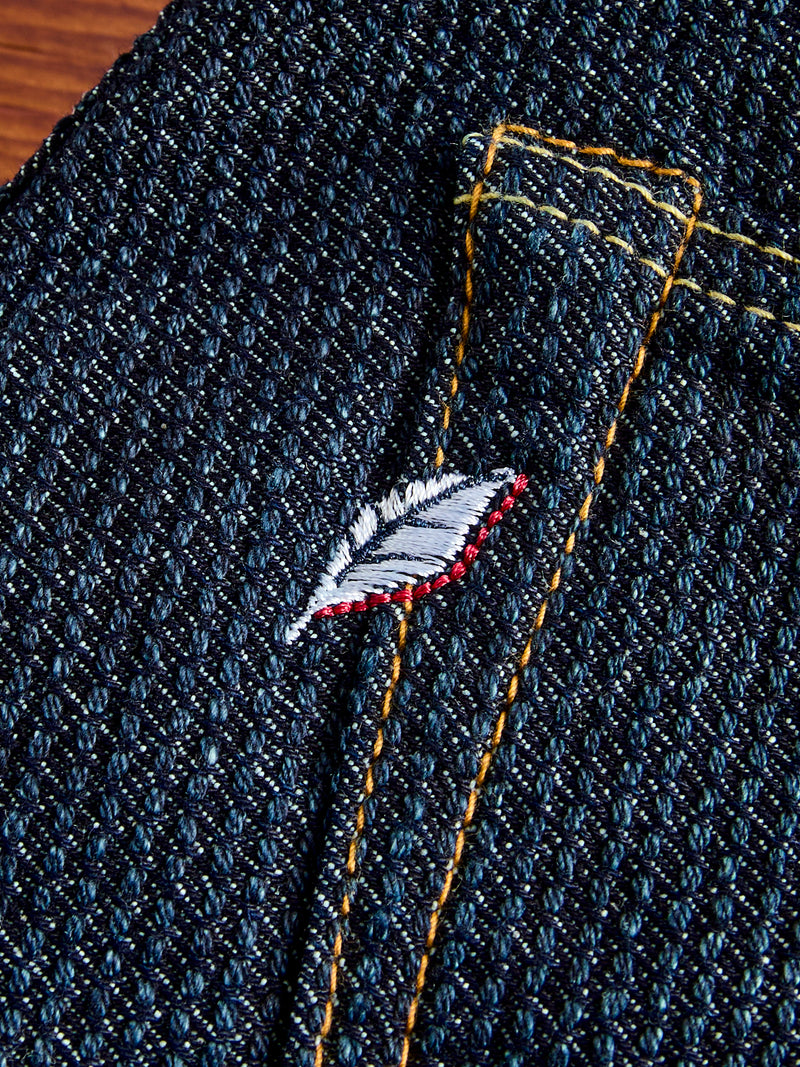 • Signature Pure Blue Japan leaf embroidery on back right pocket