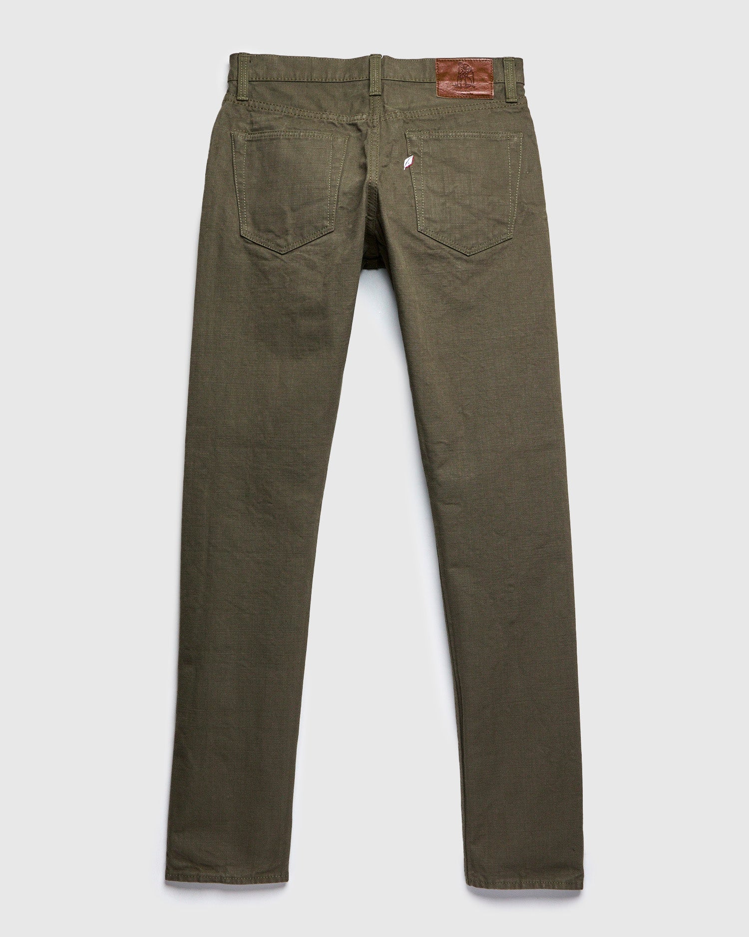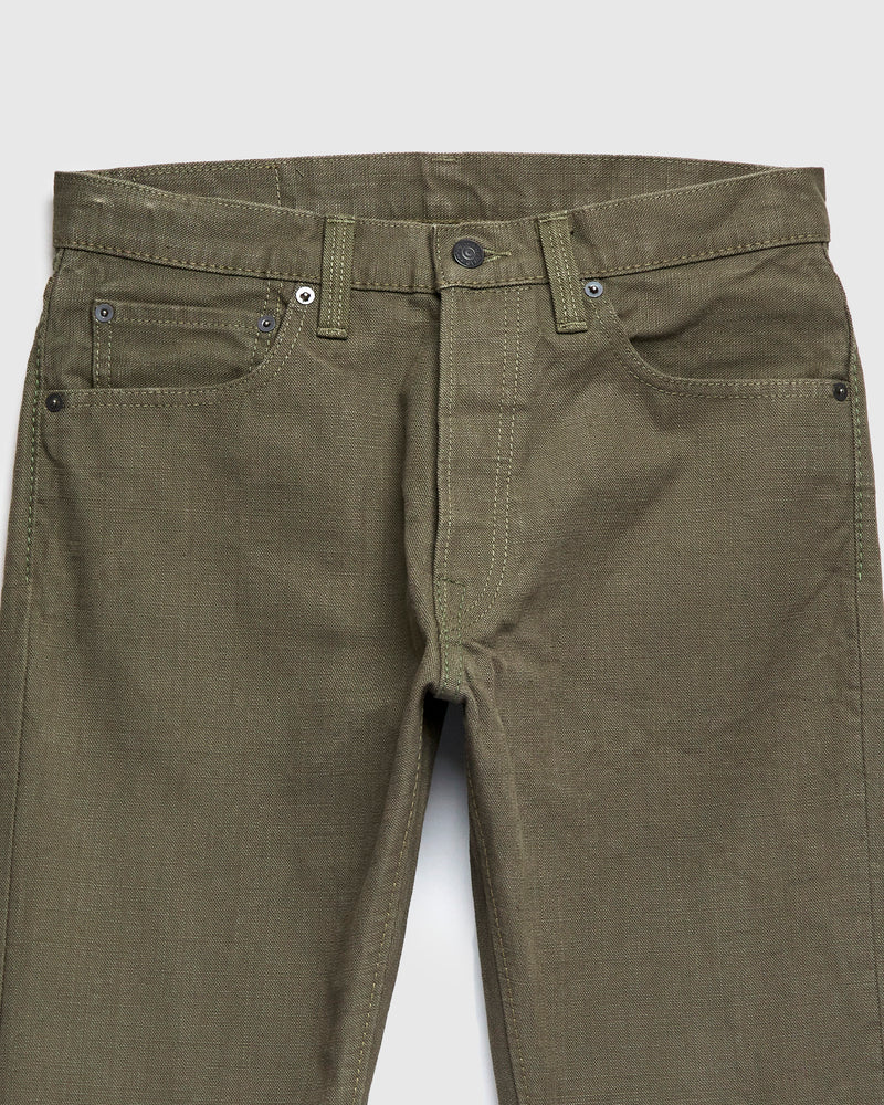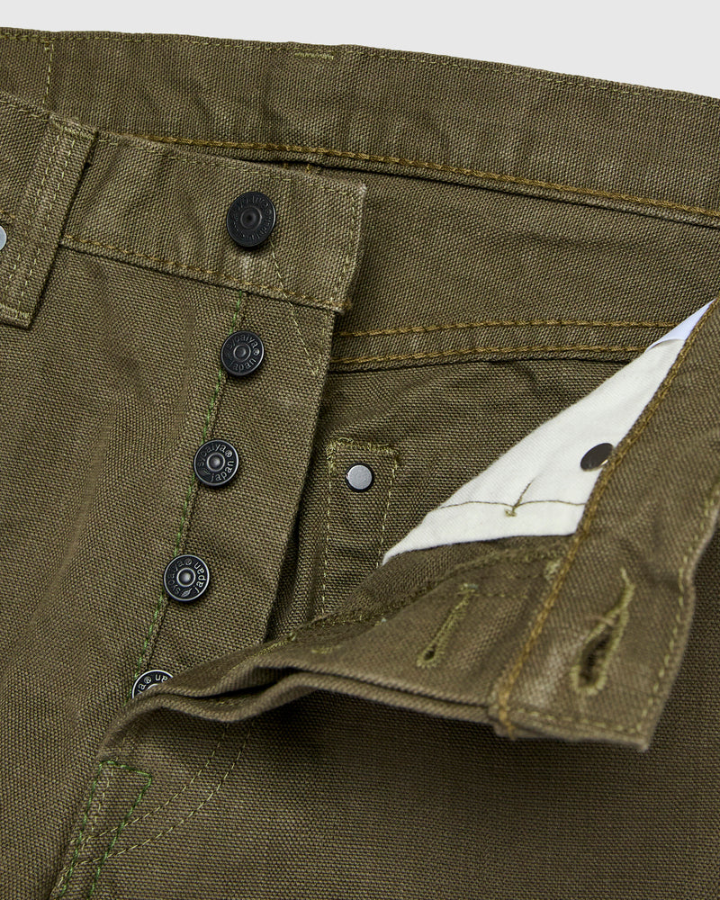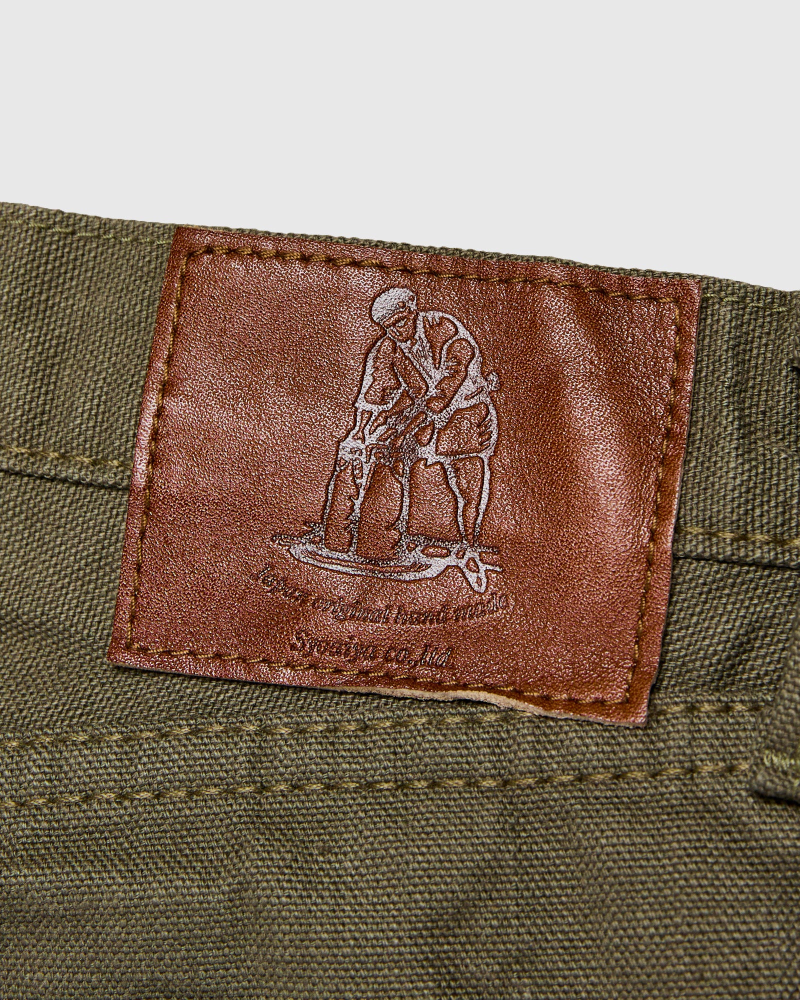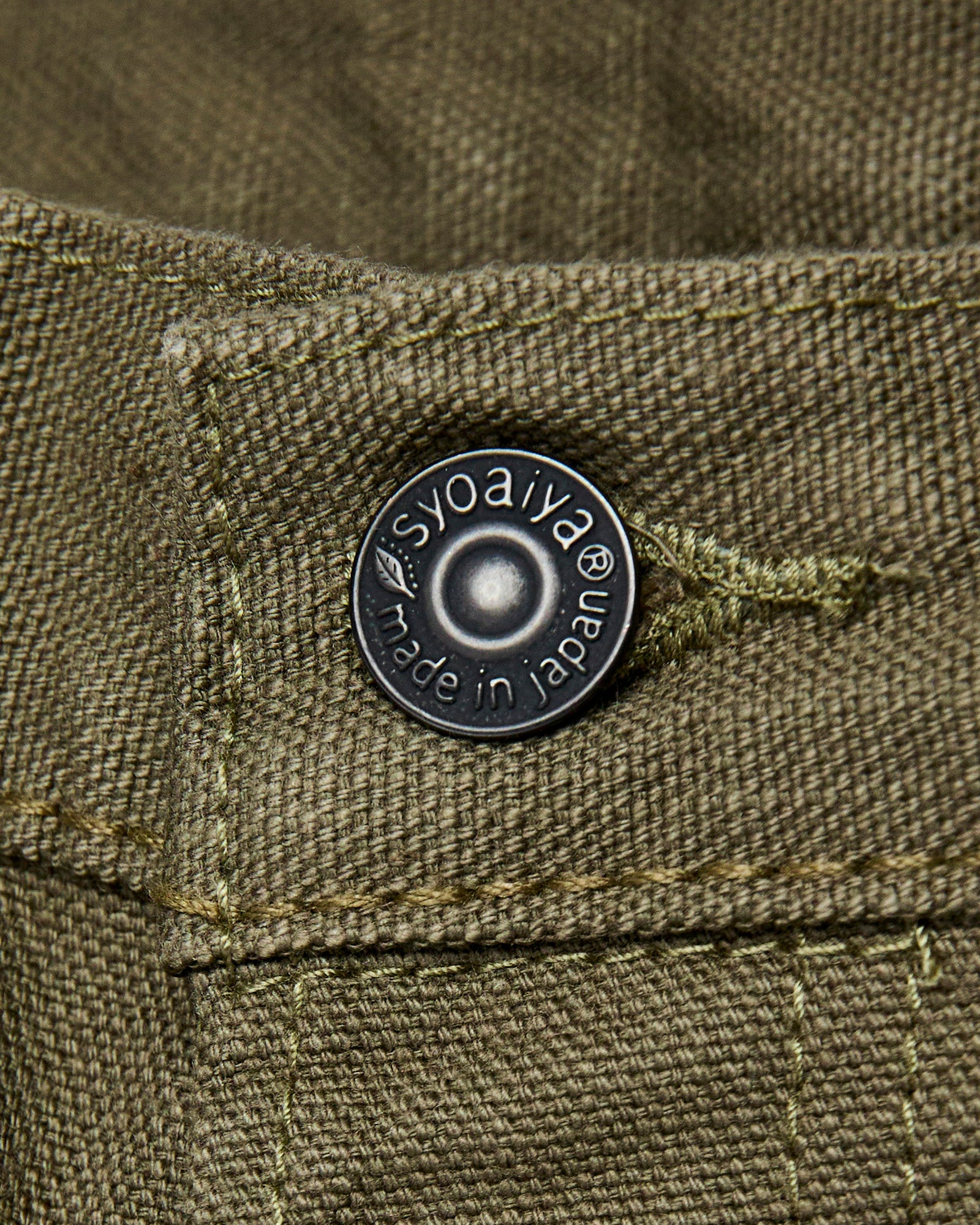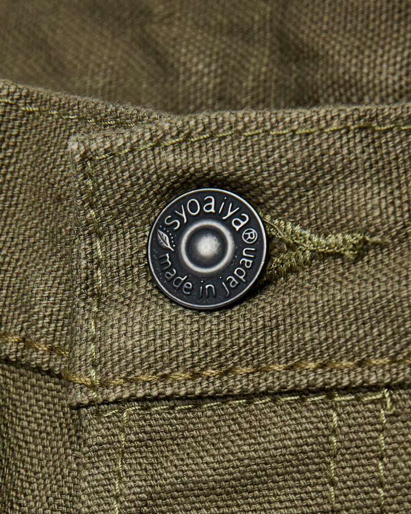 • Presented in a classic 5-pocket silhouette, Pure Blue Japan's 1175 Pant features a custom woven double-olive 13.5oz duck canvas fabric. Pure Blue Japan's heavyweight Duck Canvas fabric features a robust heft and rough-handed texture; complete with a faux selvedge ID on the interior. As with other styles in PBJ's catalog, the 1175 fabric is woven on an old-world shuttle loom using a specialized slow weaving technique to produce the unique texture the brand is renowned for. Finished with custom nickel buttons, a deerskin leather patch, and Pure Blue Japan indigofera leaf embroidery.