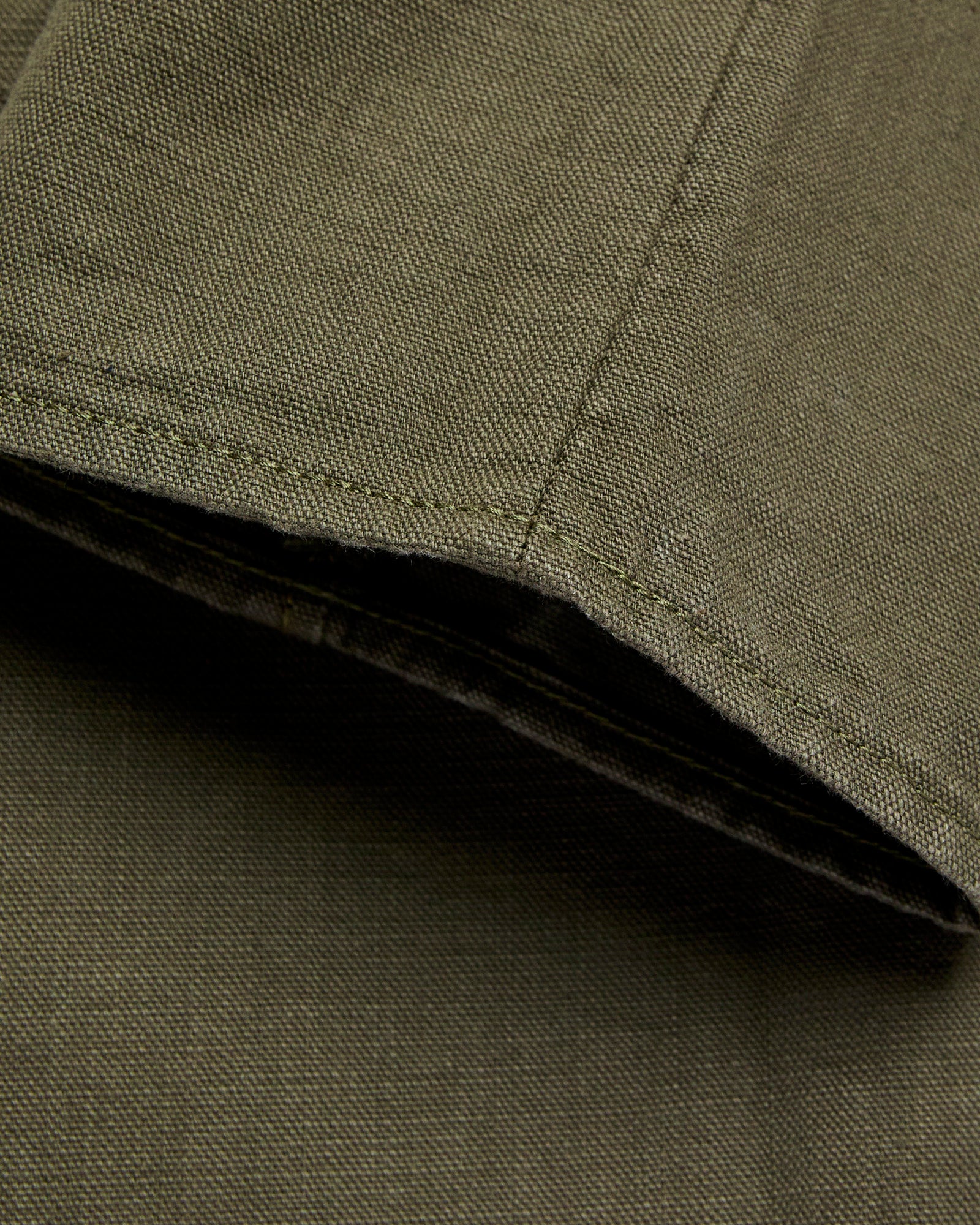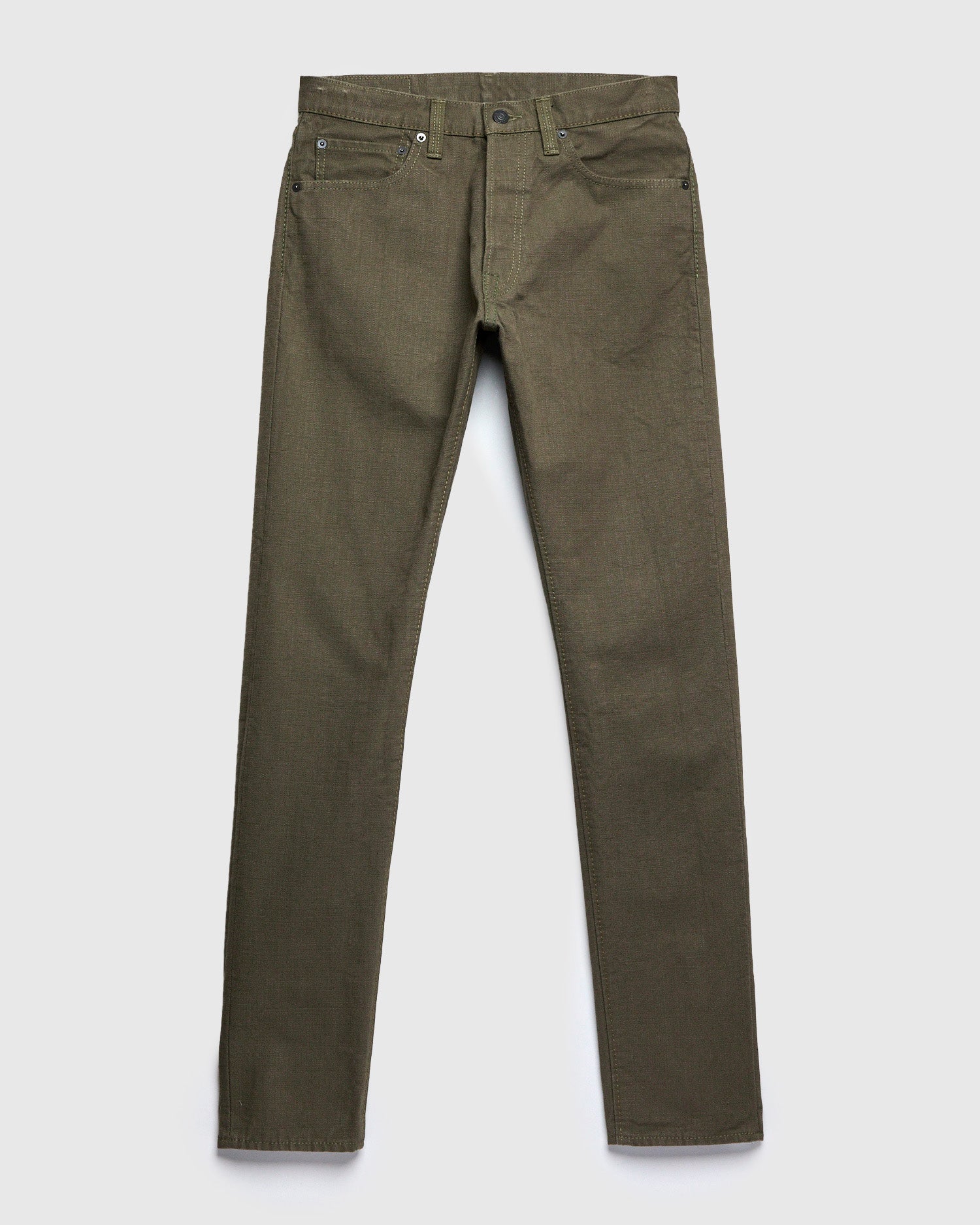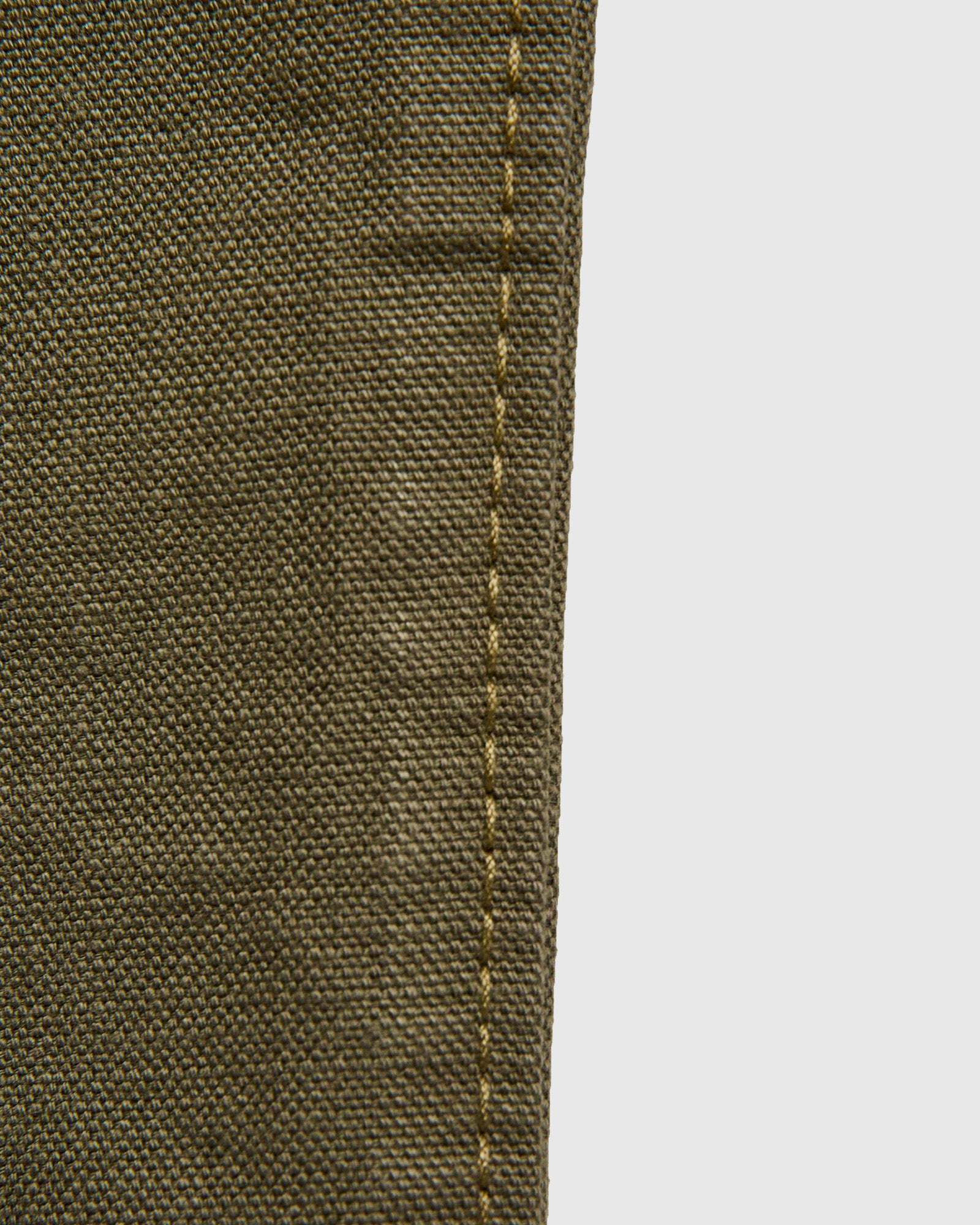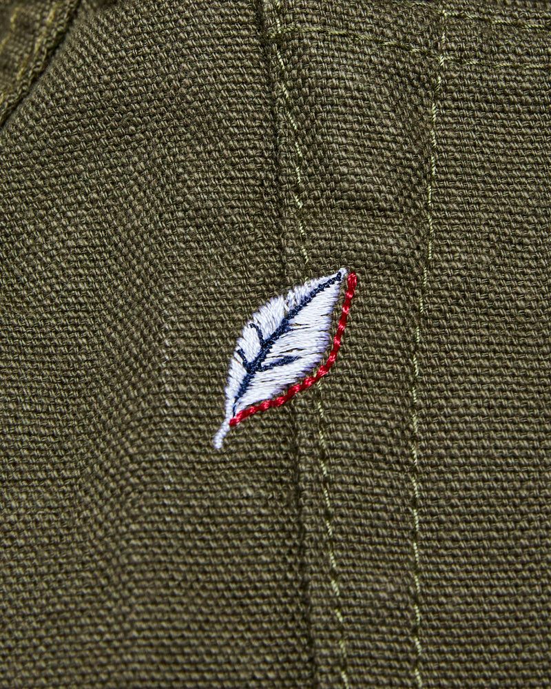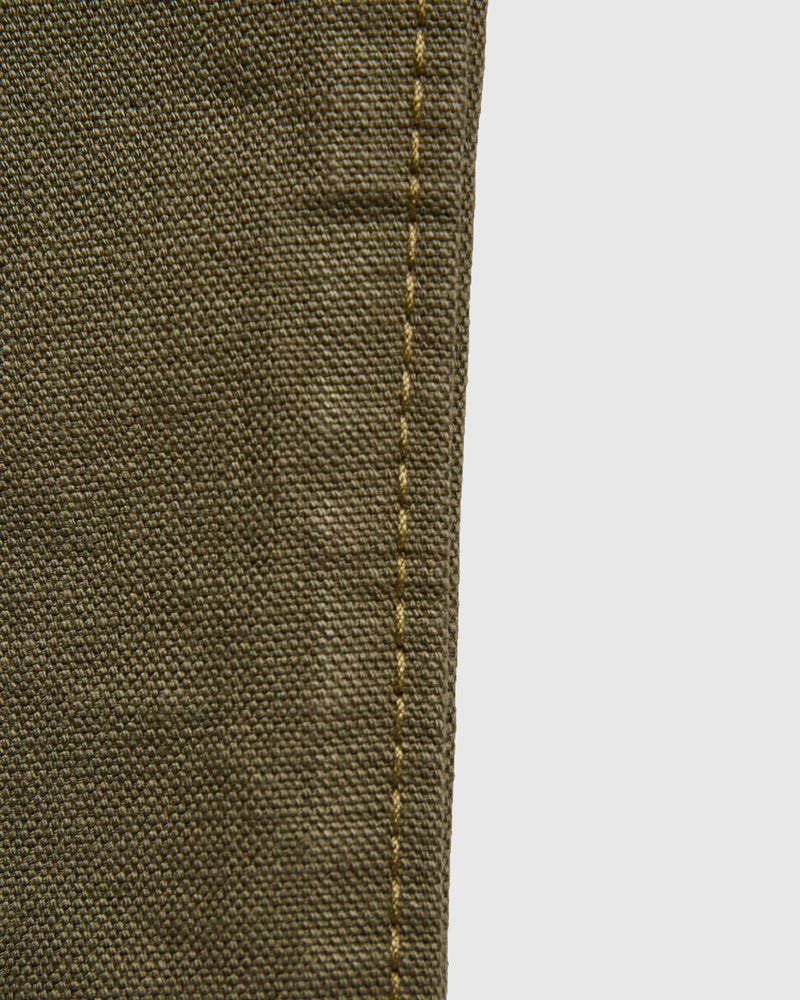• Presented in a classic 5-pocket silhouette, Pure Blue Japan's 1175 Pant features a custom woven double-olive 13.5oz duck canvas fabric. Pure Blue Japan's heavyweight Duck Canvas fabric features a robust heft and rough-handed texture; complete with a faux selvedge ID on the interior. As with other styles in PBJ's catalog, the 1175 fabric is woven on an old-world shuttle loom using a specialized slow weaving technique to produce the unique texture the brand is renowned for. Finished with custom nickel buttons, a deerskin leather patch, and Pure Blue Japan indigofera leaf embroidery.