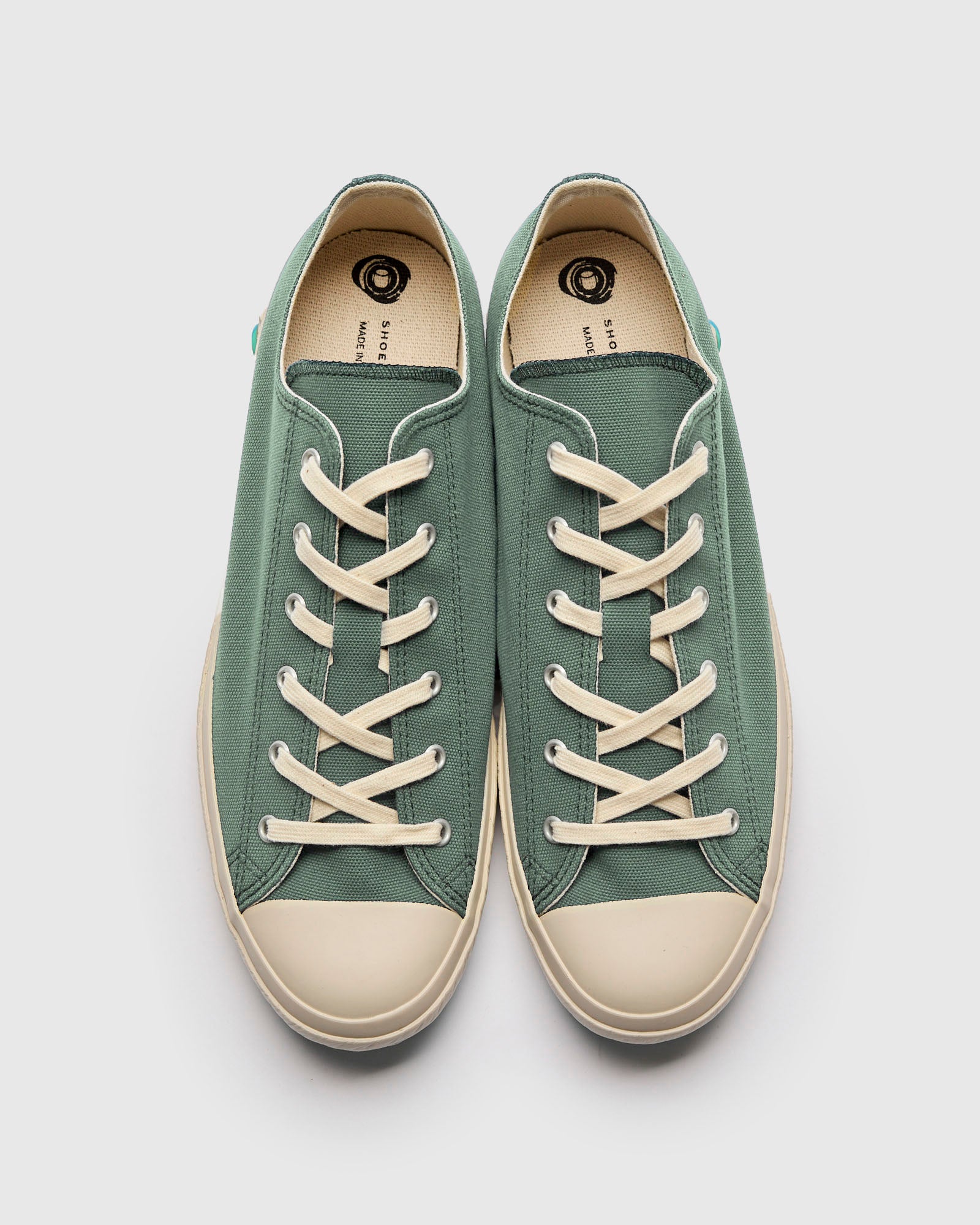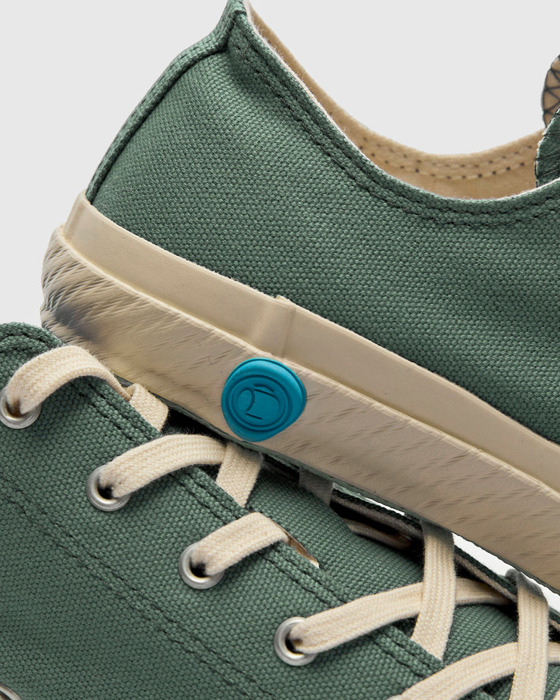 • The signature low top sneaker from Shoes Like Pottery is a flexible and durable canvas sneaker crafted in Japan. The sneaker was forged using the ancient Japanese technique "Ka-ryu" - a vulcanizing process that includes firing the outsoles in a kiln, giving each pair a unique texture and finish. The shoes are fitted with reinforced heels and toes, a cushioned in-sole, and the brand's signature rubber stamp and contrasting blue sole.