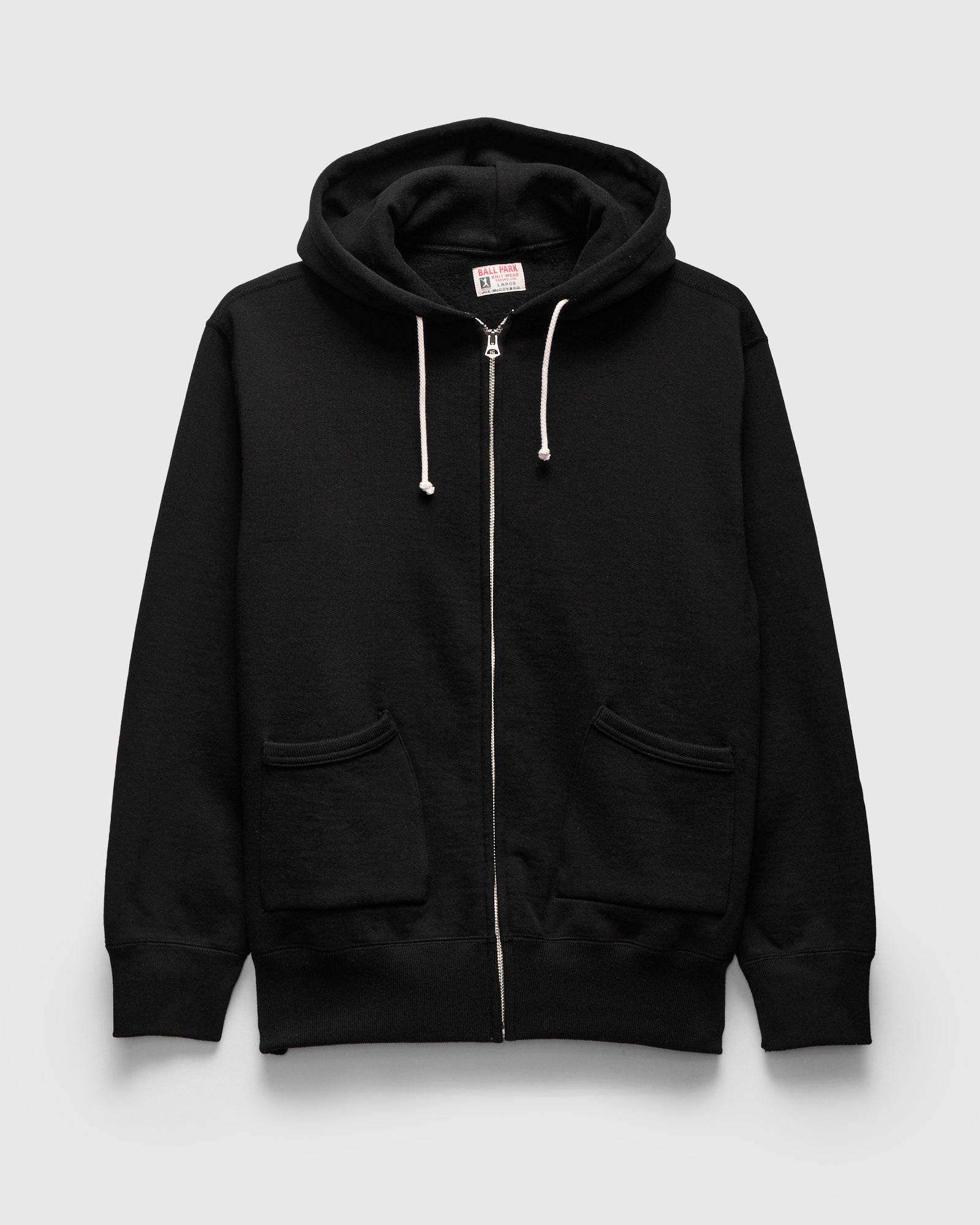 • Densely woven on vintage sinker knitting machines, the heavyweight Ball Park sweatshirt features a durable, tight weave and soft interior face. The sweatshirts are knit vertically, giving the garments their signature '50s era build and drape. The Full Zip features a custom front zipper, drawstring hood, and patch pockets at the waist.