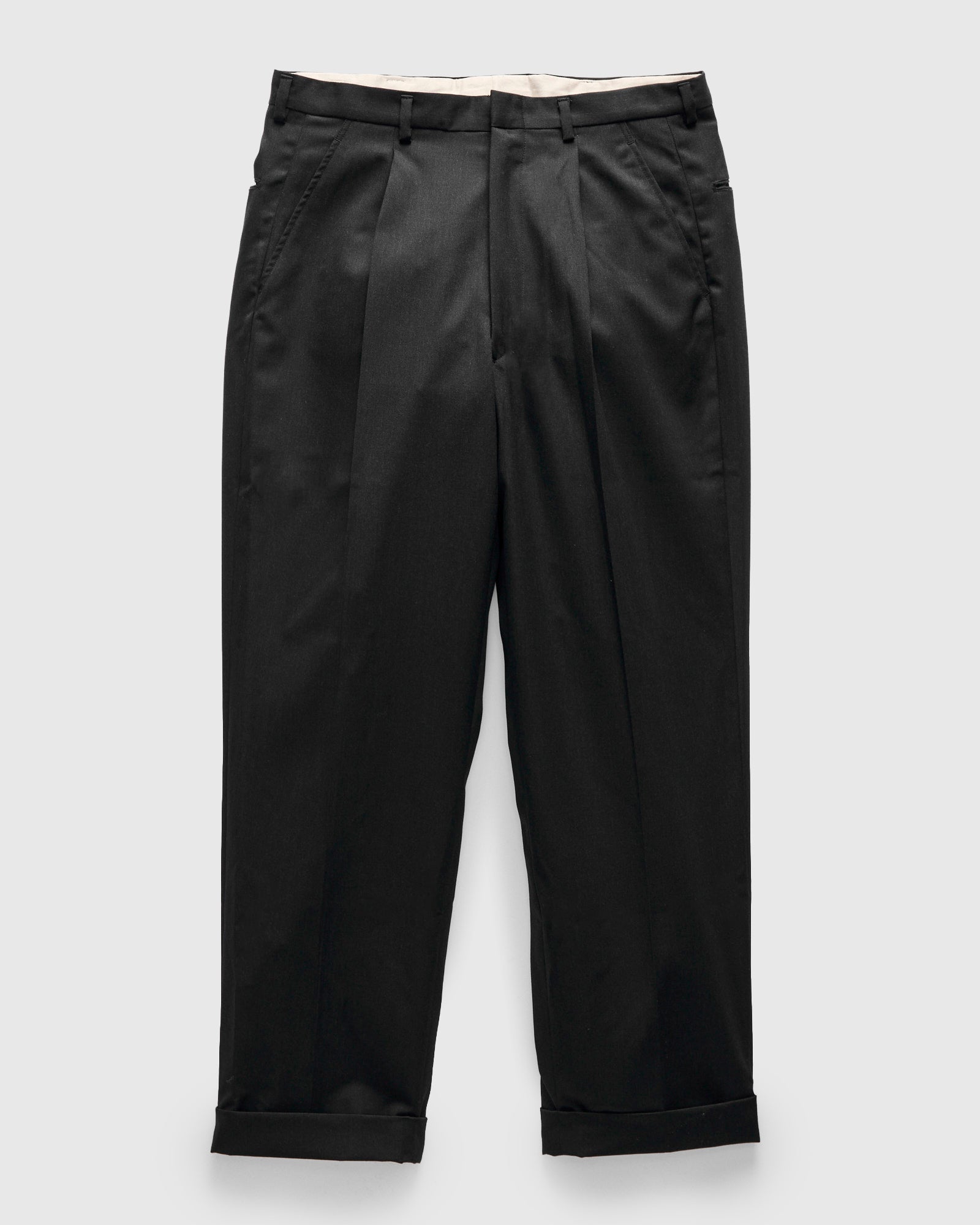 • The Single-Pleat Trousers are inspired by 1950s-60s slant-pocket trousers, crafted from a fluid wool twill fabric. Cut in a relaxed tapered silhouette, the design reflects the postwar shift in menswear toward civilian tailoring; where comfort, proportion, and ease of movement became central. The trousers are finished with slant pockets at the waist, rear welt pockets, and a set-in cuff hem.