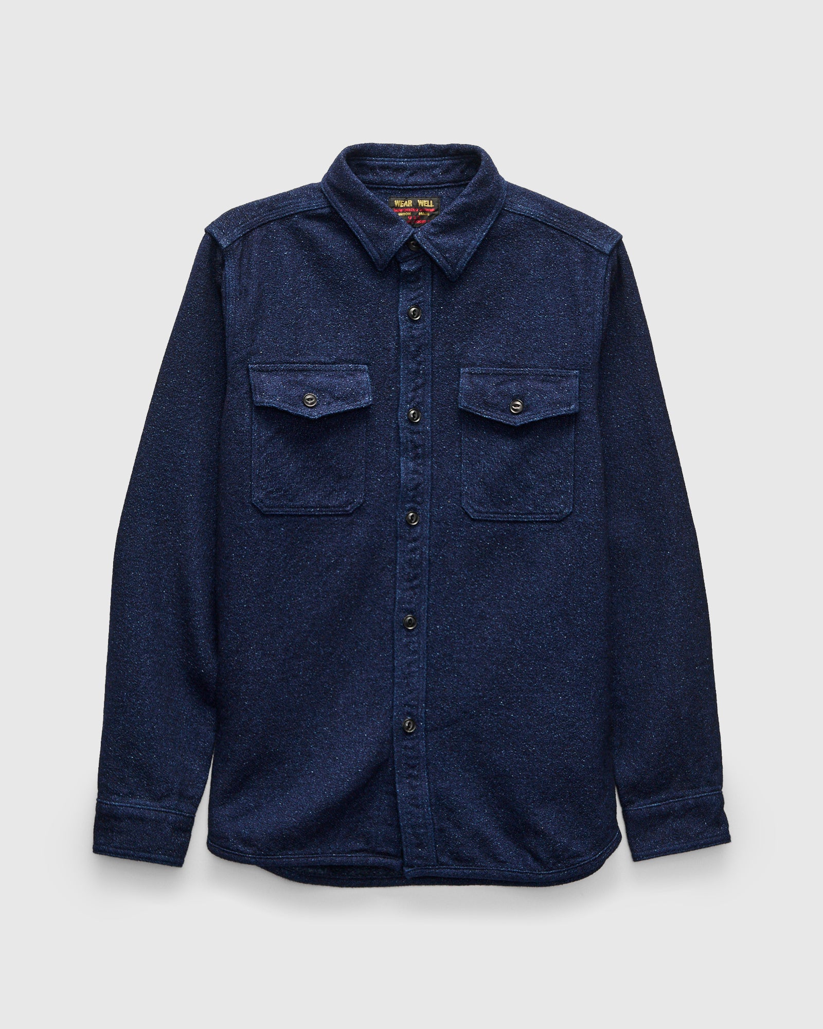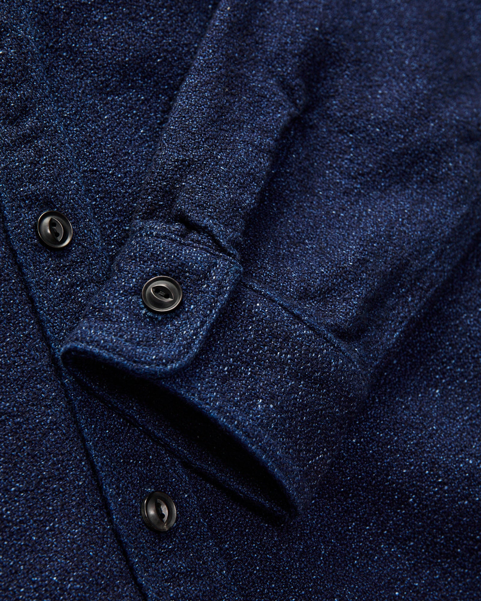 • Named after the great Norwegian explorer Roald Amundsen, this shirt from UES is crafted from extra-heavy 7-ply slub yarns, giving it a thick, voluminous feel suited for the harshest of conditions. Woven on vintage power looms with a production capacity of only 50 meters per day, this shirt features a textured fleck finish and deep rope-dyed indigo color that will develop a high contrast patina with wear. The shirt is finished with palm nut buttons, a soft brushed interior, and utility pockets at the chest.