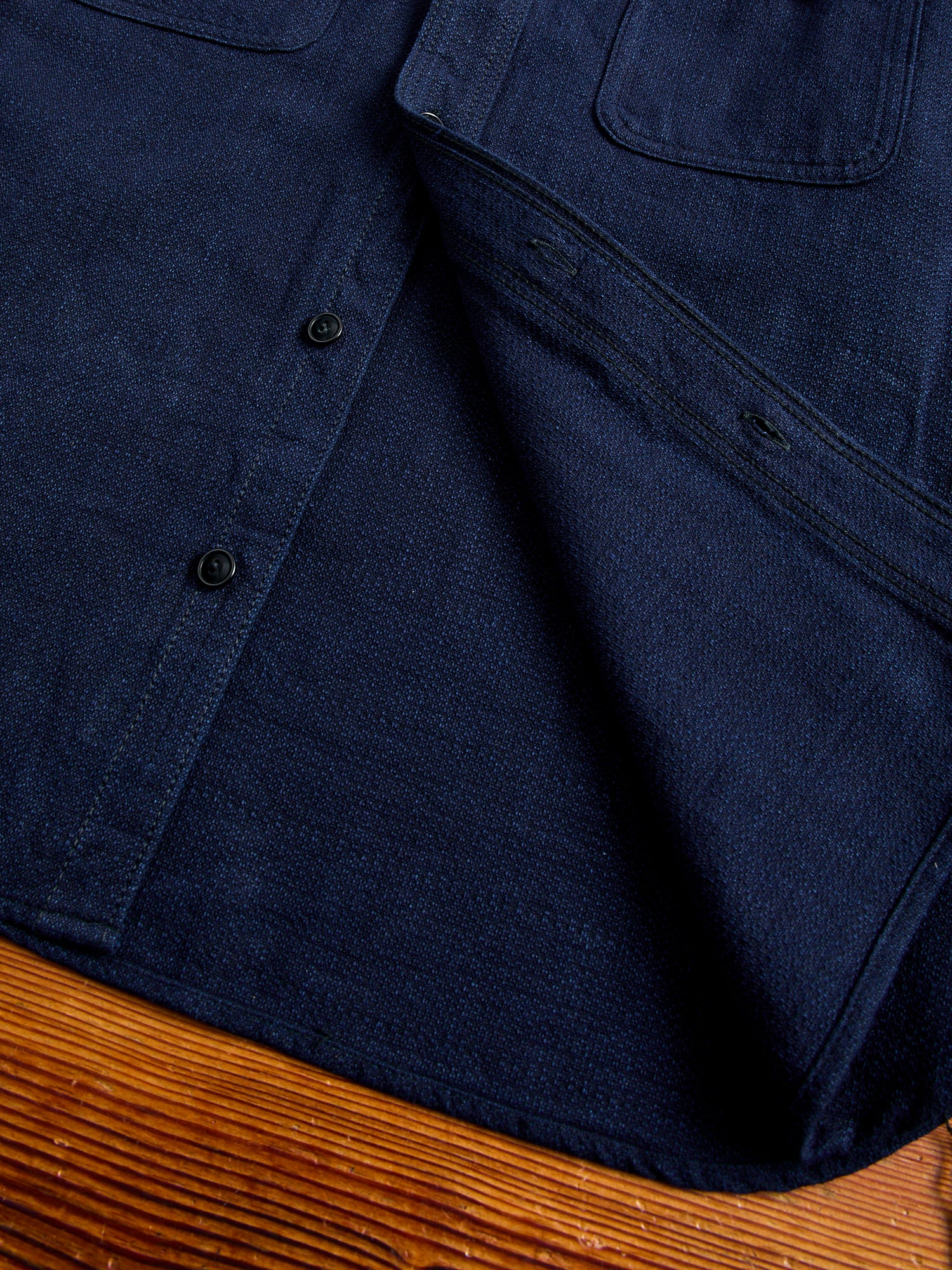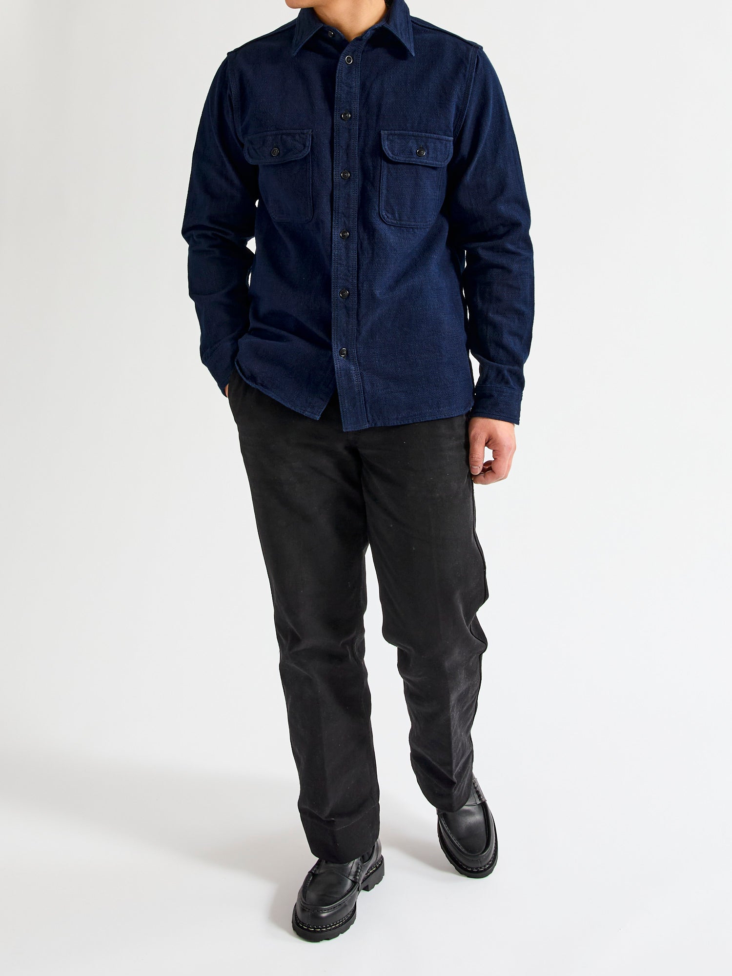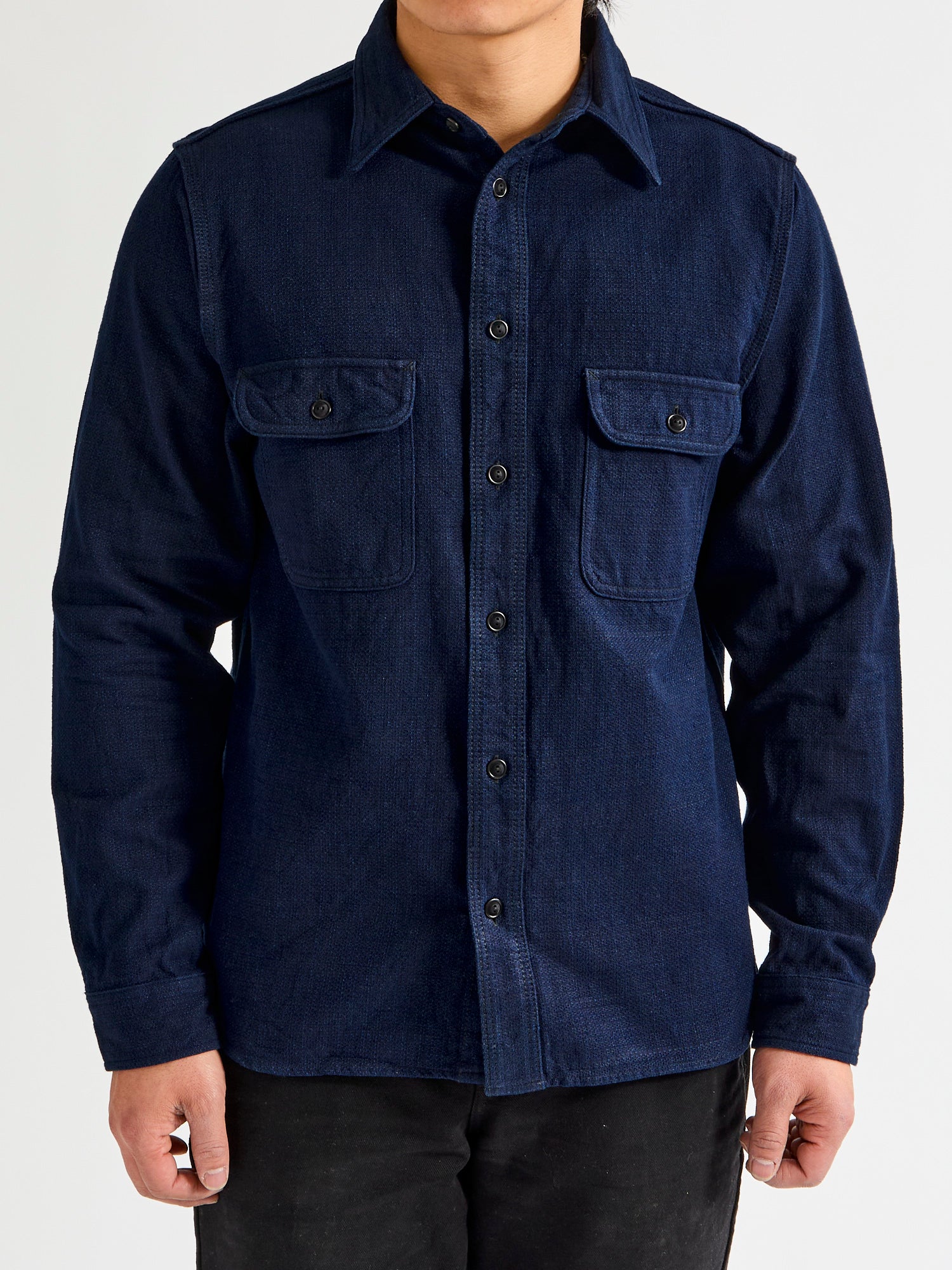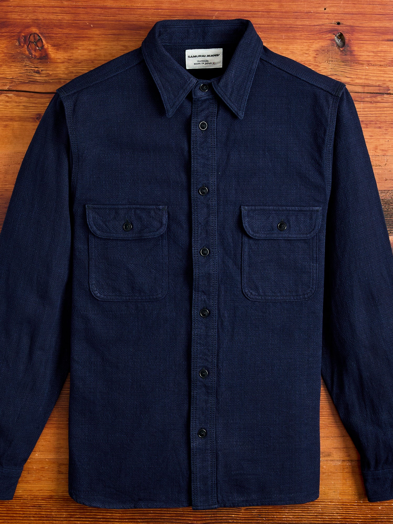• Cherished for their beautiful fabrics and detail-oriented construction, Samurai's shirting is crafted with the same level of expertise as the brand's denim. Crafted using Samurai's dobby weave Aimadara fabric, this shirt comes woven using a mix of natural indigo yarn highlighting the fabrics heavy texturing. This installment is cut in a regular fit and features chain-stitched side seams, gusseted side vents, utility chest pockets, and custom detailing accentuating the brands uniquely Japanese ethos.