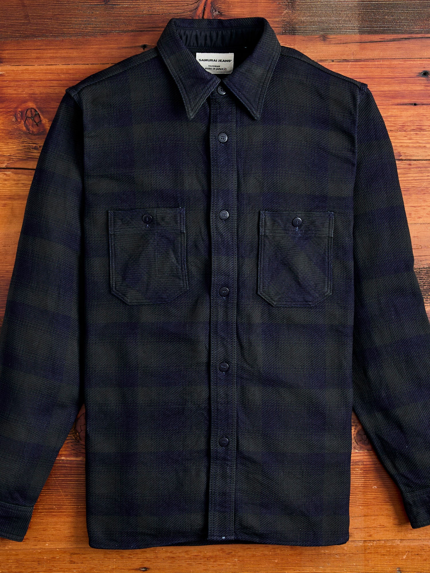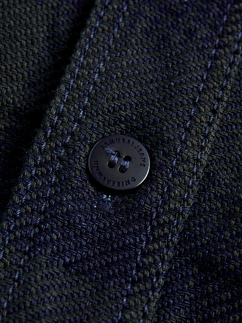 • Cherished for their beautiful fabrics and detail-oriented construction, Samurai's shirting is crafted with the same level of expertise as the brand's denim. Built tough, this shirt is constructed using a heavyweight flannel fabric woven from indigo rope-dyed yarns. This installment is cut in a regular fit and features chain-stitched side seams, gusseted side vents, asymmetrical chest pockets, and custom detailing accentuating the brands uniquely Japanese ethos.