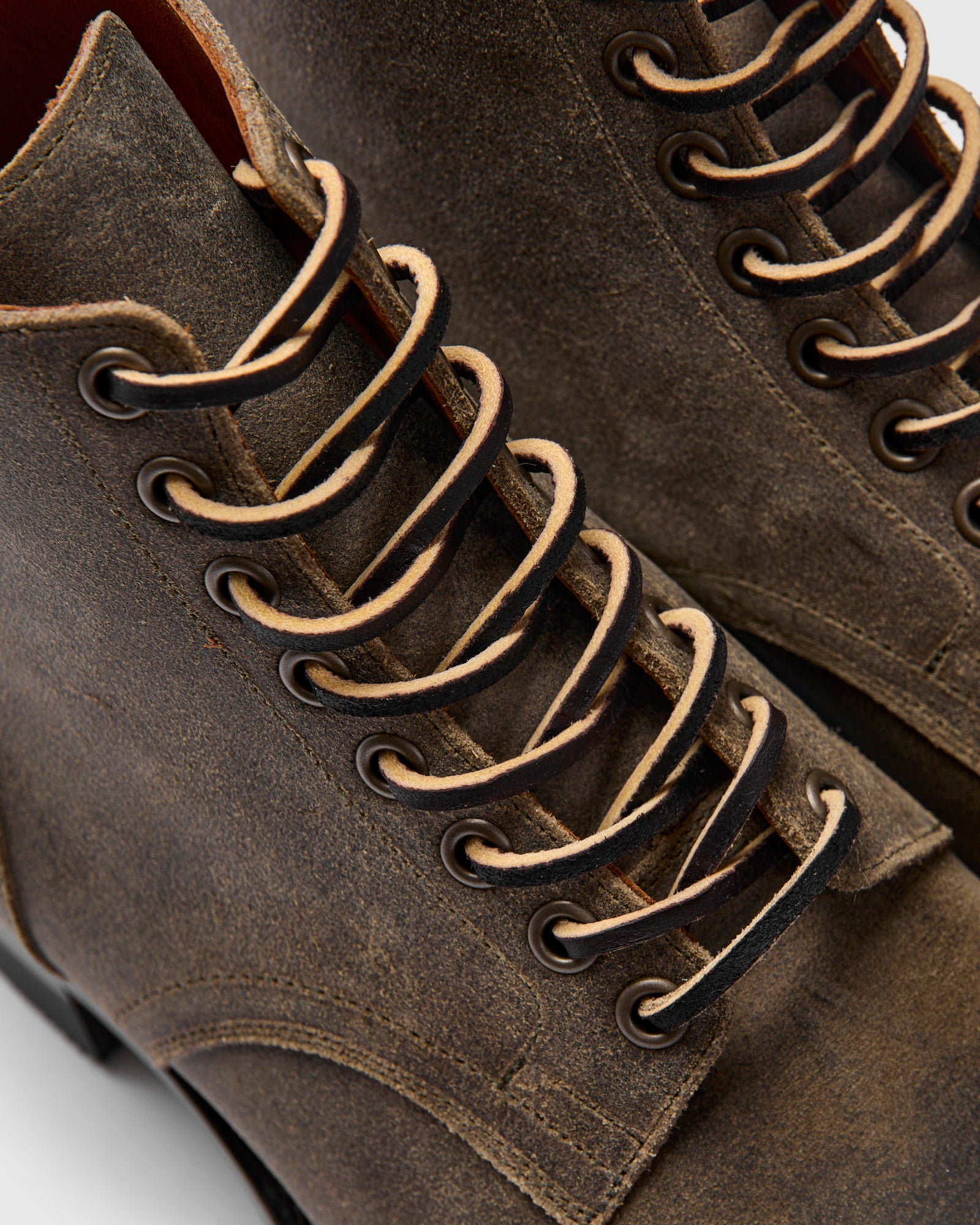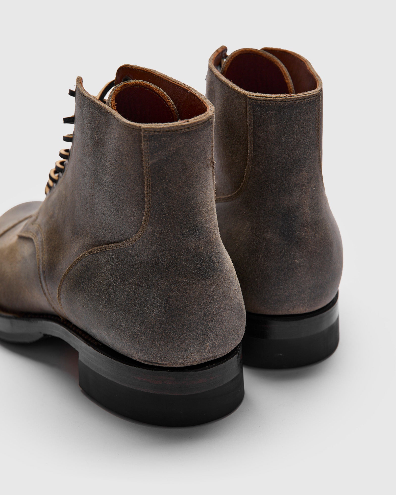 This iteration features a rugged tannage courtesy of C.F. Stead of Leeds, United Kingdom. C.F. Stead's Commander is a rugged, heavyweight waxed leather that has been specially cured to shrink and tighten the fibre structure, resulting in an extremely tough, durable, water-resistant waxed suede. It features a very waxy touch and high pull-up that allows for slow development of color and texture. The boots are anchored with a Dr. Sole original half sole fused together with Viberg's signature stitch-down construction. Finished with tonal stitching, branded leather insole, and metal eyelets.