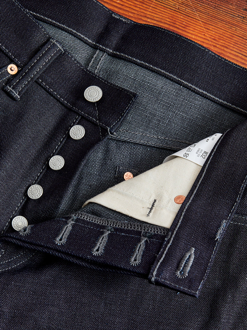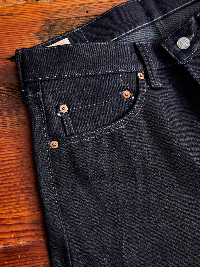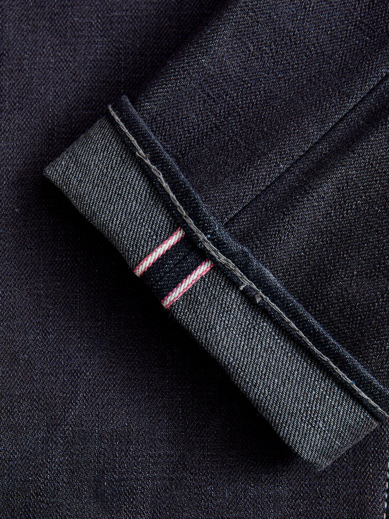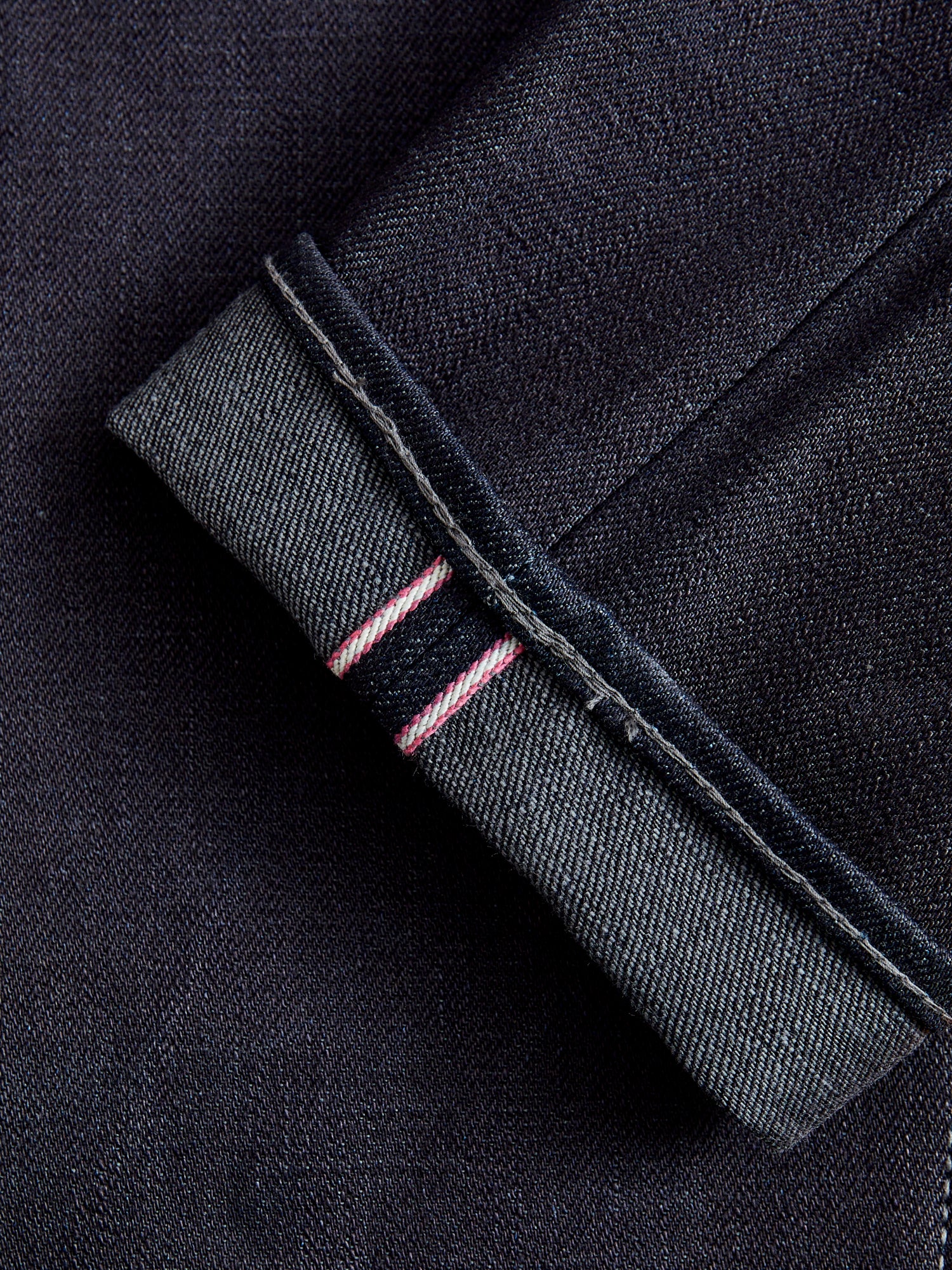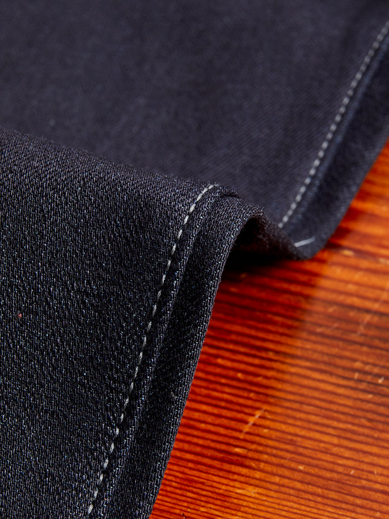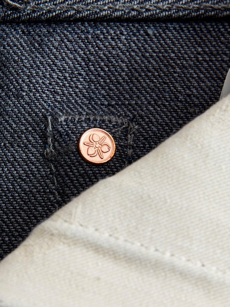 • Momotaro's Indigo x Grey Selvedge Denim features their original 18oz heavyweight selvedge fabric with a unique dark grey weft, creating a deep midnight-indigo hue. The denim is densely woven from long-staple Zimbabwe cotton, presenting a subtle slub texture, and is sanforized to minimize future shrinkage. Equipped with an ensemble of custom details and hardware including a limited grey deer skin leather patch, grey inseam stitching, and signature pink selvedge ID.
