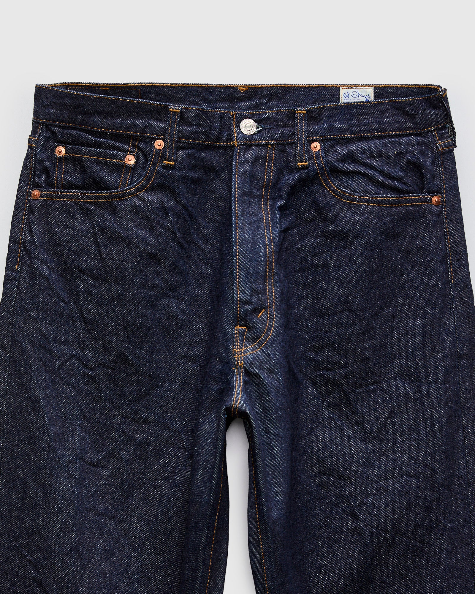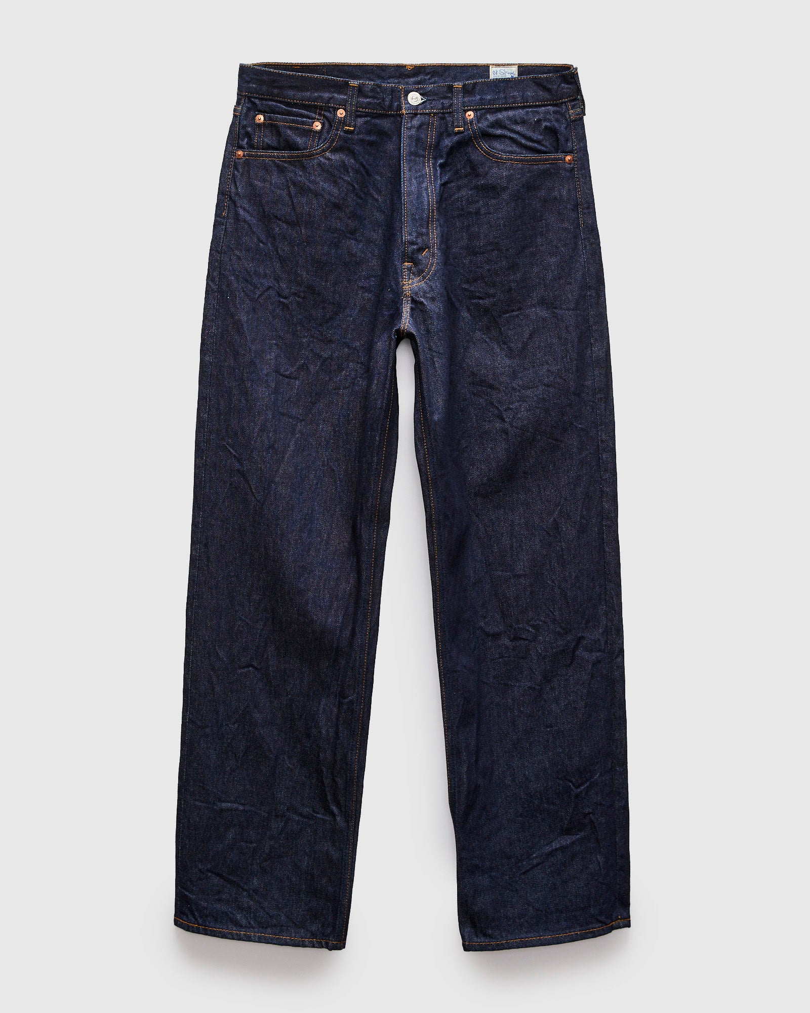 • orSlow's 101 jeans feature a 1990s era straight cut sewn using the brand's 13oz rinsed denim. Rinsed to eliminate shrinkage, the 13oz fabric features a vintage red-cast indigo and light-slub texture reminiscent of 90s era blue jeans. The Dad Fit is cut with a high-rise, roomy top-block, and classic straight-taper throughout the leg. Finished with paper waist patch, zipper-fly, and brass rivets throughout.