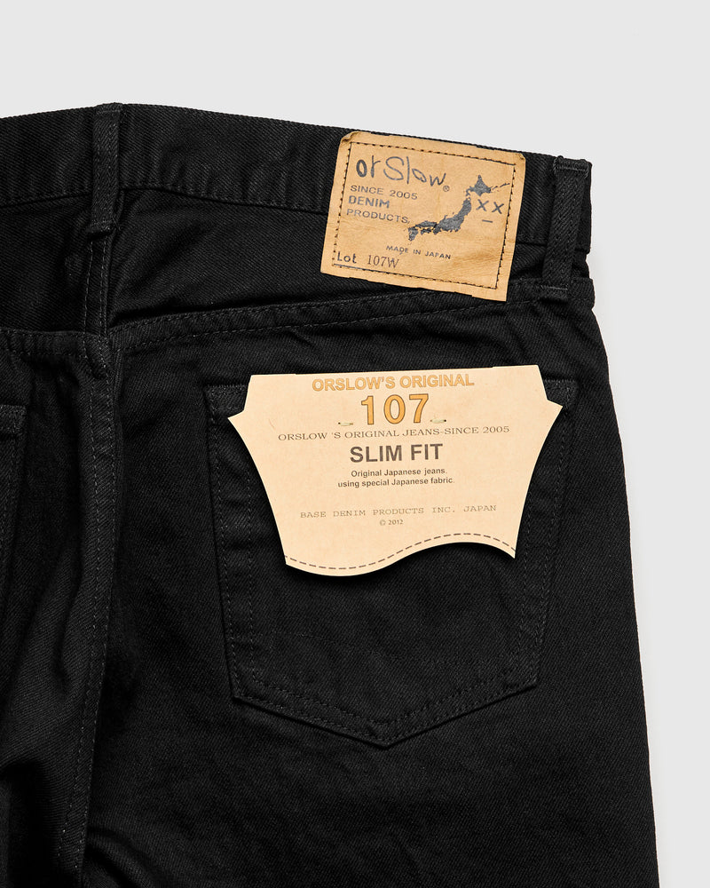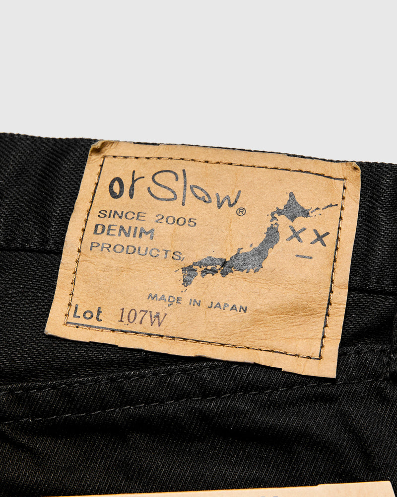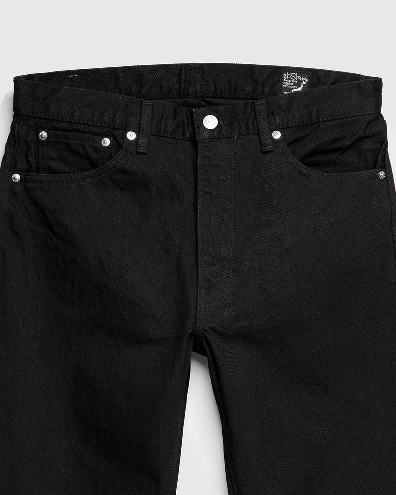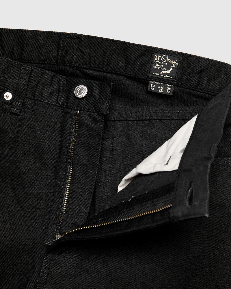 • orSlow's signature black jeans are cut from a 13.5oz Japanese denim that has undergone a pre-soak treatment for a softer more broken-in feel. The jeans sport a subtle brushed texture modeled after denim from lead designer Ichiro Nakasu's personal collection, and feature vintage-inspired detailing like oxidized rivets and a paper waist patch.