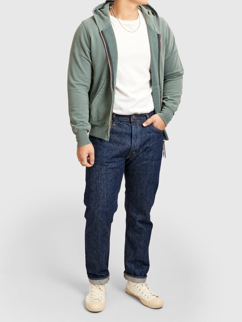 • orSlow's 107 Ivy fit features a tapered leg and a medium rise