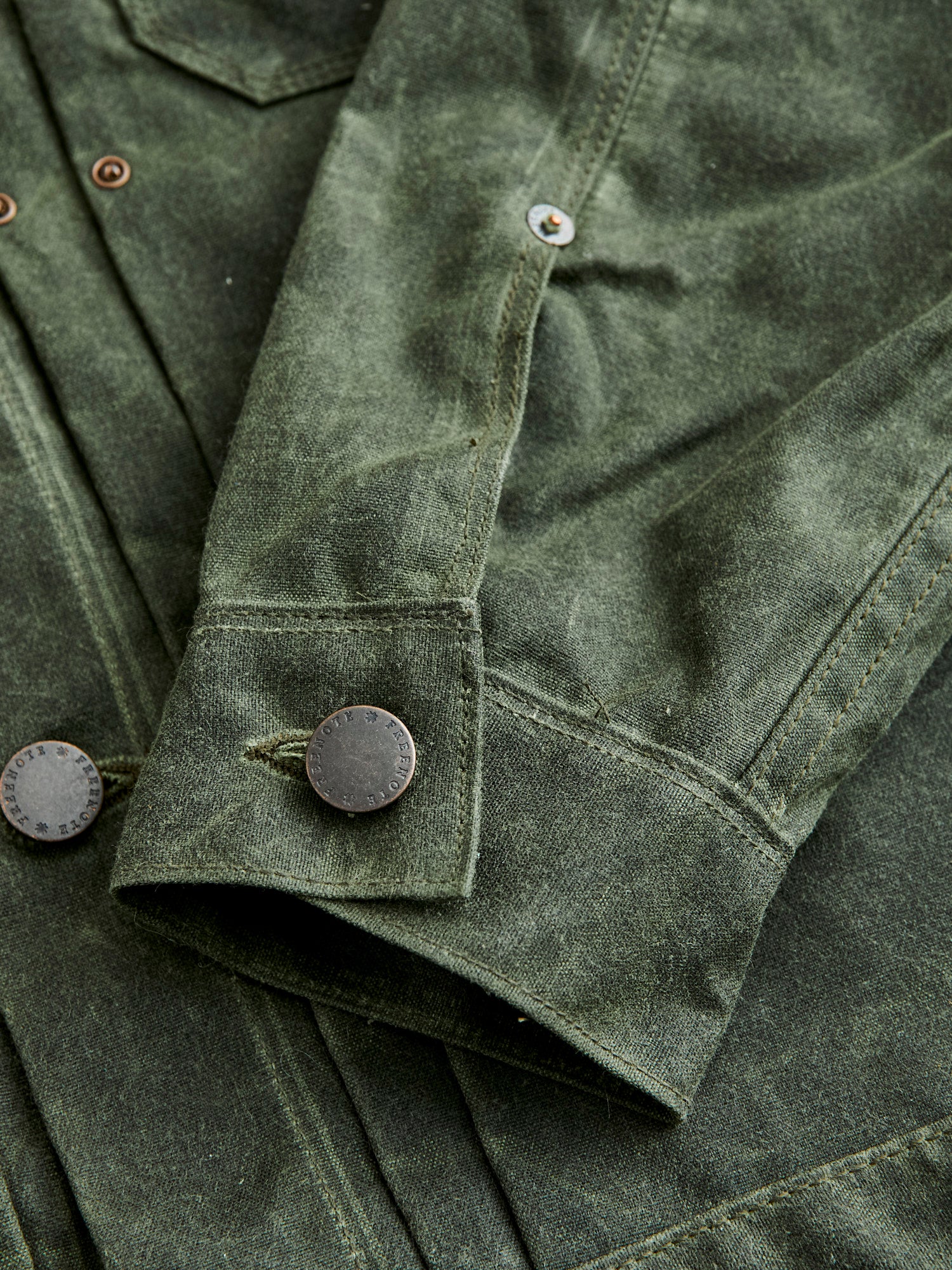 • The Riders Jacket from Freenote Cloth is a heritage design drawing from both ranch and classic rider jackets. Fitted with fully functional shoulder gussets, this installment is sewn using a 10oz Martexin waxed canvas for extra protection against the rain. The interior of the jacket features a custom Navajo-inspired jacquard liner, along with fully lined satin sleeves. Finished with custom metal hardware from Kentucky, double needle construction, and an array of functional pockets throughout.