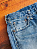 • The 1101 Dartford pays homage to Rolling Stones legend Mick Jagger, through a hand-distressed, washed denim modeled after jeans worn by Jagger throughout the 1960s. Made from the brand's original 13.75oz Japanese selvedge denim, the jeans are crafted from durable long-staple Zimbabwe cotton and feature signature Fullcount detailing. The jeans sport a light indigo color with light blond hues, and are purposefully hand-distressed to replicate the look and feel of vintage denim. Cut in Fullcount's original straight fit with a roomy silhouette throughout the leg and finished with custom detailing