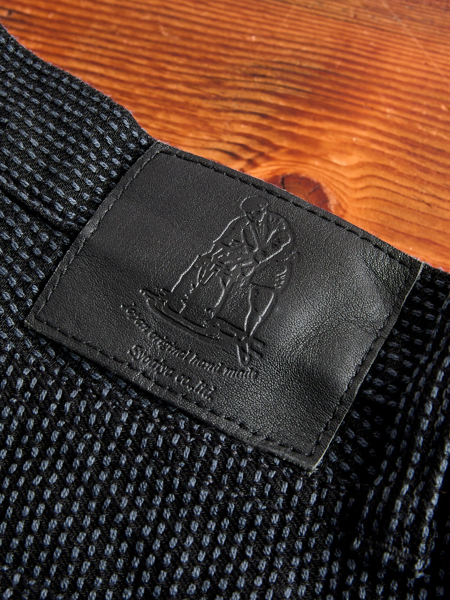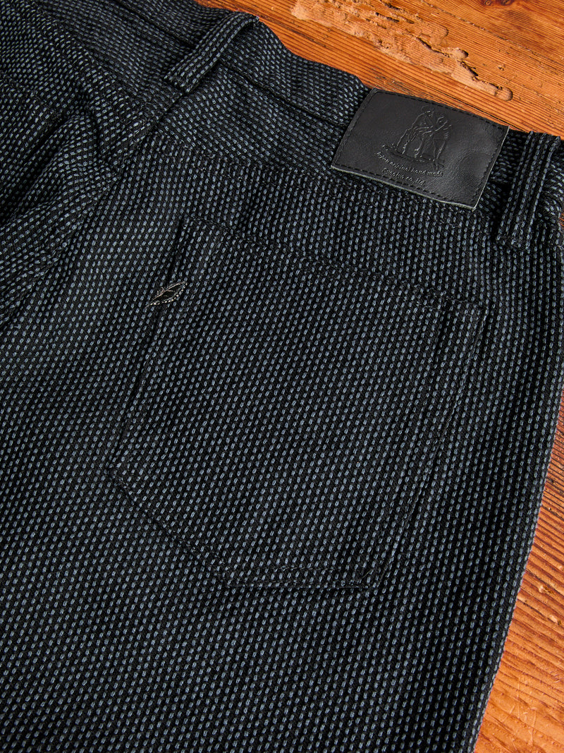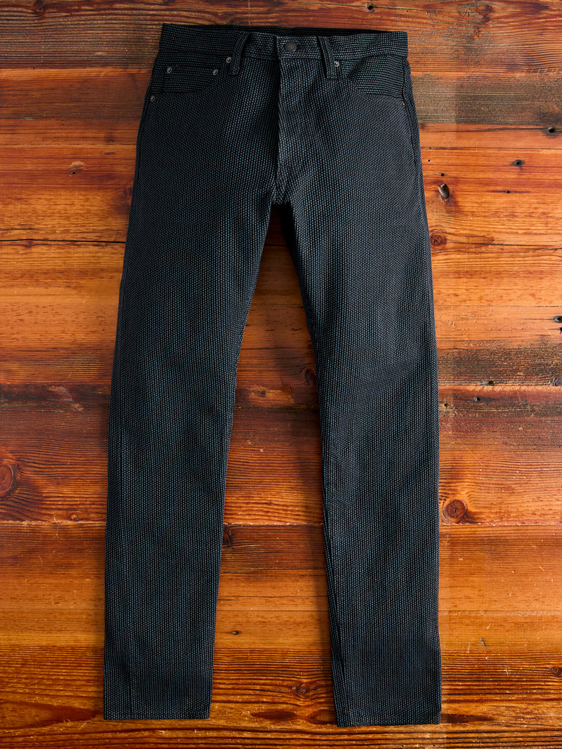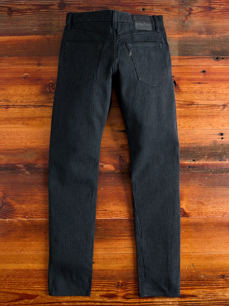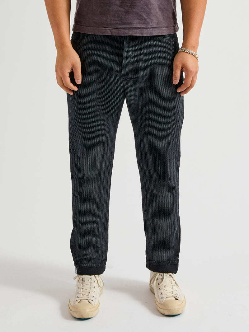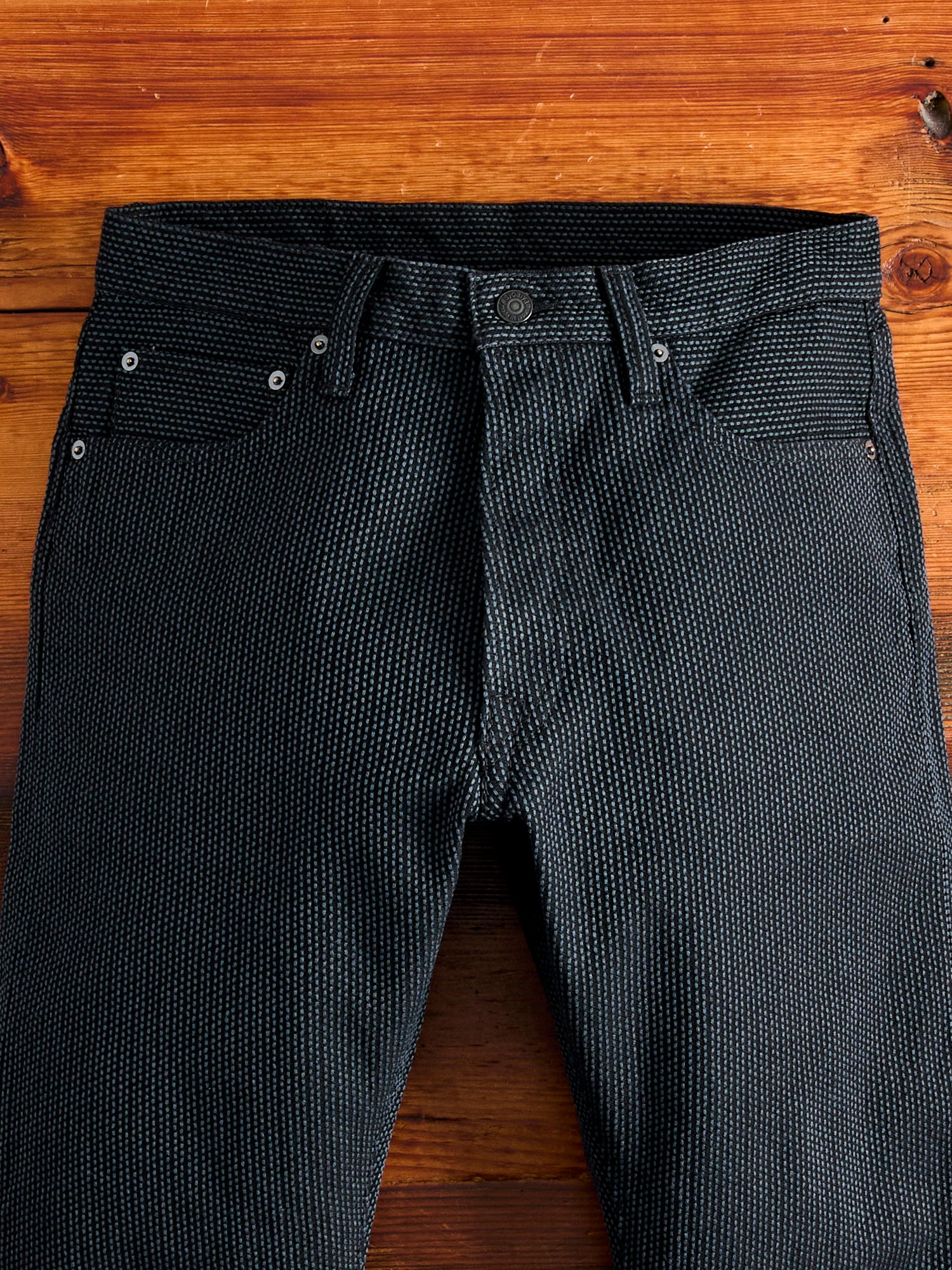 • Pure Blue Japan's sashiko stitch denim is custom woven using a jacquard weave process, offering a medium-weight fabric with a pronounced slub texture. Produced in small batches, the denim is sulfur-dyed, allowing it to fade and develop a unique patina over time. Crafted in a classic five-pocket silhouette, the jeans are finished with custom nickel buttons, a deerskin leather patch, and Pure Blue Japan's signature indigofera leaf embroidery.