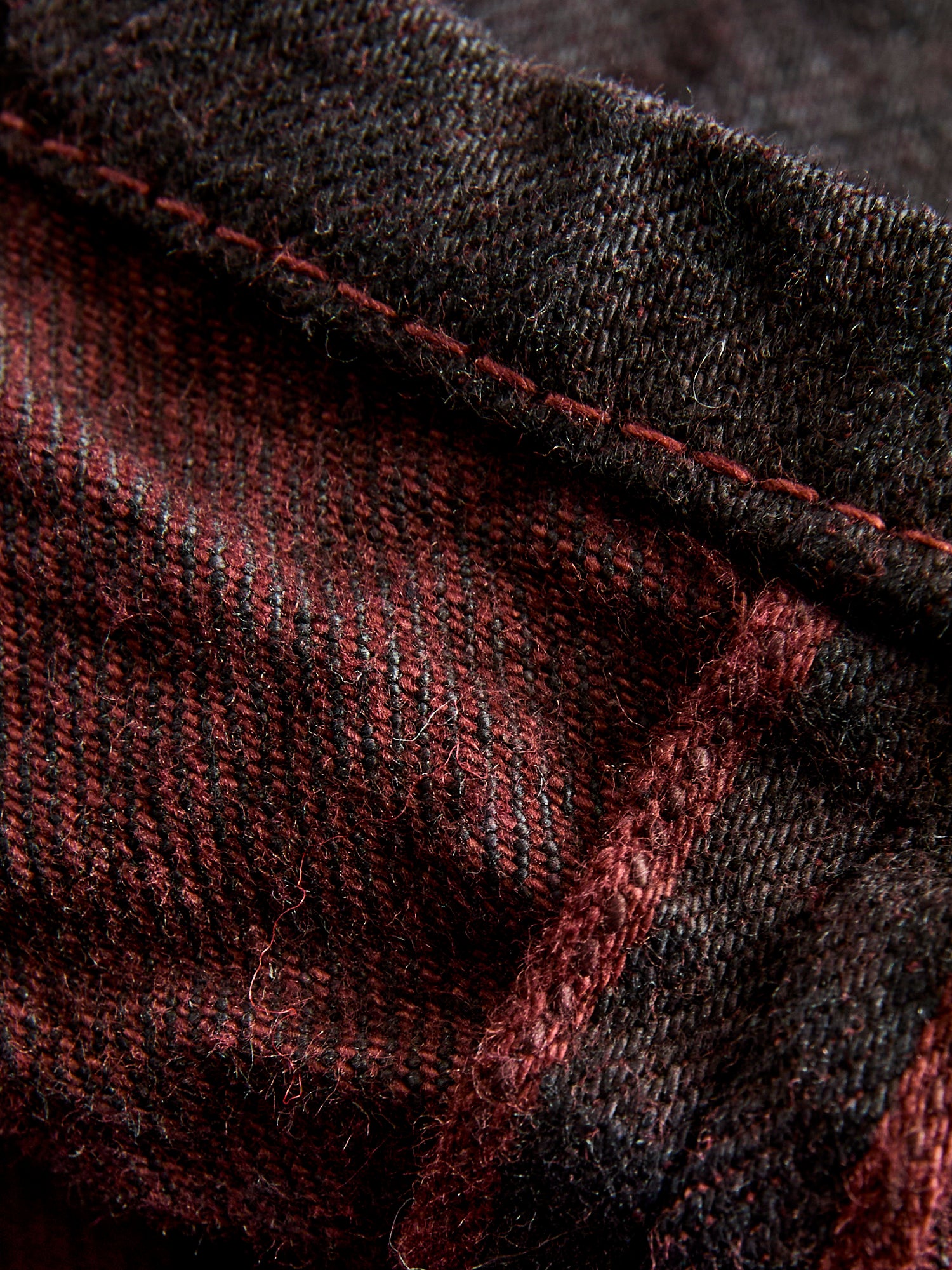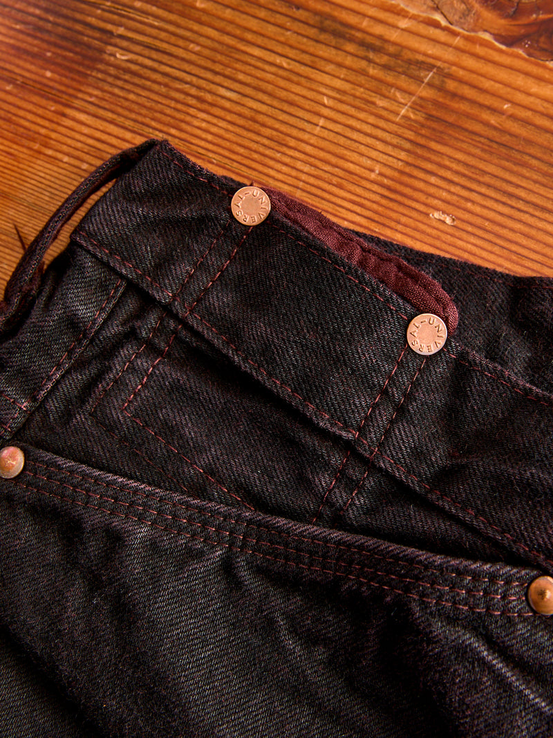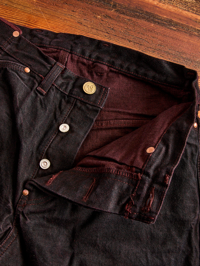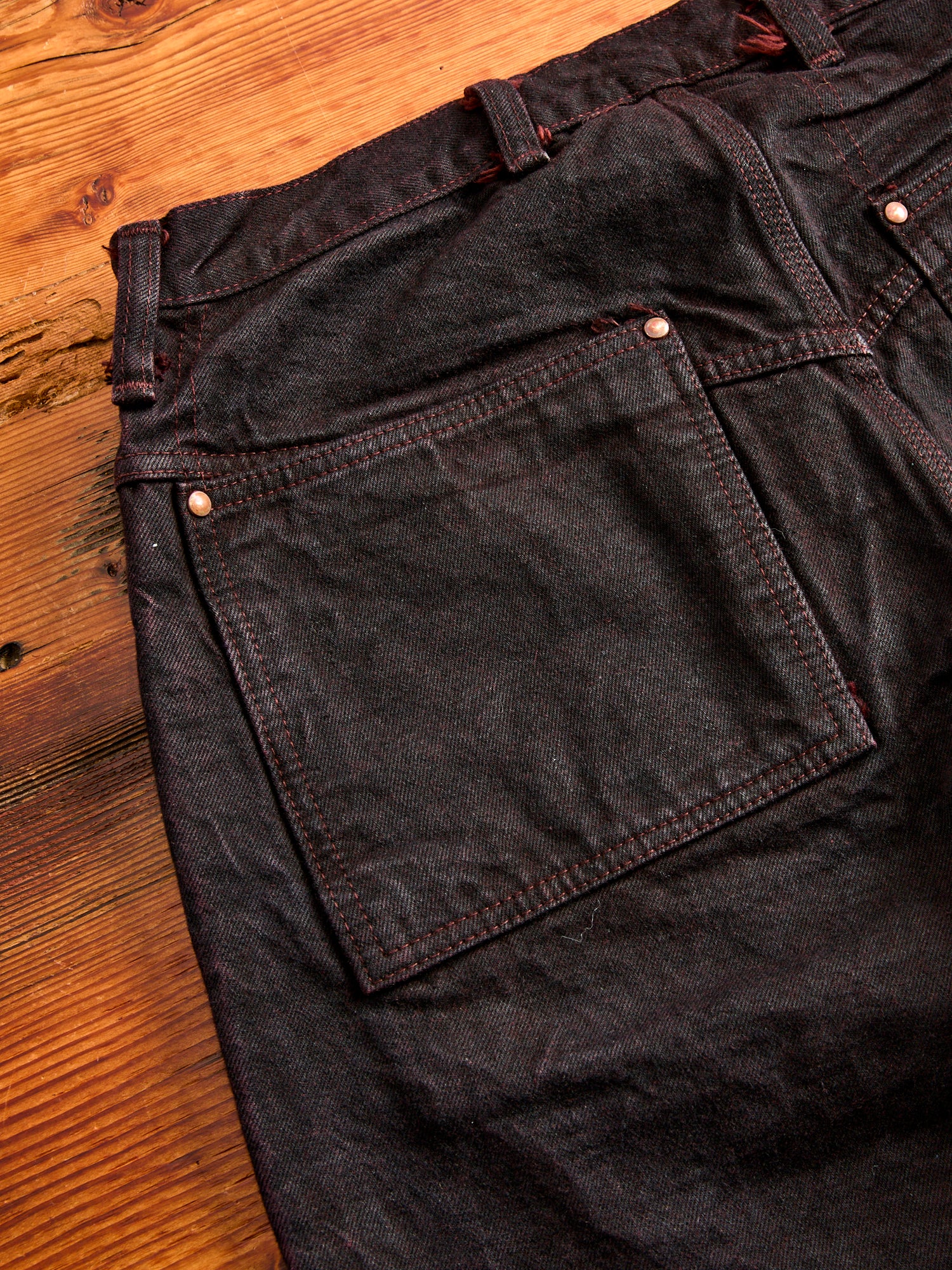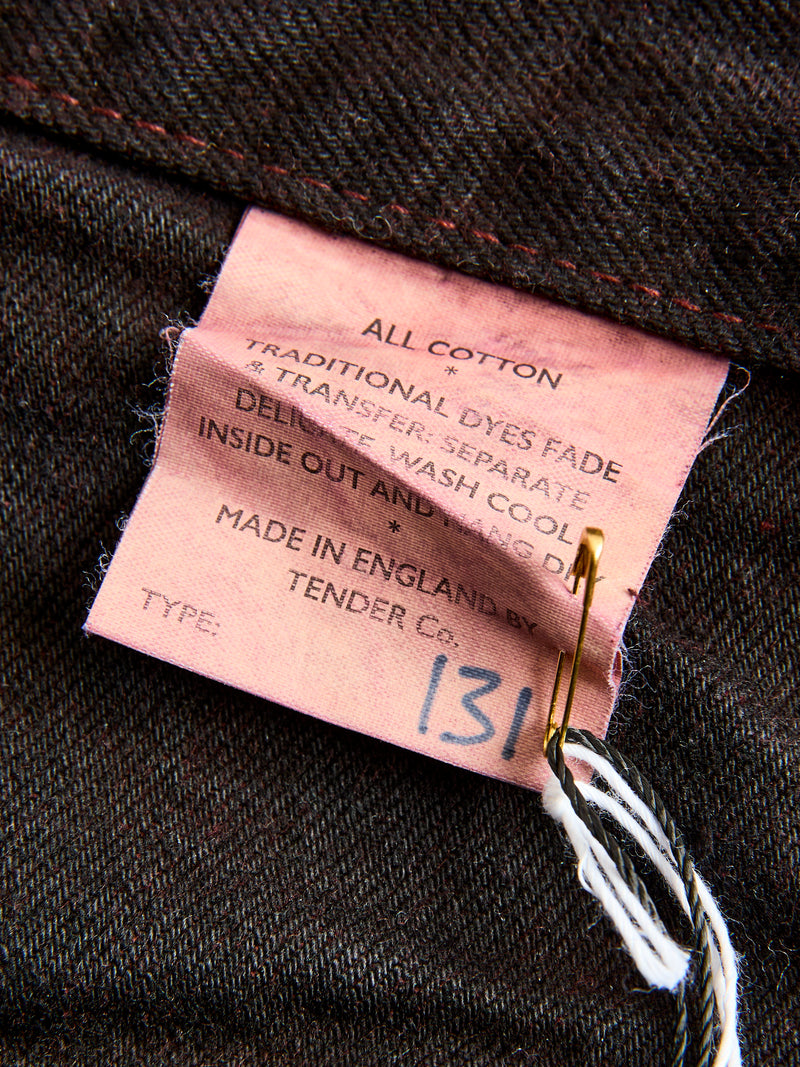 • Tender's Type 130 Jeans are crafted from a 16oz Japanese selvedge denim and cut and sewn in England. This edition receives its color from a hadal overdye: a reactive dye process designed to achieve the deepest color possible. The "hadal" name references Hades, the Greek god of the underworld, as well as the deepest oceanic zone. This season's "Library" color is so-named for the traditional maroon-brown leather binding of library books. The jeans feature a modified five-pocket silhouette with straight cut front pockets, and come finished with rounded rivets, filled belt loops, and a custom Tender branded top-button.