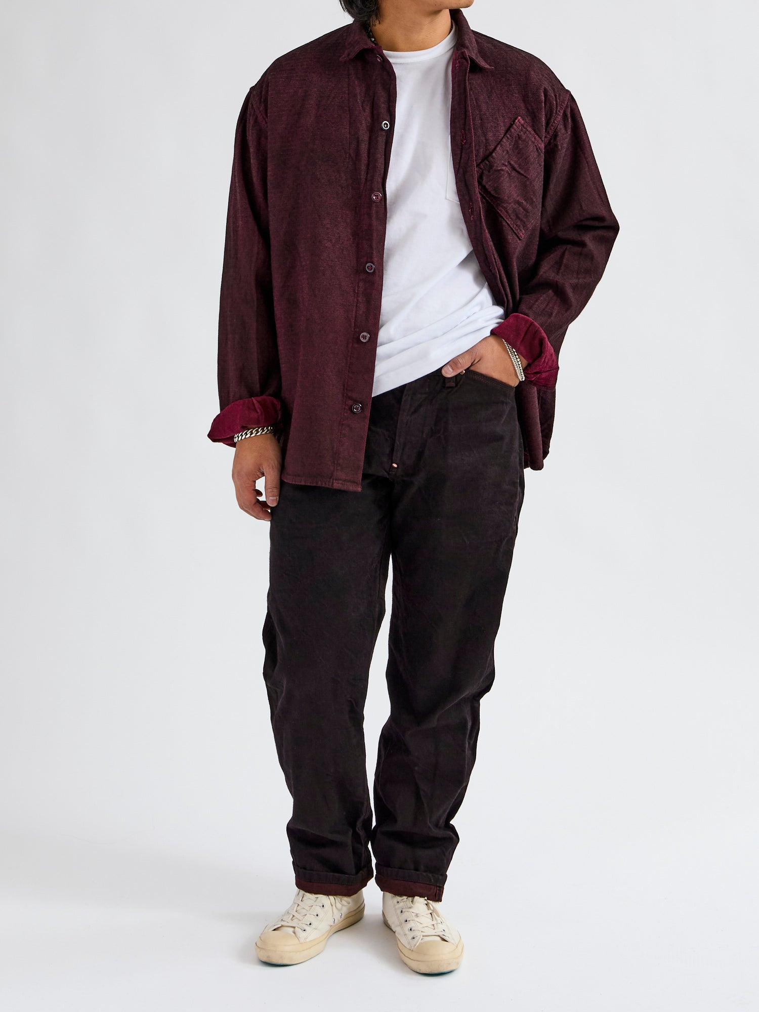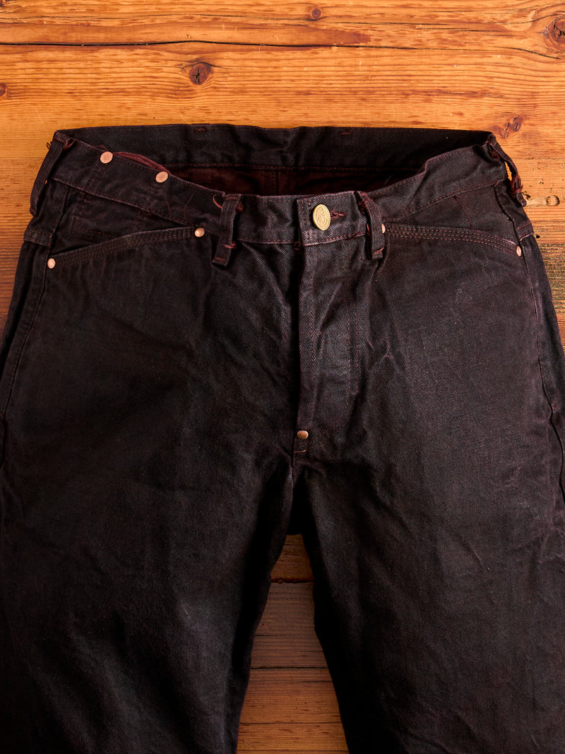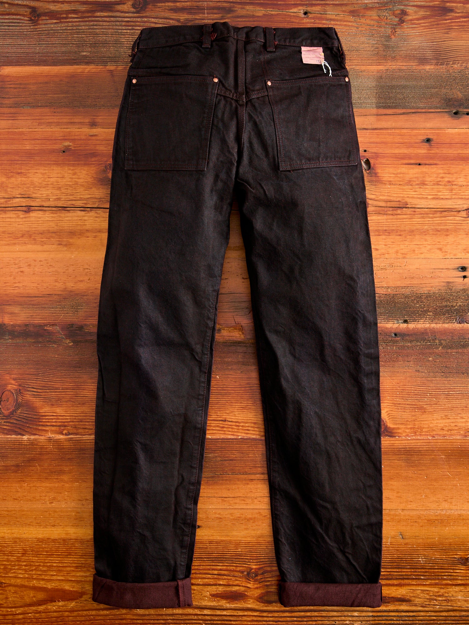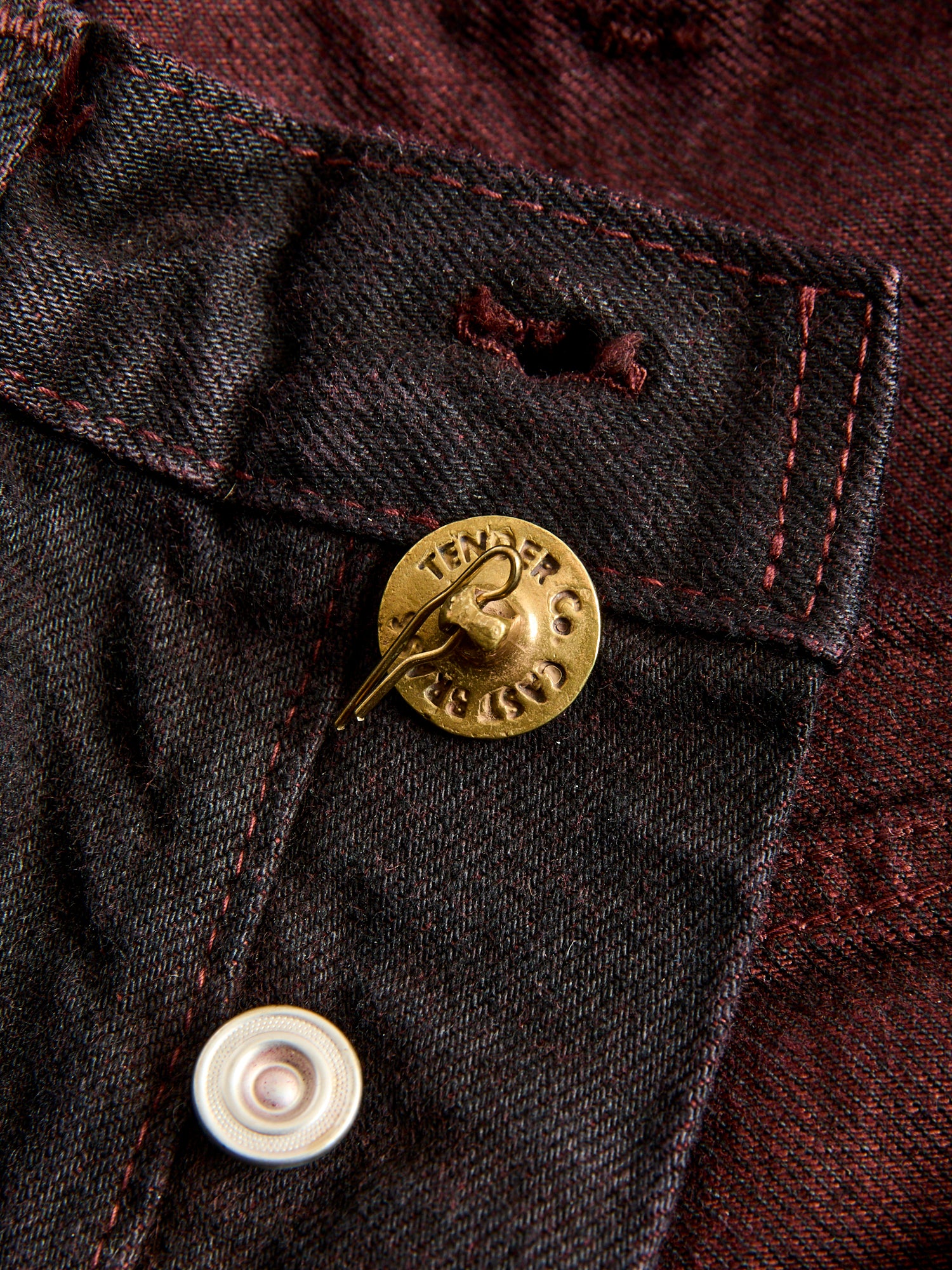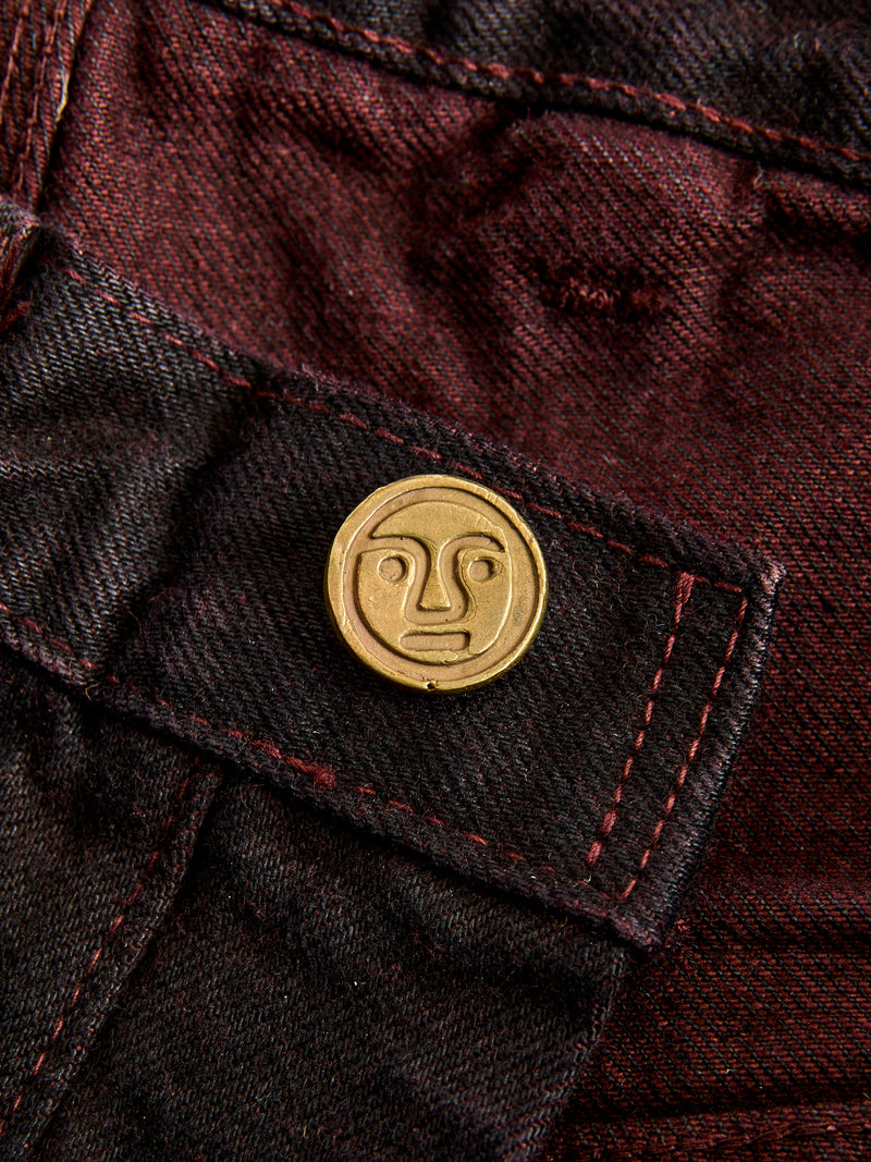 • Tender's Type 130 Jeans are crafted from a 16oz Japanese selvedge denim and cut and sewn in England. This edition receives its color from a hadal overdye: a reactive dye process designed to achieve the deepest color possible. The "hadal" name references Hades, the Greek god of the underworld, as well as the deepest oceanic zone. This season's "Library" color is so-named for the traditional maroon-brown leather binding of library books. The jeans feature a modified five-pocket silhouette with straight cut front pockets, and come finished with rounded rivets, filled belt loops, and a custom Tender branded top-button.