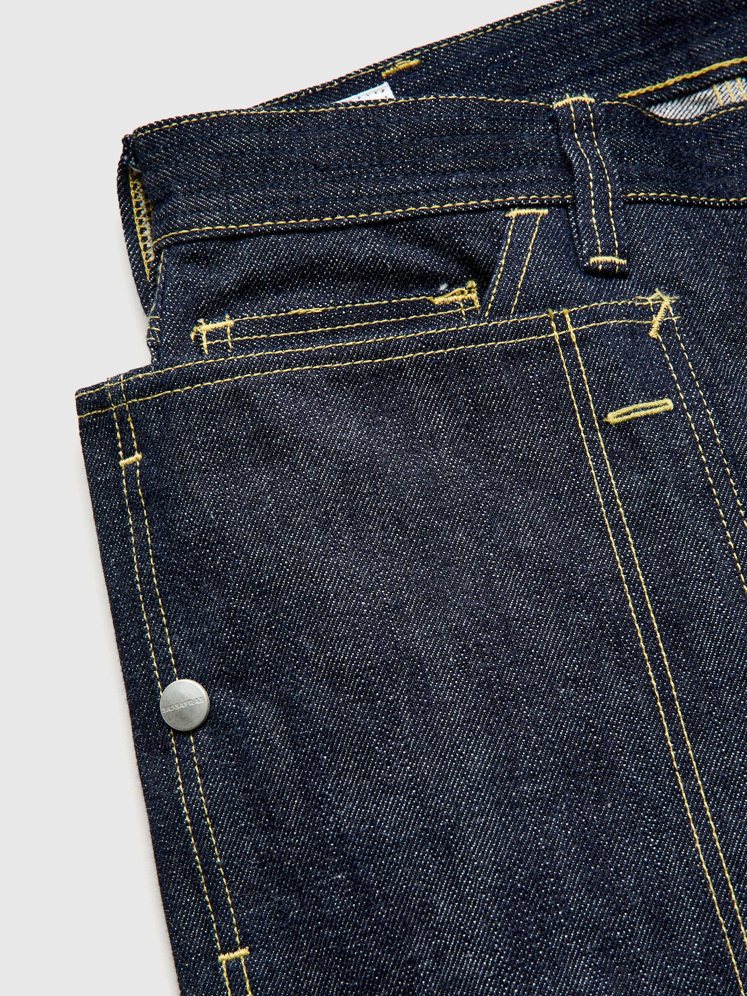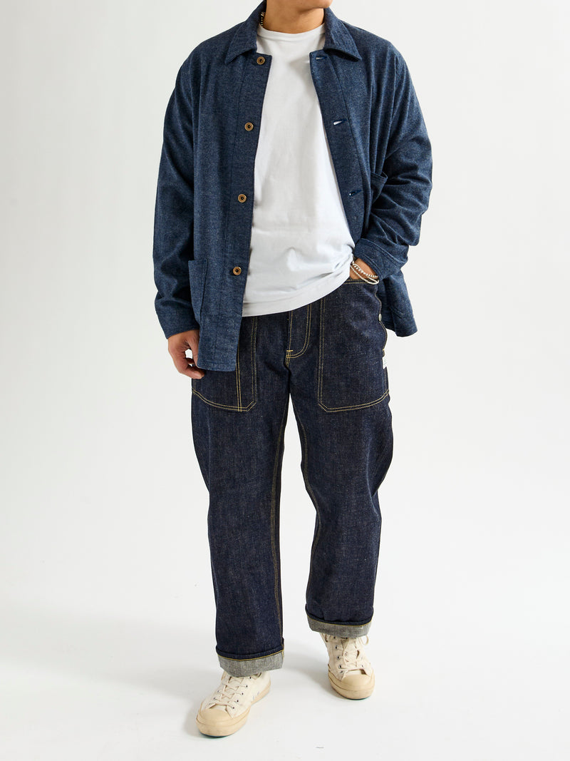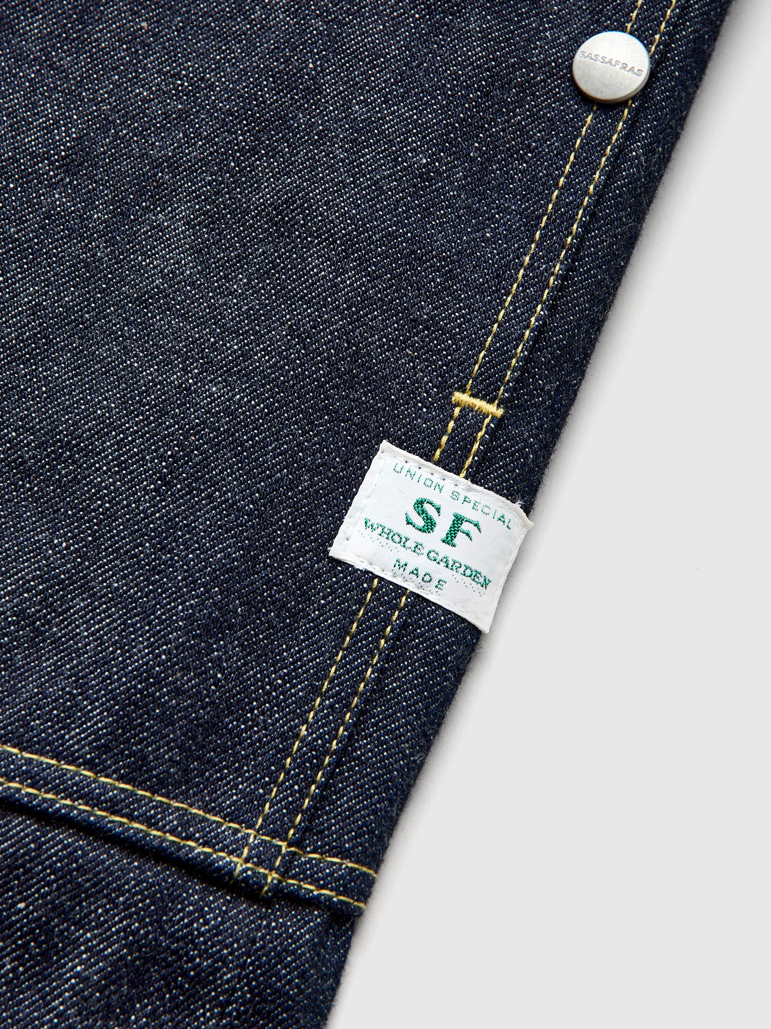 • The Fall Leaf R Stream Pants from Sassafras reinterpret gardening workwear with a multi-pocket design in a modified denim silhouette. Crafted in Japan using proprietary 14oz selvedge denim, these pants feature a deep indigo hue with a consistent slub texture and are equipped with nine pockets for storing everyday essentials and tools. Details include custom hardware, bartack reinforcement, and chainstitch construction, showcasing the brand’s signature blend of utility and craftsmanship.