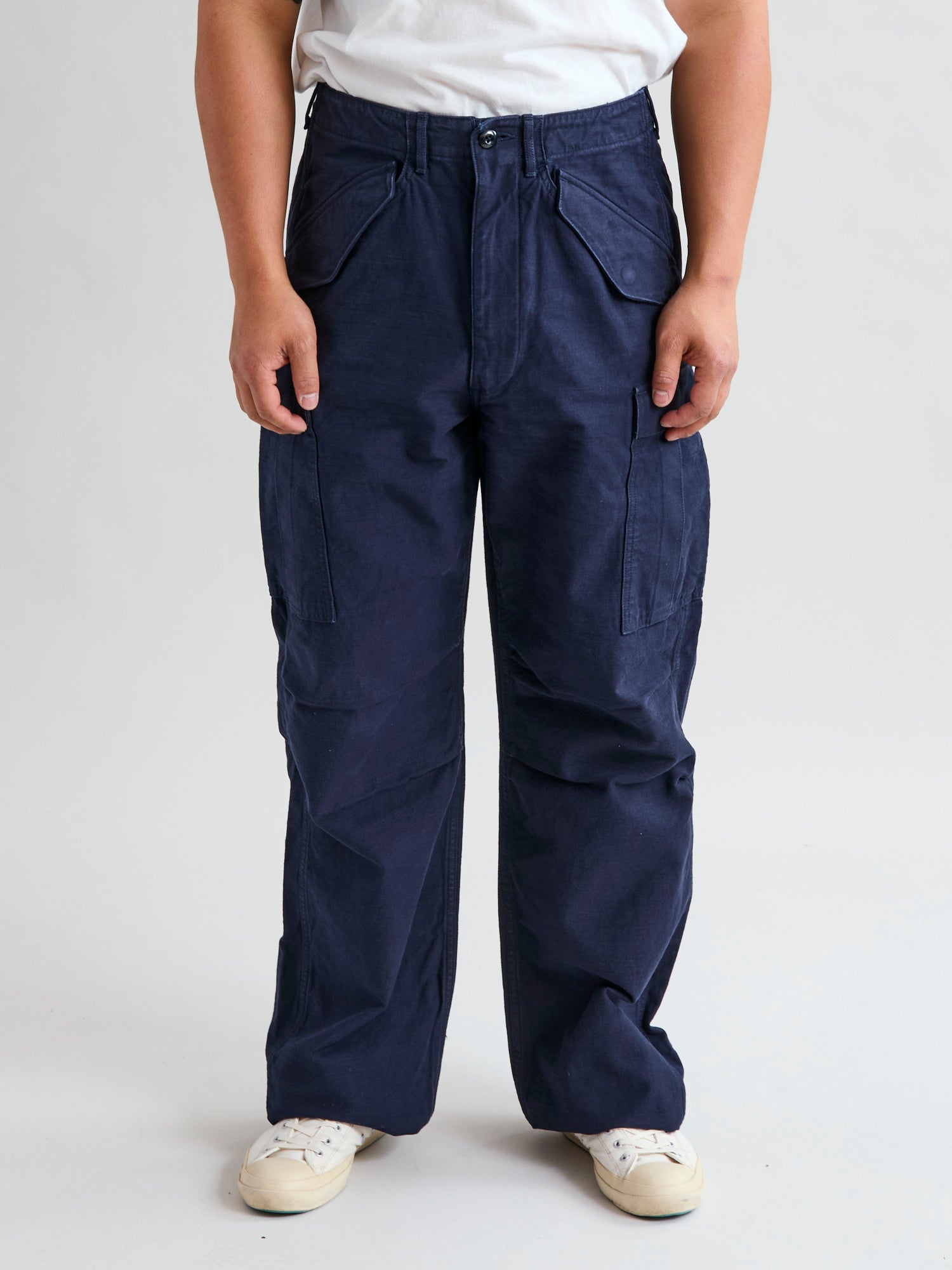 • Modeled after vintage military garments, these trousers from SDA are built using a sturdy canvas fabric. Cut in Studio D'Artisan's regular straight fit, the pants feature a simple design highlighting the pants construction. Dyed a deep indigo color, these pants will continue to fade and transform overtime developing a washed out patina similar to denim. Fitted with large snap pockets on the front and back, roomy cargo utility pockets, and a US-made zipper fly.