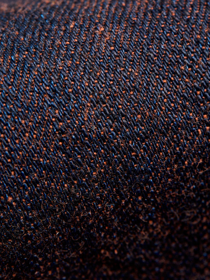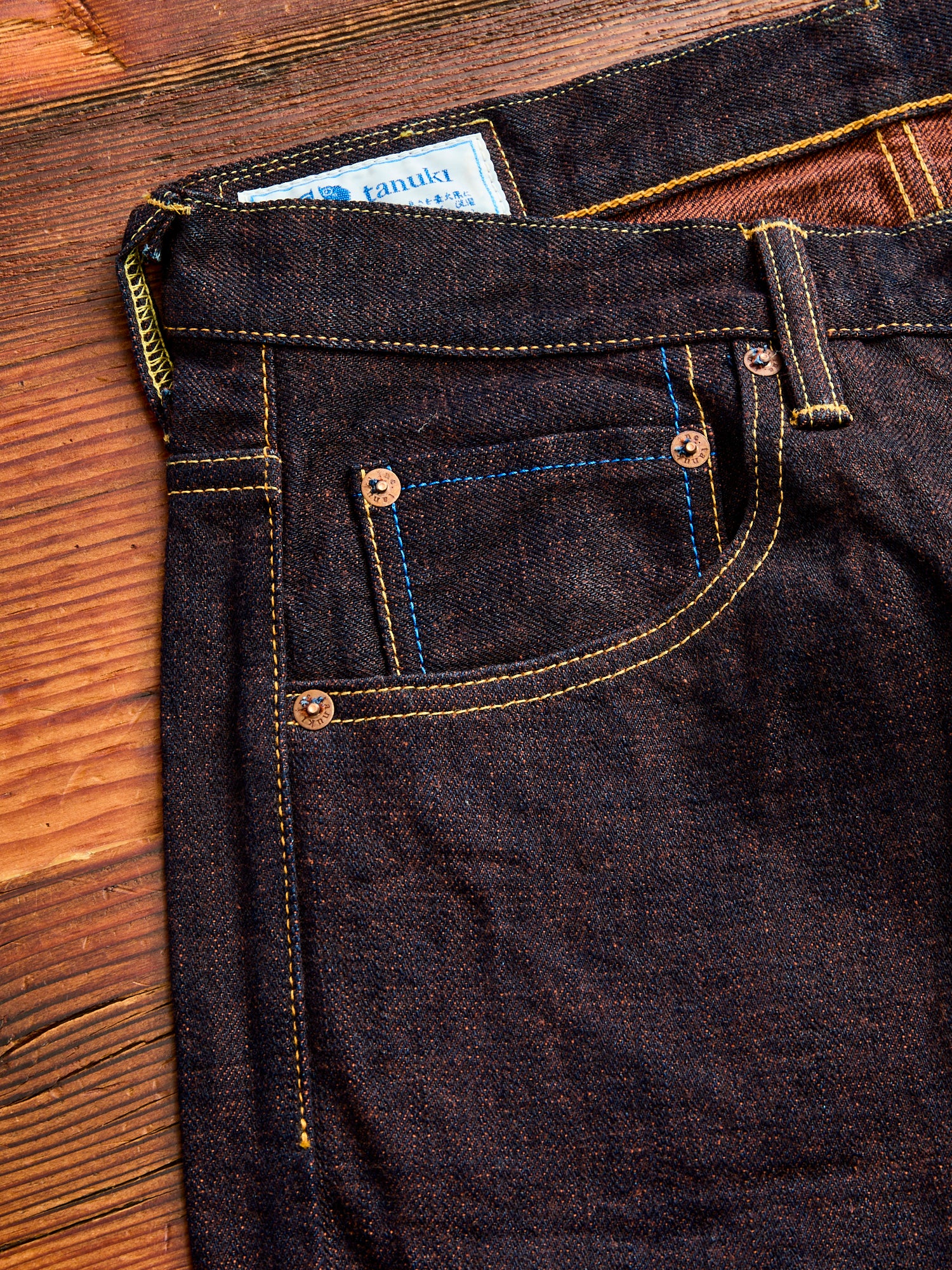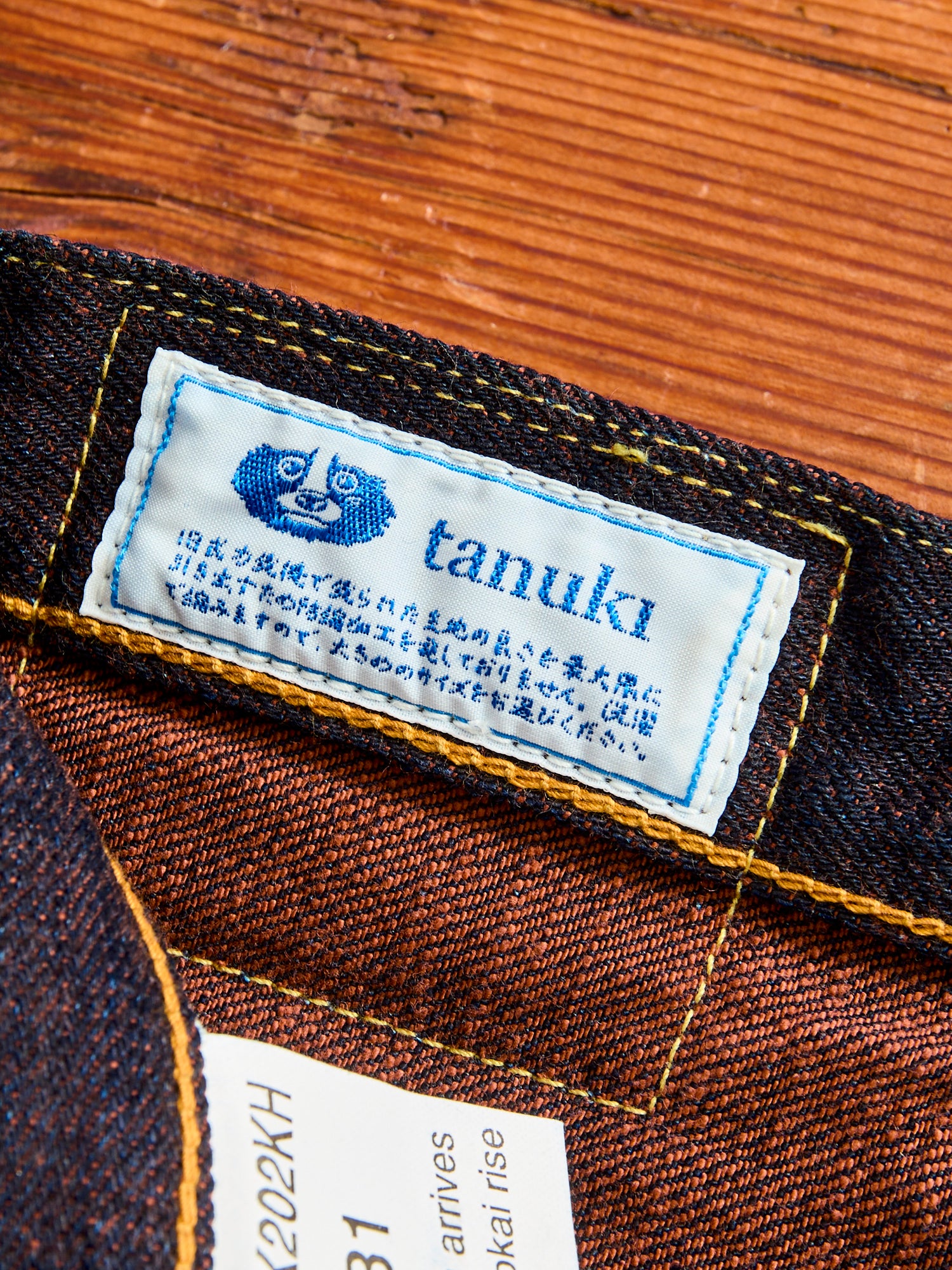 • One of Tanuki's most anticipated fabrics, the 14.5oz indigo-kakishibu denim blends traditional rope-dyed indigo with a kakishibu tannin dye process to produce a unique amber-indigo hue selvedge denim. Woven from a mix of Australian and U.S. short-staple cottons, the slubby texture brings the vibrant weft yarns to the surface. While most kakishibu dyes yield a muted tan, Tanuki has developed a rich tone reminiscent of persimmon skin. The result is a denim with bold contrast and visual depth. Finished with signature blue contrast stitching, custom hardware, and a branded leather patch.