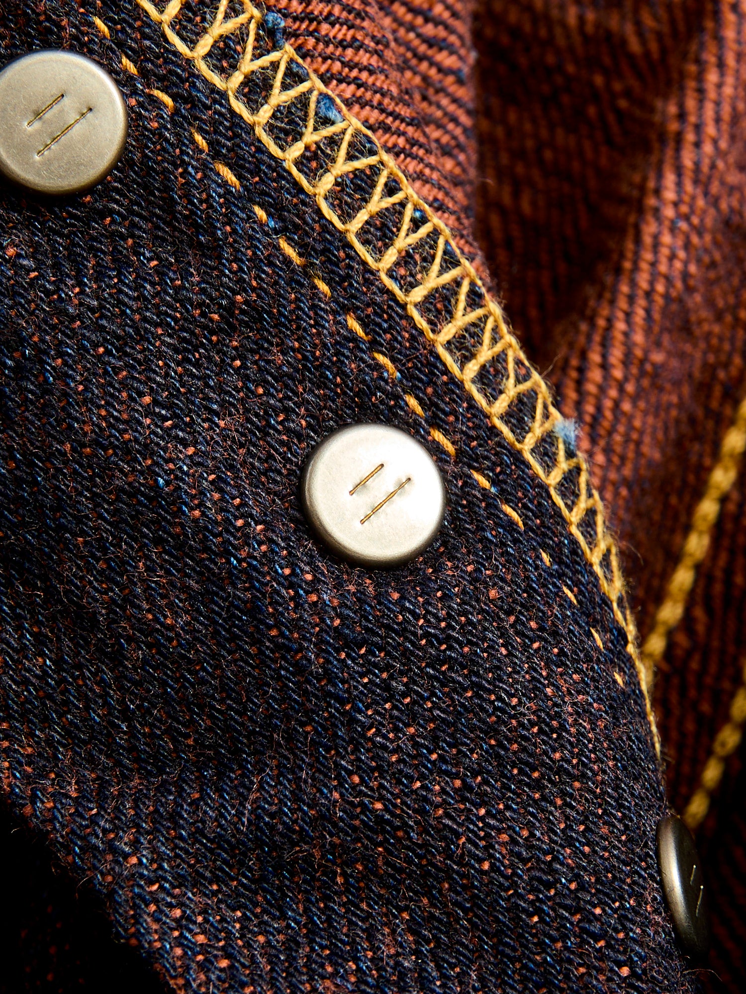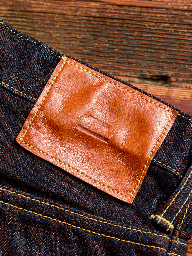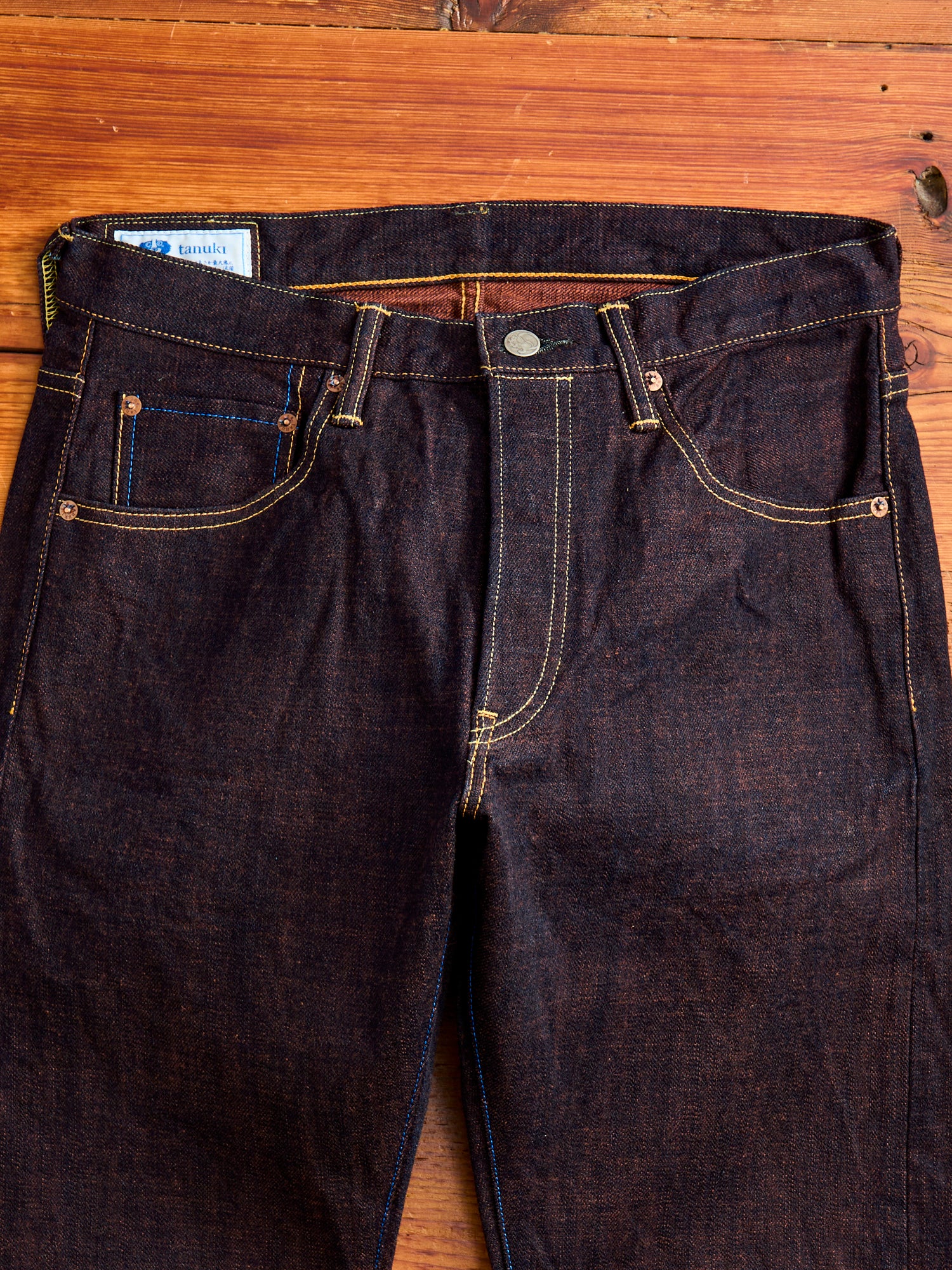• One of Tanuki's most anticipated fabrics, the 14.5oz indigo-kakishibu denim blends traditional rope-dyed indigo with a kakishibu tannin dye process to produce a unique amber-indigo hue selvedge denim. Woven from a mix of Australian and U.S. short-staple cottons, the slubby texture brings the vibrant weft yarns to the surface. While most kakishibu dyes yield a muted tan, Tanuki has developed a rich tone reminiscent of persimmon skin. The result is a denim with bold contrast and visual depth. Finished with signature blue contrast stitching, custom hardware, and a branded leather patch.