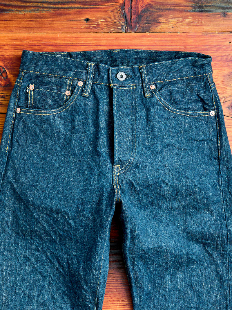 • Crafted in Okayama, ONI's Ishikawadai denim features yarn spun on the vintage "Ishikawadai" Japanese ring-spinning machine, the oldest of its kind, dating back to 1953. Compared to modern machines, the Ishikawadai spins at a much slower speed resulting in a low stress cotton fiber giving the fabric a natural, hand-spun appearance with subtle variations. Utilizing ONI's signature secret dye the fabric sports a greencast indigo accentuated with contrast stitching for an all around vintage look and feel. The jeans are cut in the Neat Straight fit, characterized by a roomy top block typical of straight-leg styles, and a pronounced taper from knee to hem, creating a distinctively "clean" look.