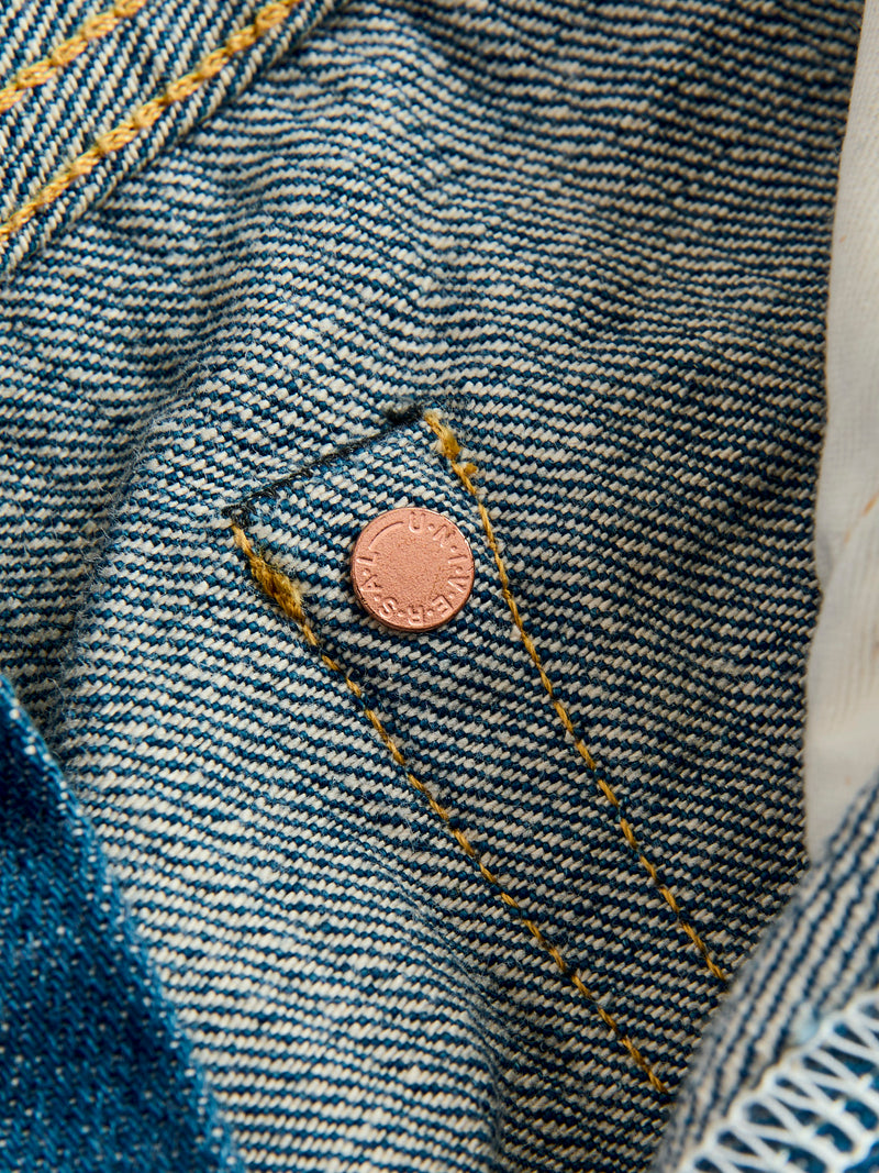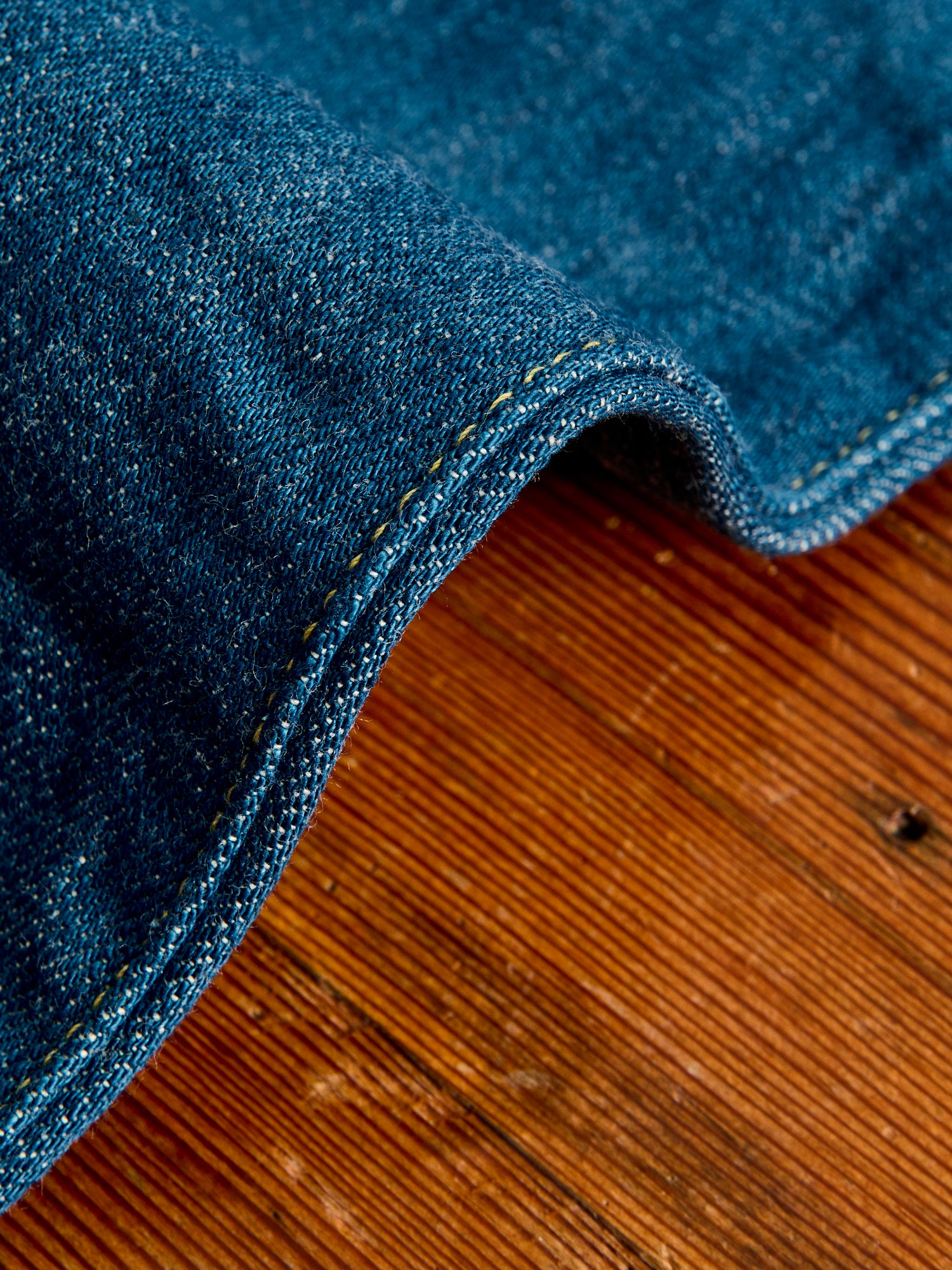 • The Old Fade Blue denim from ONI makes use of a unique blue-green warp yarn created by mixing light indigo with sulfur. The 13.7oz fabric features a loose weave and slight slub, which paired with a wash to remove starch and shrinkage results in a comfortable, easy-to-wear denim from day one. Finished with a classic ONI branded leather patch, branded buttons and rivets, and vintage two-tone contrast stitching.