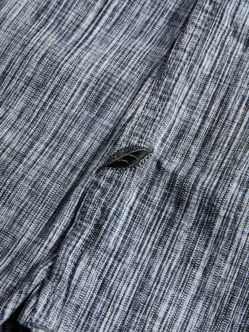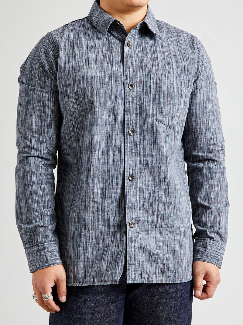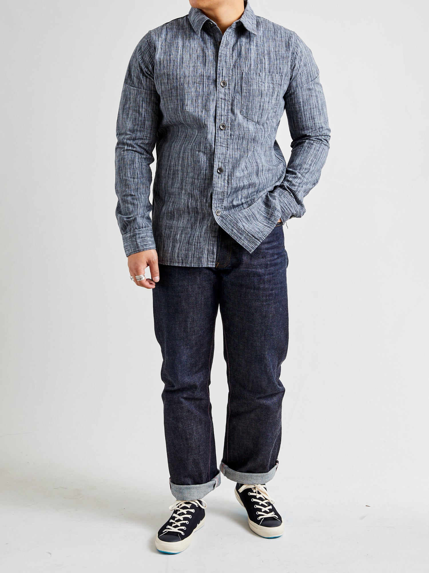 • This immaculately detailed work shirt from Pure Blue Japan blends elements of Americana with traditional Japanese dyeing techniques. The shirt is cut from a 6oz selvedge chambray fabric dyed using the traditional Japanese "kasuri" process which weaves a varied palette of black-dyed yarn in an irregular-abstract pattern. With wear, the shirt will fade to an irregular gray, highlighting the difference in color across the yarn. Fitted with a patch style chest pocket, chainstitch runoff, and the signature Pure Blue Japan indigofera leaf embroidery.
