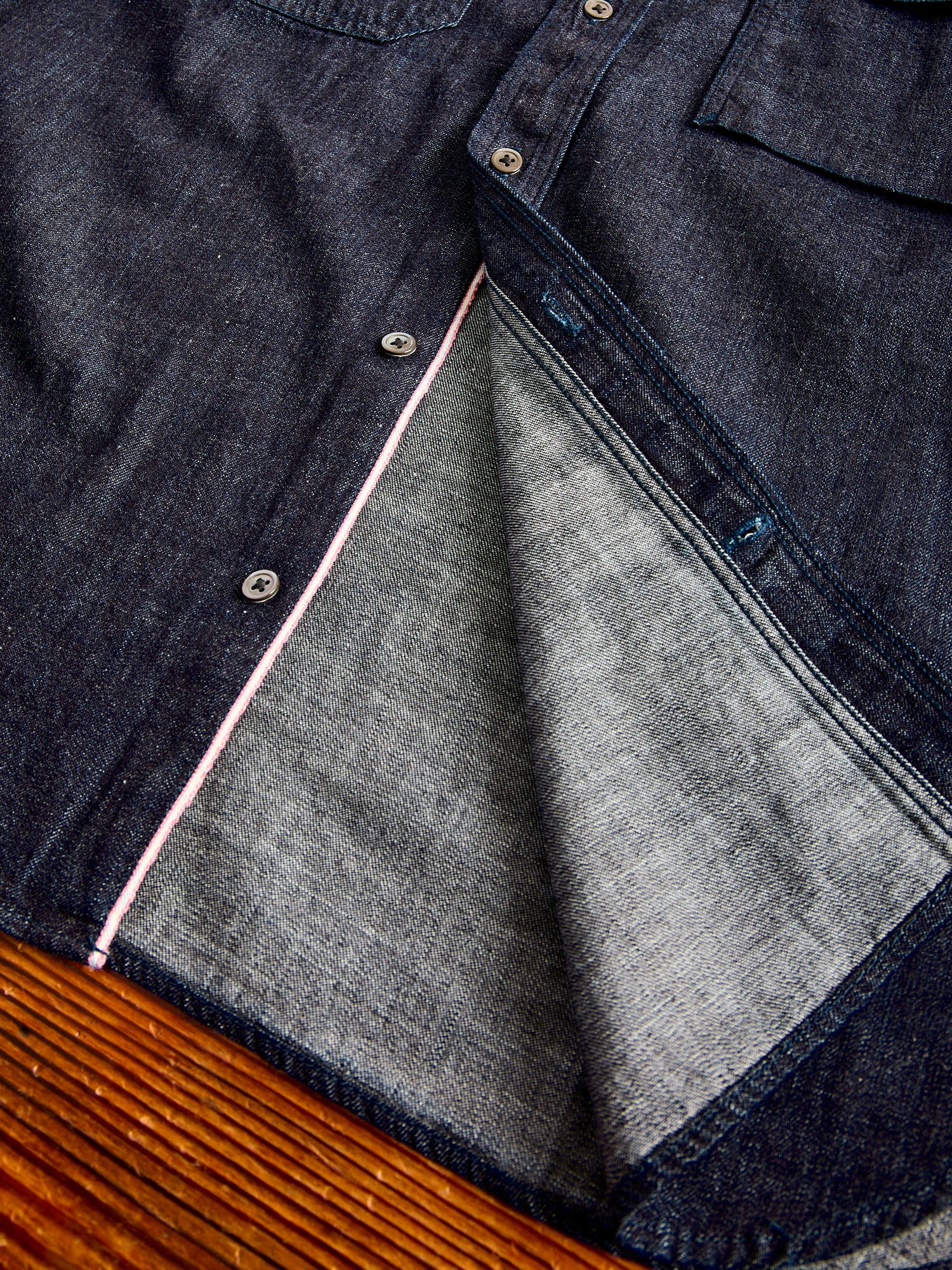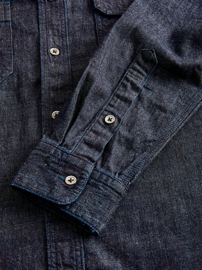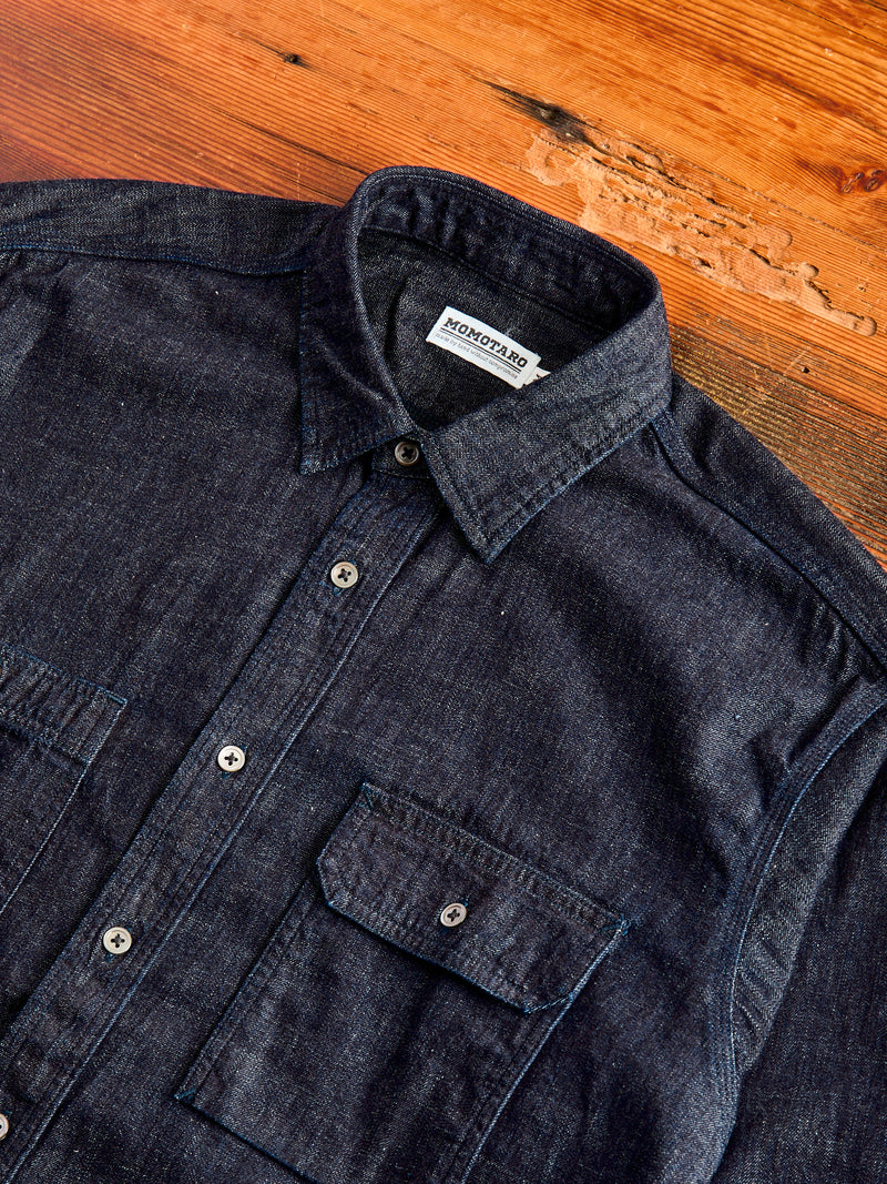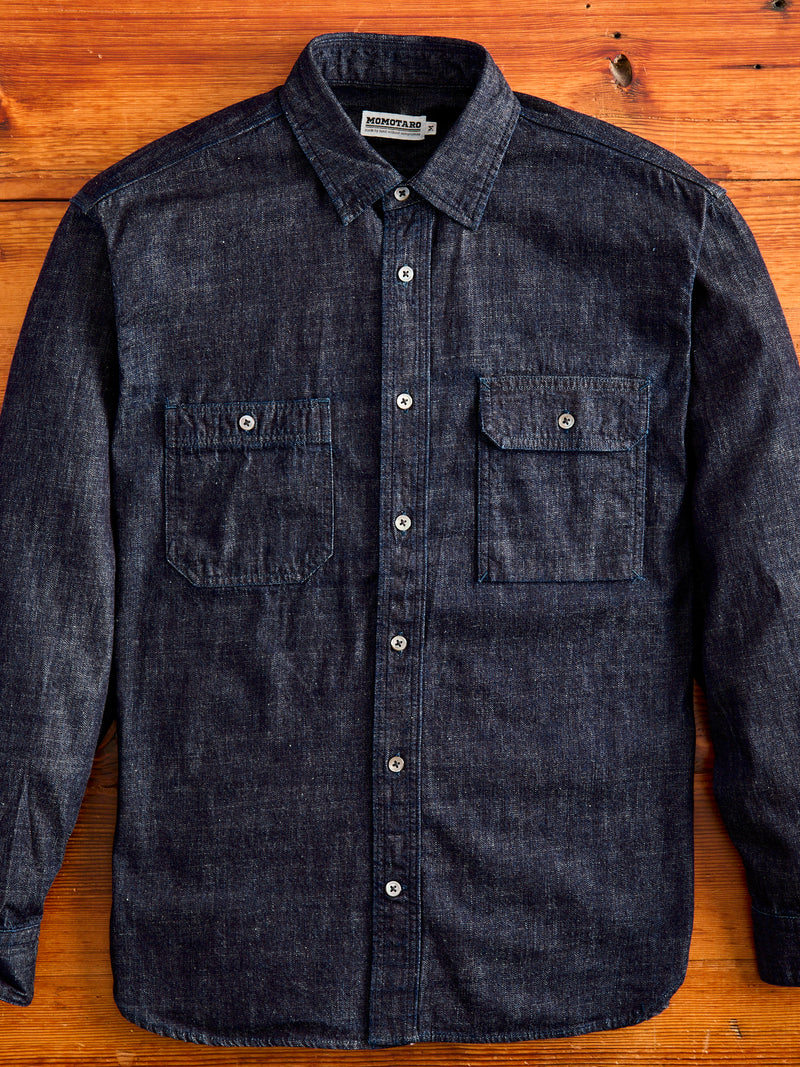 • Expertly made in Japan, this work shirt from Momotaro features an 8oz selvedge denim fabric with vintage-inspired detailing. Cut in a classic workshirt silhouette, the shirt comes fitted with mother of pearl buttons, pockets at the chest, chain-stitch runoff detailing at the gusset, and tonal stitched detailing throughout.